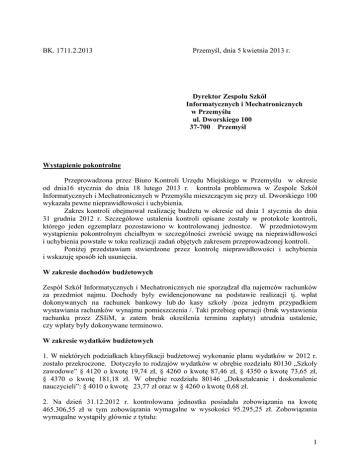 BK. 1711.2.2013 Przemyśl, dnia 5 kwietnia 2013 r. Dyrektor Zespołu Szkół Informatycznych i Mechatronicznych w Przemyślu ul. Dworskiego 100 37-700 Przemyśl Wystąpienie pokontrolne Przeprowadzona przez Biuro Kontroli Urzędu Miejskiego w Przemyślu w okresie od dnia16 stycznia do dnia 18 lutego 2013 r. kontrola problemowa w Zespole Szkół Informatycznych i Mechatronicznych w Przemyślu mieszczącym się przy ul. Dworskiego 100 wykazała pewne nieprawidłowości i uchybienia. Zakres kontroli obejmował realizację budŜetu w okresie od dnia 1 stycznia do dnia 31 grudnia 2012 r. Szczegółowe ustalenia kontroli opisane zostały w protokole kontroli, którego jeden egzemplarz pozostawiono w kontrolowanej jednostce. W przedmiotowym wystąpieniu pokontrolnym chciałbym w szczególności zwrócić uwagę na nieprawidłowości i uchybienia powstałe w toku realizacji zadań objętych zakresem przeprowadzonej kontroli. PoniŜej przedstawiam stwierdzone przez kontrolę nieprawidłowości i uchybienia i wskazuję sposób ich usunięcia. W zakresie dochodów budŜetowych Zespół Szkół Informatycznych i Mechatronicznych nie sporządzał dla najemców rachunków za przedmiot najmu. Dochody były ewidencjonowane na podstawie realizacji tj. wpłat dokonywanych na rachunek bankowy lub do kasy szkoły /poza jednym przypadkiem wystawiania rachunków wynajmu pomieszczenia /. Taki przebieg operacji (brak wystawienia rachunku przez ZSIiM, a zatem brak określenia terminu zapłaty) utrudnia ustalenie, czy wpłaty były dokonywane terminowo. W zakresie wydatków budŜetowych 1. W niektórych podziałkach klasyfikacji budŜetowej wykonanie planu wydatków w 2012 r. zostało przekroczone. Dotyczyło to rodzajów wydatków w obrębie rozdziału 80130 „Szkoły zawodowe” § 4120 o kwotę 19,74 zł, § 4260 o kwotę 87,46 zł, § 4350 o kwotę 73,65 zł, § 4370 o kwotę 181,18 zł. W obrębie rozdziału 80146 „Dokształcanie i doskonalenie nauczycieli”: § 4010 o kwotę 23,77 zł oraz w § 4260 o kwotę 0,68 zł. 2. Na dzień 31.12.2012 r. kontrolowana jednostka posiadała zobowiązania na kwotę 465.306,55 zł w tym zobowiązania wymagalne w wysokości 95.295,25 zł. Zobowiązania wymagalne wystąpiły głównie z tytułu: 1 1) wynagrodzeń osobowych (§ 4010 rozdz. 80130 i 80146) - 68.598,95 zł, 2) składek na ubezpieczenie społeczne (§ 4110 rozdz. 80130 i 80146) - 22.657,84 zł, 3) składek na Fundusz Pracy (§ 4120 rozdz. 80130 i 80146) - 3.051,46 zł, 4) odsetki od zaległości - 987,00 zł. 3. Kontrola terminowości regulowania składek na ubezpieczenie społeczne, ubezpieczenie zdrowotne i Fundusz Pracy wykazała, Ŝe za miesiąc marzec i listopad 2012 r. wymienione zobowiązania zostały uregulowane nieterminowo lub nie w pełnej wysokości. Szczegółowe naliczenie i odprowadzenie składek za poszczególne miesiące 2012 r. przedstawione zostało w załączniku do protokołu kontroli. Ponadto, w miesiącu październiku i listopadzie jednostka nieterminowo regulowała zobowiązania wobec Urzędu Skarbowego z tytułu podatku dochodowego od osób fizycznych. Sytuacja nieterminowego regulowania zobowiązań wobec ZUS i US spowodowała naliczenie odsetek w łącznej wysokości 1.249,00 zł. Oprócz odsetek z tytułu pozostałych podatków i opłat jednostka naliczyła w koszty i ujęła w księgach rachunkowych odsetki w kwocie 84,00 zł z tytułu nieterminowego regulowania zobowiązań wobec kontrahentów. 4. Kontrola obliczenia odsetek za zwłokę wykazała, Ŝe kwota naliczonych odsetek od zaległości podatkowych (US) i składek ZUS była inna niŜ wynika z prawidłowego obliczenia. Kwota naliczonych odsetek na dzień 31.12.2012 r. od zaległości podatkowych winna wynosić 288,00 zł (naliczono 242,00), zatem naliczono odsetki w kwocie zaniŜonej o 46,00 zł. ZSIiM naliczył na dzień 31.12.2012 r. odsetki za zwłokę w opłaceniu składek na ubezpieczenie społeczne za miesiąc listopad 2012 r. w wysokości 489,00 zł, zatem naliczono odsetki w kwocie zawyŜonej o 39,13 zł. Na dzień 31.12.2012 r. odsetki za zwłokę w opłaceniu składek na ubezpieczenie zdrowotne za listopad 2012 r. naliczone zostały w wysokości 141,00 zł, zatem naliczono odsetki w kwocie zawyŜonej o 11,23 zł. Ponadto, naliczone przez szkołę na dzień 31.12.2012 r. odsetki za zwłokę w opłaceniu składek na Fundusz Pracy za listopad 2012 r. w wysokości 31,00 zł, były naliczone w kwocie zawyŜonej o 1,66 zł. Wykazane w sprawozdaniu budŜetowym Rb-28S za okres od początku roku do 31.12.2012 r. dane dotyczące odsetek paragraf 4570 zobowiązania ogółem w tym wymagalne kwota 903,00 były zgodne z prowadzona w jednostce ewidencją księgową. Natomiast prawidłowo naliczone na dzień 31.12.2012 r. odsetki od zaległości wobec ZUS i US winny stanowić kwotę 896,98zł i w takiej wysokości powinny być wykazane zarówno w ewidencji księgowej i sprawozdawczości budŜetowej. 5. Brak niezbędnego poziomu środków na rachunku bankowym dotyczącym wydatków budŜetowych ZSIiM spowodował, Ŝe w celu uniknięcia naruszenia dyscypliny finansów publicznych kontrolowana jednostka dokonywała operacji niezgodnych z przepisami prawa, polegających na „poŜyczaniu” środków z rachunku bankowego wyodrębnionego dla celów gromadzenia środków Zakładowego Funduszu Świadczeń Socjalnych. Środki ZFŚS były przelewane z tego rachunku bankowego na rachunek wydatków budŜetowych w celu uregulowania zobowiązań jednostki budŜetowej wobec pracowników z tytułu wydatków na wynagrodzenia za pracę, zobowiązań wobec ZUS z tytułu składek na ubezpieczenie społeczne, zdrowotne, Fundusz Pracy a takŜe w stosunku do Urzędu Skarbowego z tytułu zaliczek na podatek dochodowy od osób fizycznych. 6. Operacje „poŜyczania” środków ZFŚS z wyodrębnionego na ten cel rachunku bankowego na rachunek bankowy przeznaczony do realizacji wydatków budŜetowych były niewłaściwie ewidencjonowane za pośrednictwem 