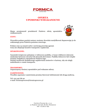 OFERTA UPOMINKI WIELKANOCNE Mamy przyjemność przedstawić Państwu ofertę upominków wielkanocnych. CENY: Wszystkie podane poniżej zestawy możemy dowolnie modyfikować dopasowując je do wskazanego przez Państwa poziomu cenowego. Podane ceny są cenami netto i zawierają prowizję agencji. Cena nie obejmuje kosztów transportu i opakowań. OPAKOWANIE: Upominki świąteczne pakujemy w tekturowe pudełka, w kosze wiklinowe (skrzynie zamknięte lub kosze otwarte) lub skrzynki drewniane. Pudełka tekturowe lub wstążki możemy dodatkowo obrandować Państwa logo. Istnieje możliwość dodatkowego zapakowania zestawów w kartony, aby nie uległy uszkodzeniu w czasie transportu. TRANSPORT: Organizujemy dostawy upominków pod wskazane adresy. ZAMÓWIENIE: Wszelkie zapytania i zamówienia prosimy kierować telefonicznie lub drogą mailową. Tel: 022 497 86 90 e-mail: [email protected] Formica Procreo Sp. z o.o. ul. Rozbrat 10/14/3, 00-451 Warszawa NIP 113-24-61-425 Zestaw nr. 1 Kieliszek na jajko, spodek na skorupki i stalowa łyżeczka. Zestaw nr. 2 Talerzyk, miska śniadaniowa oraz kieliszek do jajek. Zestaw nr. 3 Solniczka i pieprzniczka. Świecznik duży kula żółto-różowa Świecznik mały kula zielono-różowa Krajalnica do jajek długość: 11 cm Formica Procreo Sp. z o.o. ul. Rozbrat 10/14/3, 00-451 Warszawa NIP 113-24-61-425 Minutnik wysokość: 9 cm Łyżeczka do jajek Farbki wielkanocne 5 farbek w płynie, zółty, czerwony, fioletowy, niebieski, zielony, 5 pojemników Jajo Zegar może pełnić funkcję podręcznego budzika, gadżetu biurkowego lub stylowego minutnika kuchennego Formica Procreo Sp. z o.o. ul. Rozbrat 10/14/3, 00-451 Warszawa NIP 113-24-61-425 Jaja relaksacyjne Wykonane ze specjalnego silikonu roztaczają nastrojowa poświatę zmieniając przy tym kolory. Zmiana światła jest stopniowa i powtarza się w cyklu: czerwony, zielony, niebieski wraz z kolorami pośrednimi, co zapewnia łagodną zmianę barwy. Formica Procreo Sp. z o.o. ul. Rozbrat 10/14/3, 00-451 Warszawa NIP 113-24-61-425