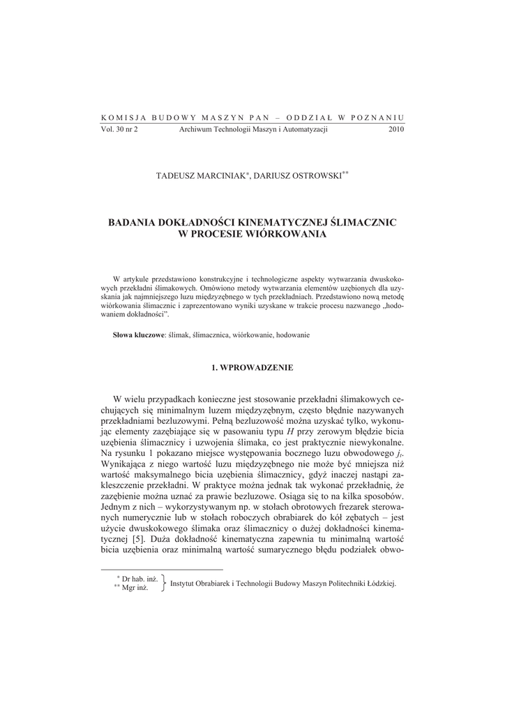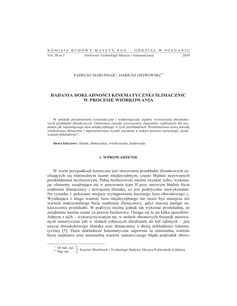 KOMISJA BUDOWY MASZYN PAN – ODDZIAà W POZNANIU Vol. 30 nr 2 Archiwum Technologii Maszyn i Automatyzacji 2010 TADEUSZ MARCINIAK∗, DARIUSZ OSTROWSKI∗∗ BADANIA DOKàADNOĝCI KINEMATYCZNEJ ĝLIMACZNIC W PROCESIE WIÓRKOWANIA W artykule przedstawiono konstrukcyjne i technologiczne aspekty wytwarzania dwuskokowych przekáadni Ğlimakowych. Omówiono metody wytwarzania elementów uzĊbionych dla uzyskania jak najmniejszego luzu miĊdzyzĊbnego w tych przekáadniach. Przedstawiono nową metodĊ wiórkowania Ğlimacznic i zaprezentowano wyniki uzyskane w trakcie procesu nazwanego „hodowaniem dokáadnoĞci”. Sáowa kluczowe: Ğlimak, Ğlimacznica, wiórkowanie, hodowanie 1. WPROWADZENIE W wielu przypadkach konieczne jest stosowanie przekáadni Ğlimakowych cechujących siĊ minimalnym luzem miĊdzyzĊbnym, czĊsto báĊdnie nazywanych przekáadniami bezluzowymi. Peáną bezluzowoĞü moĪna uzyskaü tylko, wykonując elementy zazĊbiające siĊ w pasowaniu typu H przy zerowym báĊdzie bicia uzĊbienia Ğlimacznicy i uzwojenia Ğlimaka, co jest praktycznie niewykonalne. Na rysunku 1 pokazano miejsce wystĊpowania bocznego luzu obwodowego jt. Wynikająca z niego wartoĞü luzu miĊdzyzĊbnego nie moĪe byü mniejsza niĪ wartoĞü maksymalnego bicia uzĊbienia Ğlimacznicy, gdyĪ inaczej nastąpi zakleszczenie przekáadni. W praktyce moĪna jednak tak wykonaü przekáadniĊ, Īe zazĊbienie moĪna uznaü za prawie bezluzowe. Osiąga siĊ to na kilka sposobów. Jednym z nich – wykorzystywanym np. w stoáach obrotowych frezarek sterowanych numerycznie lub w stoáach roboczych obrabiarek do kóá zĊbatych – jest uĪycie dwuskokowego Ğlimaka oraz Ğlimacznicy o duĪej dokáadnoĞci kinematycznej [5]. DuĪa dokáadnoĞü kinematyczna zapewnia tu minimalną wartoĞü bicia uzĊbienia oraz minimalną wartoĞü sumarycznego báĊdu podziaáek obwo∗ ∗∗ Dr hab. inĪ. Mgr inĪ. Instytut Obrabiarek i Technologii Budowy Maszyn Politechniki àódzkiej. 20 T. Marciniak, D. Ostrowski dowych Ğlimacznicy, a dwuskokowy Ğlimak pozwala kasowaü luz miĊdzyzĊbny do dopuszczalnej wartoĞci. Rys. 1. Boczny luz obwodowy jt w zazĊbieniu Fig. 1. Circumferential lateral backlash jt in mesh Rys. 2. ĝlimak dwuskokowy Fig. 2. Doublepitch worm ĝlimak dwuskokowy charakteryzuje siĊ róĪnymi skokami obu stron zwoju, jak to pokazano na rys. 2. RóĪnica skoków (p1 i p2) powoduje, Īe gruboĞü zwoju (s1÷sn) Ğlimaka zmienia siĊ na jego dáugoĞci. Gdy podziaáka p2 bĊdzie wiĊksza od podziaáki p1, to gruboĞü zwoju Ğlimaka bĊdzie siĊ zmieniaü od s1< s2 < s3 do sn. W praktyce róĪnice skoków powinny wynosiü okoáo 2 – 3%. Po zamontowaniu takiego Ğlimaka w przekáadni musi byü moĪliwa regulacja jego przesuwu wzdáuĪ osi. Wprowadzanie coraz grubszego zwoju Ğlimaka w zazĊbienie moĪe wiĊc doprowadziü do sytuacji, w której dalszy przesuw nie bĊdzie moĪliwy. Osiąga siĊ wtedy stan bezluzowoĞci. O tym, czy praca w takiej sytuacji jest moĪliwa, decydują báĊdy wykonawcze obu uzĊbionych elementów, a ĞciĞlej mówiąc, wczeĞniej wspomniana dokáadnoĞü kinematyczna. Parametr ten okreĞla siĊ za pomocą maksymalnej wartoĞci odchyáki przeáoĪenia w zakresie jednego obrotu Ğlimacznicy. Wynika on gáównie z báĊdu podziaáek obwodowych oraz bicia uzĊbienia Ğlimacznicy. Jednym ze sposobów (na pewno najdoskonalszym) okreĞlenia tej dokáadnoĞci jest uĪycie przyrządów opartych na przetwornikach analogowo-cyfrowych, wyznaczających bezpoĞrednio báąd przeáoĪenia w wartoĞci kątowej. W najlepszych przekáadniach báąd ten nie moĪe przekraczaü 10” kątowych w zakresie jednego obrotu Ğlimacznicy. Mniej precyzyjnie, ale równieĪ w zadowalający sposób, moĪna okreĞliü dokáadnoĞü kinematyczną na podstawie pomiaru podziaáek obwodowych uzĊbienia Ğlimacznicy. WielkoĞcią charakteryzującą dokáadnoĞü kinematyczną bĊdzie w tym przypadku maksymalna wartoĞü sumarycznego báĊdu k podziaáek, przy czym za k naleĪy przyjąü liczbĊ zĊbów Ğlimacznicy z2. Przeliczenia wartoĞci báĊdu k podziaáek na báąd kinematyczny į (wyraĪony w wartoĞci kątowej) moĪna dokonaü za pomocą wzoru: Badanie dokáadnoĞci kinematycznej Ğlimacznic w procesie wiórkowania ª º », «¬ (m ⋅ z2 ) / 2 »¼ δ = arctg« f pk 21 (1) gdzie: fpk – maksymalna wartoĞü sumarycznego báĊdu k = z2 podziaáek obwodowych [mm], m – moduá osiowy zazĊbienia [mm]. 2. TECHNOLOGIA ĝLIMAKA DWUSKOKOWEGO ĝlimaki dwuskokowe najczĊĞciej są wykonywane jako jednozwojne, choü ze wzglĊdu na sprawnoĞü przekáadni moĪliwe jest uĪycie Ğlimaka dwuzwojnego. NaleĪy zauwaĪyü, Īe druga strona zwoju, mająca inny skok, ma równieĪ inny moduá i kąt wzniosu linii Ğrubowej. Są to jednak nieznaczne róĪnice, które nie wpáywają na poprawnoĞü wspóápracy zazĊbienia. Na przykáad, dla Ğrednicy podziaáowej Ğlimaka df1 = 30 mm i m = 2 mm przy zalecanej 3-procentowej róĪnicy skoku (p1 = 6,283 mm i p2 = 6,094 mm) kąt wzniosu linii Ğrubowej na walcu podziaáowym obu stron zwoju róĪni siĊ tylko o 6’. WstĊpnie uzwojenie takiego Ğlimaka nacina siĊ najczĊĞciej na frezarce uniwersalnej z uĪyciem podzielnicy z gitarą, nie róĪnicując skoków. Po wymaganej obróbce cieplnej Ğlimak jest szlifowany na szlifierce do gwintów ze zróĪnicowaniem skoków za pomocą odpowiednio dobranych kóá zmianowych. Niektóre szlifierki mają mechanizm korektora skoku. Na frezarce zwój Ğlimaka wykonuje siĊ nieco grubszy niĪ przewidywana maksymalna gruboĞü koĔcowa. Jedną stronĊ zwoju szlifuje siĊ, ustawiając koáa zmianowe dla skoku wynikającego z podstawowego moduáu przekáadni, natomiast drugą – zmieniając na korektorze skoku szlifierki wartoĞü skoku odpowiadającą obliczonemu skokowi. W rezultacie otrzymuje siĊ Ğlimak dwuskokowy. Rys. 3. ĝlimak dwuskokowy wykonany w technologii Ğlimaka stoĪkowego Fig. 3. Doublepitch worm created in cone worm tec