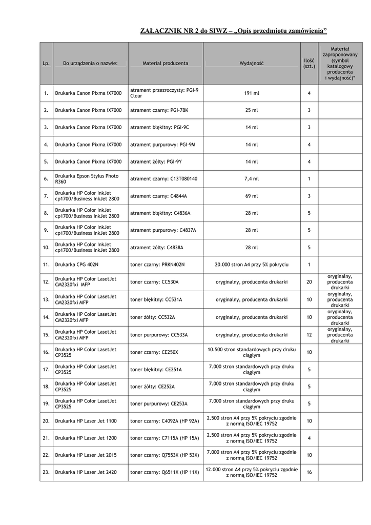 ZAŁĄCZNIK NR 2 do SIWZ – „Opis przedmiotu zamówienia” Lp. Do urządzenia o nazwie: Materiał producenta Wydajność Ilość (szt.) 1. Drukarka Canon Pixma iX7000 atrament przezroczysty: PGI-9 Clear 191 ml 4 2. Drukarka Canon Pixma iX7000 atrament czarny: PGI-7BK 25 ml 3 3. Drukarka Canon Pixma iX7000 atrament błękitny: PGI-9C 14 ml 3 4. Drukarka Canon Pixma iX7000 atrament purpurowy: PGI-9M 14 ml 4 5. Drukarka Canon Pixma iX7000 atrament żółty: PGI-9Y 14 ml 4 6. Drukarka Epson Stylus Photo R360 atrament czarny: C13T080140 7,4 ml 1 7. Drukarka HP Color InkJet cp1700/Business InkJet 2800 atrament czarny: C4844A 69 ml 3 8. Drukarka HP Color InkJet cp1700/Business InkJet 2800 atrament błękitny: C4836A 28 ml 5 9. Drukarka HP Color InkJet cp1700/Business InkJet 2800 atrament purpurowy: C4837A 28 ml 5 10. Drukarka HP Color InkJet cp1700/Business InkJet 2800 atrament żółty: C4838A 28 ml 5 11. Drukarka CPG 402N toner czarny: PRKN402N 20.000 stron A4 przy 5% pokryciu 1 12. Drukarka HP Color LasetJet CM2320fxi MFP toner czarny: CC530A oryginalny, producenta drukarki 20 13. Drukarka HP Color LasetJet CM2320fxi MFP toner błękitny: CC531A oryginalny, producenta drukarki 10 14. Drukarka HP Color LasetJet CM2320fxi MFP toner żółty: CC532A oryginalny, producenta drukarki 10 15. Drukarka HP Color LasetJet CM2320fxi MFP toner purpurowy: CC533A oryginalny, producenta drukarki 12 16. Drukarka HP Color LasetJet CP3525 toner czarny: CE250X 10.500 stron standardowych przy druku ciągłym 10 17. Drukarka HP Color LasetJet CP3525 toner błękitny: CE251A 7.000 stron standardowych przy druku ciągłym 5 18. Drukarka HP Color LasetJet CP3525 toner żółty: CE252A 7.000 stron standardowych przy druku ciągłym 5 19. Drukarka HP Color LasetJet CP3525 toner purpurowy: CE253A 7.000 stron standardowych przy druku ciągłym 5 20. Drukarka HP Laser Jet 1100 toner czarny: C4092A (HP 92A) 2.500 stron A4 przy 5% pokryciu zgodnie z normą ISO/IEC 19752 10 21. Drukarka HP Laser Jet 1200 toner czarny: C7115A (HP 15A) 2.500 stron A4 przy 5% pokryciu zgodnie z normą ISO/IEC 19752 4 22. Drukarka HP Laser Jet 2015 toner czarny: Q7553X (HP 53X) 7.000 stron A4 przy 5% pokryciu zgodnie z normą ISO/IEC 19752 10 23. Drukarka HP Laser Jet 2420 toner czarny: Q6511X (HP 11X) 12.000 stron A4 przy 5% pokryciu zgodnie z normą ISO/IEC 19752 16 Materiał zaproponowany (symbol katalogowy producenta i wydajność)* oryginalny, producenta drukarki oryginalny, producenta drukarki oryginalny, producenta drukarki oryginalny, producenta drukarki 24. Drukarka HP Laser Jet 3052 toner czarny: Q2612A (HP 12A) 2.000 stron A4 przy 5% pokryciu zgodnie z normą ISO/IEC 19752 20 25. Drukarka HP Laser Jet 4350 dtn toner czarny: Q5942XD (HP 42X Dual Pack) 2 x 20.000 stron standardowych przy 5% pokryciu zgodnie z normą ISO/IEC 19752 1 26. Drukarka HP Laser Jet 6P toner czarny: C3903A (HP 03A) 4.000 stron A4 przy 5% pokryciu zgodnie z normą ISO/IEC 19752 1 27. Drukarka Lexmark E120 toner czarny: 12016SE 2.000 stron A4 przy 5% pokryciu 1 28. Drukarka Lexmark E250dn toner czarny: 0E250A11E oryginalny, producenta drukarki 7 29. Drukarka Lexmark E250dn bęben: E250X22G 30.000 stron A4 przy drukowaniu ciągłym 2 30. Drukarka Lexmark E260d toner czarny: E260A11E 3.500 stron A4 przy 5% pokryciu zgodnie z normą ISO/IEC 19752 6 31. Drukarka OKI 390FB taśma barwiąca czarna: 09002310 2 mln znaków 20 32. Drukarka OKI OKIPAGE 20 series toner czarny: 41022502 6.000 stron A4 przy 5% pokryciu 5 33. Drukarka OKI B410d/B430d toner czarny: 43979102 3.500 stron A4 przy 5% pokryciu 1 34. Drukarka OKI B430d toner czarny: 43979207 10.000 stron A4 przy 5% pokryciu 2 35. Drukarka OKI B410d/B430d bęben: 43979002 25.000 stron A4 przy drukowaniu ciągłym 2 36. Drukarka OKI B4350n toner czarny: 01101202 6.000 stron A4 przy 5% pokryciu 12 37. Drukarka OKI B4350n bęben: 42102802 25.000 stron A4 przy drukowaniu ciągłym 6 38. Drukarka OKI B4545 MFP toner czarny: 9004169 12.000 stron A4 przy 5% pokryciu 10 39. Drukarka OKI B4545 MFP bęben: 09004170 20.000 stron A4 przy drukowaniu ciągłym 3 40. Drukarka OKI B6300 toner czarny: 09004079 17.000 stron A4 przy 5% pokryciu zgodnie z normą ISO/IEC 19752 1 41. Drukarka OKI C3200 toner czarny: 42804540 3.000 stron A4 przy 5% pokryciu 4 42. Drukarka OKI C3200 bęben czarny: 42126665 14.000 stron A4 przy drukowaniu ciągłym 2 43. Drukarka OKI C5540 MFP toner CMYK Rainbow Kit: 42403006 4 x 5.000 stron A4 przy 5% pokryciu 10 44. Drukarka OKI C5540 MFP toner czarny: 42127457 5.000 stron A4 przy 5% pokryciu 10 45. Drukarka OKI C5540 MFP bęben żółty: 42126670 17.000 stron A4 przy drukowaniu ciągłym 6 46. Drukarka OKI C5540 MFP bęben purpurowy: 42126671 17.000 stron A4 przy drukowaniu ciągłym 6 47. Drukarka OKI C5540 MFP bęben błękitny: 42126672 17.000 stron A4 przy drukowaniu ciągłym 6 48. Drukarka OKI C5540 MFP bęben czarny: 42126673 17.000 stron A4 przy drukowaniu ciągłym 8 49. Drukarka OKI C5100N/C5400N toner CMYK Rainbow Kit: 42403002 4 x 5.000 stron A4 przy 5% pokryciu 1 50. Drukarka OKI C5100N/C5400N toner czarny: 42127408 5.000 stron A4 przy 5% pokryciu 1 oryginalny, producenta drukarki 51. Drukarka OKI C5100N/C5400N bęben żółty: 42126605 17.000 stron A4 przy drukowaniu ciągłym 1 52. Drukarka OKI C5100N/C5400N bęben błękitny: 42126607 17.000 stron A4 przy drukowaniu ciągłym 2 53. Drukarka OKI C5100N/C5400N bęben czarny: 42126608 17.000 stron A4 przy drukowaniu ciągłym 3 54. Drukarka OKI C3200/C5100/C5400N/C5540 MFP pas transferu: 42158712 50.000 stron A4 przy drukowaniu ciągłym 5 55. Drukarka OKI C3200/C5400N/C5540 MFP zespół utrwalający: 42625503 45.000 stron A4 przy drukowaniu ciągłym 4 56. Drukarka OKI C5100N zespół utrwalający: 42158603 45.000 stron A4 przy drukowaniu ciągłym 1 57. Drukarka OKI C5600 toner żółty: 43381905 2.000 stron A4 przy 5% pokryciu 16 58. Drukarka OKI C5600 toner purpurowy: 43381906 2.000 stron A4 przy 5% pokryciu 13 59. Drukarka OKI C5600 t
