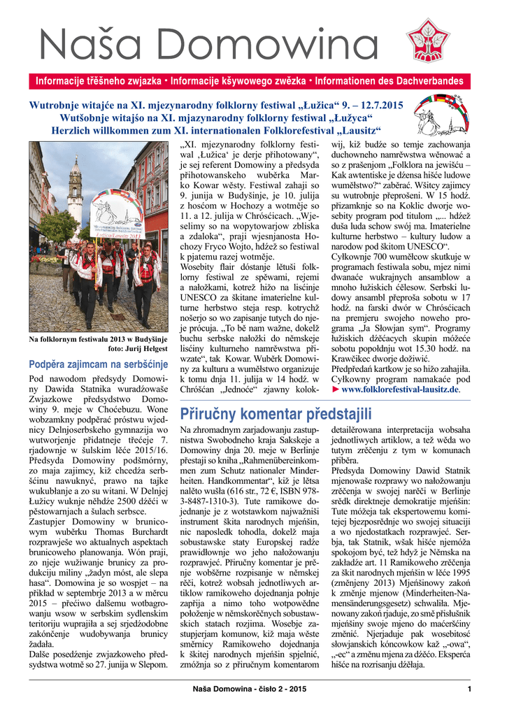 Wutrobnje witajće na XI. mjezynarodny folklorny festiwal „Łužica“ 9. – 12.7.2015 Wutšobnje witajśo na XI. mjazynarodny folklorny festiwal „Łužyca“ Herzlich willkommen zum XI. internationalen Folklorefestival „Lausitz“ Na folklornym festiwalu 2013 w Budyšinje foto: Jurij Helgest Podpěra zajimcam na serbšćinje Pod nawodom předsydy Domowiny Dawida Statnika wuradźowaše Zwjazkowe předsydstwo Domowiny 9. meje w Choćebuzu. Wone wobzamkny podpěrać próstwu wjednicy Delnjoserbskeho gymnazija wo wutworjenje přidatneje třećeje 7. rjadownje w šulskim lěće 2015/16. Předsyda Domowiny podšmórny, zo maja zajimcy, kiž chcedźa serb šćinu nawuknyć, prawo na tajke wukubłanje a zo su witani. W Delnjej Łužicy wuknje něhdźe 2500 dźěći w pěstowarnjach a šulach serbsce. Zastupjer Domowiny w brunico wym wuběrku Thomas Burchardt rozprawješe wo aktualnych aspektach brunicoweho planowanja. Wón praji, zo njeje wužiwanje brunicy za produkciju miliny „žadyn móst, ale slepa hasa“. Domowina je so wospjet – na přikład w septembrje 2013 a w měrcu 2015 – přećiwo dalšemu wotbagrowanju wsow w serbskim sydlenskim teritoriju wuprajiła a sej srjedźodobne zakónčenje wudobywanja brunicy žadała. Dalše posedźenje zwjazkoweho před sydstwa wotmě so 27. junija w Slepom. „XI. mjezynarodny folklorny festiwal ‚Łužica‘ je derje přihotowany“, je sej referent Domowiny a předsyda přihotowanskeho wuběrka Marko Kowar wěsty. Festiwal zahaji so 9. junija w Budyšinje, je 10. julija z hosćom w Hochozy a wotměje so 11. a 12. julija w Chrósćicach. „Wjeselimy so na wopytowarjow zbliska a zdaloka“, praji wjesnjanosta Ho chozy Fryco Wojto, hdźež so festiwal k pjatemu razej wotměje. Wosebity flair dóstanje lětuši folk lorny festiwal ze spěwami, rejemi a nałožkami, kotrež hižo na lisćinje UNESCO za škitane imaterielne kulturne herbstwo steja resp. kotrychž nošerjo so wo zapisanje tutych do njeje prócuja. „To bě nam wažne, dokelž buchu serbske nałožki do němskeje lisćiny kulturneho namrěwstwa při wzate“, tak Kowar. Wuběrk Domowiny za kulturu a wuměłstwo organizuje k tomu dnja 11. julija w 14 hodź. w Chróšćan „Jednoće“ zjawny kolok- wij, kiž budźe so temje zachowanja duchowneho namrěwstwa wěnować a so z prašenjom „Folklora na jewišću – Kak awtentiske je dźensa hišće ludowe wuměłstwo?“ zaběrać. Wšitcy zajimcy su wutrobnje přeprošeni. W 15 hodź. přizamknje so na Koklic dworje wosebity program pod titulom „... hdźež duša luda schow swój ma. Imaterielne kulturne herbstwo – kultury ludow a narodow pod škitom UNESCO“. Cyłkownje 700 wuměłcow skutkuje w programach festiwala sobu, mjez nimi dwanaće wukrajnych ansamblow a mnoho łužiskich ćělesow. Serbski ludowy ansambl přeproša sobotu w 17 hodź. na farski dwór w Chrósćicach na premjeru swojeho noweho programa „Ja Słowjan sym“. Programy łužiskich dźěćacych skupin móžeće sobotu popołdnju wot 15.30 hodź. na Krawčikec dworje dožiwić. Předpředań kartkow je so hižo zahajiła. Cyłkowny program namakaće pod ► www.folklorefestival-lausitz.de. Přiručny komentar předstajili Na zhromadnym zarjadowanju zastupnistwa Swobodneho kraja Sakskeje a Domowiny dnja 20. meje w Berlinje přestaji so kniha „Rahmenübereinkommen zum Schutz nationaler Minderheiten. Handkommentar“, kiž je lětsa nalěto wušła (616 str., 72 €, ISBN 9783-8487-1310-3). Tute ramikowe dojednanje je z wotstawkom najwažniši instrument škita narodnych mjeńšin, nic naposledk tohodla, dokelž maja sobustawske staty Europskej radźe prawidłownje wo jeho nałožowanju rozprawjeć. Přiručny komentar je prě nje wobšěrne rozpisanje w němskej rěči, kotrež wobsah jednotliwych artiklow ramikoweho dojednanja połnje zapřija a nimo toho wotpowědne połoženje w němskorěčnych sobustaw skich statach rozjima. Wosebje za stupjerjam komunow, kiž maja wěste směrnicy Ramikoweho dojednanja k škitej narodnych mjeńšin spjelnić, zmóžnja so z přiručnym komentarom Naša Domowina - čisło 2 - 2015 detailěrowana interpretacija wobsaha jednotliwych artiklow, a tež wěda wo tutym zrěčenju z tym w komunach přiběra. Předsyda Domowiny Dawid Statnik mjenowaše rozprawy wo nałožowanju zrěčenja w swojej narěči w Berlinje srědk direktneje demokratije mjeńšin: Tute móžeja tak ekspertowemu komitejej bjezposrědnje wo swojej situaciji a wo njedostatkach rozprawjeć. Serbja, tak Statnik, wšak hišće njemóža spokojom być, tež hdyž je Němska na zakładźe art. 11 Ramikoweho zrěčenja za škit narodnych mjeńšin w lěće 1995 (změnjeny 2013) Mjeńšinowy zakoń k změnje mjenow (Minderheiten-Na mensänderungsgesetz) schwaliła. Mje nowany zakoń rjaduje, zo smě přisłušnik mjeńšiny swoje mjeno do maćeršćiny změnić. Njerjaduje pak wosebitosć słowjanskich kóncowkow kaž „-owa“, „-ec“ a změnu mjena za dźěćo. Eksperća hišće na rozrisanju dźěłaja. 1 DOLNA ŁUŽYCA Ku góźbje 25-lětnego wobstaśa Serbskego doma w Chóśebuzu na droze Augusta Bebela 82 jo se wótměło dnja 5. junija w jogo klubowni cesne zarědowanje. Na njom su byli wjele tych, kenž su pó politiskej změnje za toś ten dom ako srjejźišćo Serbow w Dolnej Łužycy wójowali, a tych, kenž jen źinsa ze žywjenim polnje. Na fośe (wótlěwa) w prědnem rěźe župan Harald Koncak, zagronity za serbske nastupnosći w Bramborskej statny sekretaŕ Martin Gorholt, wušy šołta Chóśebuza Holger Kelch, pśedsedaŕ Domowiny Dawid Statnik, w drugem rěźe zastupujuca direktorka Załožby za serbski lud Sabina Siegowa, Margot Hašcyna a wótpósłana Bramborskego krajneho sejma Anke Schwarzenberg (Lěwica). Swěźeński gronaŕ Harald Koncak jo nacerił śěžke zachopjeńki a stawizny Serbskeho doma, kenž jo se źinsa na „serwisowu agenturu, kulturny a informaciski centrum serbskego luda w Dolnej Łužycy wuwił“. foto: