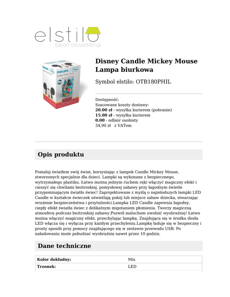 Disney Candle Mickey Mouse Lampa biurkowa Symbol elstilo: OTB180PHIL Dostępność: Szacowane koszty dostawy: 20.00 zł - wysyłka kurierem (pobranie) 15.00 zł - wysyłka kurierem 0.00 - odbiór osobisty 34,90 zł z VATem Opis produktu Pomaluj światłem swój świat, korzystając z lampek Candle Mickey Mouse, stworzonych specjalnie dla dzieci. Lampki są wykonane z bezpiecznego, wytrzymałego plastiku. Łatwo można jednym ruchem ręki włączyć magiczny efekt i cieszyć się chwilami beztroskiej, pomysłowej zabawy przy łagodnym świetle przypominającym światło świec! Zaprojektowane z myślą o najmłodszych lampki LED Candle w kształcie świeczek oświetlają pokój lub miejsce zabaw dziecka, stwarzając wrażenie bezpieczeństwa i przytulności.Lampka LED Candle zapewnia łagodny, ciepły efekt światła świec z delikatnym migotaniem płomienia. Tworzy magiczną atmosferę podczas beztroskiej zabawy.Pozwól maluchom uwolnić wyobraźnię! Łatwo można włączyć magiczny efekt, przechylając lampkę. Znajdująca się w środku dioda LED włącza się i wyłącza przy każdym przechyleniu.Lampkę ładuje się w bezpieczny i prosty sposób przy pomocy znajdującego się w zestawie przewodu USB. Po naładowaniu może pobudzać wyobraźnię nawet przez 10 godzin. Dane techniczne Kolor dokładny: Mix Trzonek: LED Napięcie znamionowe [V]: 12 Źródło światła w zestawie: Tak Źródło światła: LED Wysokość [mm]: 100 Typ: Stołowe Średnica [mm]: 65 Rodzina: Disney Rodzaj: Dziecięce Moc [W]: 0,06 Kolor: Inny Ilość źródeł światła: 4