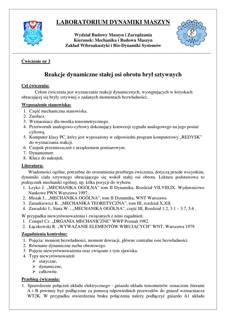 LABORATORIUM DYNAMIKI MASZYN Wydział Budowy Maszyn i Zarządzania Kierunek: Mechanika i Budowa Maszyn Zakład Wibroakustyki i Bio-Dynamiki Systemów Ćwiczenie nr 3 Reakcje dynamiczne stałej osi obrotu brył sztywnych Cel ćwiczenia: Celem ćwiczenia jest wyznaczanie reakcji dynamicznych, występujących w łożyskach obracającej się bryły sztywnej o zadanych momentach bezwładności.. Wyposażenie stanowiska: 1. Część mechaniczna stanowiska. 2. Zasilacz. 3. Wzmacniacz dla mostka tensometrycznego. 4. Przetwornik analogowo-cyfrowy dokonujący konwersji sygnału analogowego na jego postać cyfrową. 5. Komputer klasy PC, który jest wyposażony w odpowiedni program komputerowy „REDYSK” do wyznaczania reakcji. 6. Czujnik przemieszczeń z urządzeniem pomiarowym. 7. Dynamometr. 8. Klucz do nakrętek. Literatura: Wiadomości ogólne, potrzebne do zrozumienia przebiegu ćwiczenia, dotyczą przede wszystkim, dynamiki ciała sztywnego obracającego się wokół stałej osi obrotu. Lektura podstawowa to podręcznik mechaniki ogólnej, np. kilka pozycji do wyboru: 1. Leyko J. „MECHANIKA OGÓLNA” tom II Dynamika. Rozdział VII,VIII,IX. Wydawnictwo Naukowe PWN Warszawa 1997.. 2. Misiak J., „MECHANIKA OGÓLNA”, tom II Dynamika, WNT Warszawa 3. Zarankiewicz K. „MECHANIKA TEORETYCZNA”, tom III, rozdział X,XII. 4. Zawadzki J., Siuta W. , „MECHANIKA OGÓLNA”, część III, Rozdział 1.2, 3.1 – 3.7, 5.6 . W przypadku niewyrównoważenia i związanych z nimi zagadnień: 1. Cempel Cz. „DRGANIA MECHANICZNE” WWP Poznań 1982. 2. Łączkowski R. „WYWAŻANIE ELEMENTÓW WIRUJĄCYCH” WNT, Warszawa 1979. Zagadnienia kontrolne: 1. Pojęcia: moment bezwładności, moment dewiacji, główne centralne osie bezwładności. 2. Równanie dynamiczne ruchu obrotowego. 3. Pojęcie niewyrównoważenia oraz związane z tym zjawiska. 4. Typy niewyrównoważeń: statyczne, dynamiczne, całkowite. Przebieg ćwiczenia: 1. Sprawdzenie połączeń układu elektrycznego - gniazda układu tensometrów oznaczone literami A i B powinny być podłączone za pomocą odpowiednich przewodów do gniazd wzmacniacza WT2K. W przypadku stwierdzenia braku połączenia należy podłączyć gniazdo A1 układu tensometrów z gniazdem A1 wzmacniacza i tak kolejno dalsze punkty obu układów A i B. Silnik podłączamy do zasilacza (typ zasilacza). Sprawdzamy połączenie wzmacniacza (kanały A i B) z przetwornikiem A/C oraz poprawność połączenia przetwornika z komputerem PC. Prowadzący ćwiczenia sprawdza prawidłowość polączeń. Po sprawdzeniu połączeń włączyć do sieci zasilacz, wzmacniacz oraz komputer. 2. Montaż czujnika przemieszczeń - przystępujemy do zamocowania czujnika przemieszczeń na podstawce znajdującej się przy podporze. Następnie podłączamy jego wyjście do urządzenie pomiarowego, które jest połączone z przetwornikiem. Następnie regulujemy ustawienie czujnika przemieszczeń przesuwając go wzdłuż jego uchwytu tak aby uzyskać na urządzeniu pomiarowym wychylenie wskaźnika w obu kierunkach czyli „+” oraz „-”. 3. Sporządzanie charakterystyki układu (wyznaczenie współczynnika α) - Zamocować pręt na podporach A i B. Uruchamiamy program „REDYSK” i przechodzimy do okna „Charakterystyka układu”. W środku pręta łączącego belki A i B przyłożyć za pomocą dynamometru, siłę F prostopadłą do płaszczyzny belek A i B. Wtedy każda z belek będzie obciążona siłą F/2. Zadać kilka sił z zakresu dynamometru w kierunku dodatnim i ujemnym po czym wykonać wykres regresji. Wyniki zapisać w postaci pliku tekstowego i dokonać wydruku wykresu (patrz „Pomoc” programu „REDYSK”). Po przeprowadzonej kalibracji układu zdemontować czujnik przemieszczeń oraz pręt łączący podpory A i B. 4. Badanie reakcji dynamicznych - przechodzimy do okna „Pomiar reakcji dynamicznych”. Modelujemy pierwszy rodzaj niewyrównoważenia poprzez umieszczenie w otworach dodatkowych mas. Uruchamiamy zasilacz i nastawiamy go na napięcie około 20 [V]. Dokonujemy odczytu wartości napięć na kanale A i B oraz obliczamy wartość przesunięcia kąta fazowego. Tak postępujemy w przypadku wszystkich trzech typów niewyrównoważenia (patrz „Pomoc” programu „REDYSK”). Występujące reakcje RA i RB powodują zginanie belek odpowiednio momentami RAlR oraz RBlR. W miejscu gdzie naklejono tensometry, tensometry doznają odkształcenia względnego ε, które określa następująca zależność: ε= σ E = Mg W ∗E = R A, B ∗ l R (1) W ∗E gdzie:σ - naprężenie, E – moduł Younga, Mg – moment zginający, W – wskaźnik wytrzymałości na zginanie Następnie należy wyznaczyć wartości reakcji RA i RB za pomocą wzoru (2), oraz określić wartość kąta przesunięcia fazowego dla poszczególnych typów niewyrównoważenia korzystając ze wzoru (3). • Wyznaczona zależność (2) pozwala na określenie wartości reakcji dynamicznych występujących w podporach stanowiska: lF l = α ∗ δ AV MA ∗ F [N ] lR lR l l R B = FB F = α ∗ δ BV MB ∗ F [N ] lR lR R A = FA (2) gdzie: FA – wartość zadanej siły, lF - odległość tensometrów od przyłożenia siły, lR – odległość tensometrów od osi, α - współczynnik,δA,B - stałe liczbowe, VMA,MB – wartości amplitudy. • Dla obliczenia wartości przesunięcia kąta fazowego wyprowadzona została zależność: ϕ= t ⋅ 360° [°] T gdzie: t – czas między dwoma okresami (między kanałem A i kanałem B), T – okres. 5. Wypełnić czytelnie formularz załączony do ćwiczenia wraz z wydrukami. (3)