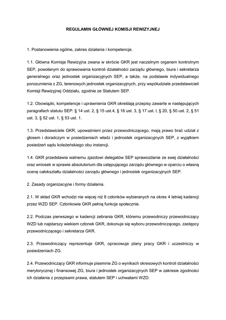 REGULAMIN GŁÓWNEJ KOMISJI REWIZYJNEJ 1. Postanowienia ogólne, zakres działania i kompetencje. 1.1. Główna Komisja Rewizyjna zwana w skrócie GKR jest naczelnym organem kontrolnym SEP, powołanym do sprawowania kontroli działalności zarządu głównego, biura i sekretarza generalnego oraz jednostek organizacyjnych SEP, a także, na podstawie indywidualnego porozumienia z ZG, terenowych jednostek organizacyjnych, przy współudziale przedstawicieli Komisji Rewizyjnej Oddziału, zgodnie ze Statutem SEP. 1.2. Obowiązki, kompetencje i uprawnienia GKR określają przepisy zawarte w następujących paragrafach statutu SEP: § 14 ust. 2, § 15 ust.4, § 16 ust. 3, § 17 ust. l, § 20, § 50 ust. 2, § 51 ust. 3, § 52 ust. 1, § 53 ust. 1. 1.3. Przedstawiciele GKR, upoważnieni przez przewodniczącego, mają prawo brać udział z głosem i doradczym w posiedzeniach władz i jednostek organizacyjnych SEP, z wyjątkiem posiedzeń sądu koleżeńskiego obu instancji. 1.4. GKR przedstawia walnemu zjazdowi delegatów SEP sprawozdanie ze swej działalności oraz wniosek w sprawie absolutorium dla ustępującego zarządu głównego w oparciu o własną ocenę całokształtu działalności zarządu głównego i jednostek organizacyjnych SEP. 2. Zasady organizacyjne i formy działania. 2.1. W skład GKR wchodzi nie więcej niż 8 członków wybieranych na okres 4 letniej kadencji przez WZD SEP. Członkowie GKR pełnią funkcje społecznie. 2.2. Podczas pierwszego w kadencji zebrania GKR, któremu przewodniczy przewodniczący WZD lub najstarszy wiekiem członek GKR, dokonuje się wyboru przewodniczącego, zastępcy przewodniczącego i sekretarza GKR. 2.3. Przewodniczący reprezentuje GKR, opracowuje plany pracy GKR i uczestniczy w posiedzeniach ZG. 2.4. Przewodniczący GKR informuje pisemnie ZG o wynikach okresowych kontroli działalności merytorycznej i finansowej ZG, biura i jednostek organizacyjnych SEP w zakresie zgodności ich działania z przepisami prawa, statutem SEP i uchwałami WZD. 2.5. Przewodniczący GKR przedstawia pisemnie ZG wyniki oceny rocznych sprawozdań finansowych SEP i uchwał dotyczących podziału zysku lub pokrycia strat oraz oceny działalności i rocznych sprawozdań ZG. 2.6. Przekazanie, zgodnie z § 20 ust. 2 punkt 3 Statutu SEP, delegatom oceny o jakiej mowa w ust. 2 punkt 5 niniejszego regulaminu może nastąpić także z wykorzystaniem Internetu, na przykład poprzez zamieszczenie tej oceny na stronach internetowych SEP. 2.7. Dokumenty GKR podpisuje jej przewodniczący. Protokoły posiedzeń GKR podpisuje osoba protokołująca, sekretarz GKR i przewodniczący posiedzenia. 2.8. W przypadku rezygnacji lub trwałej niemożności pracy członka, GKR powołuje następnego kandydata z listy wyborczej do GKR, który w głosowaniu na WZD otrzymał kolejno największą liczbę głosów. 2.9. Zebrania GKR zwołuje przewodniczący w miarę potrzeb, nie rzadziej niż 4 razy w roku lub na żądanie co najmniej 3 członków GKR. O zebraniach członkowie GKR powinni być zawiadamiani co najmniej na 14 dni przed ustalonym terminem. Zebrania na żądanie powinny się odbyć w ciągu 21 dni od zgłoszenia żądania. 2.10. Uchwały na zebraniach GKR zapadają zwykłą większością głosów przy obecności co najmniej połowy liczby członków GKR, w tym przewodniczącego lub jego zastępcy. Przy równej liczbie głosów rozstrzyga głos przewodniczącego zebrania. 2.11. Członkowie biorą udział w pracach GKR przez uczestniczenie w jej zebraniach, dokonywanie w powierzonym im zakresie analiz i kontroli oraz składanie podczas zebrań GKR pisemnych sprawozdań zawierających opinie o działalności kontrolowanych jednostek. Członkowie GKR przy dokonywaniu kontroli mają prawo badania wszelkich dokumentów, jak np. protokóły, akta i księgi, stan kasy oraz żądania wyjaśnień od prezesa SEP, skarbnika, członków ZG, sekretarza generalnego, przewodniczących i sekretarzy centralnych kolegiów sekcji, polskich komitetów, komitetów i komisji ZG, przewodniczących rad nadzorczych jednostek działalności gospodarczej, głównego księgowego SEP, dyrektorów i głównych księgowych jednostek działalności gospodarczej oraz etatowych pracowników biura SEP. 2.12. Jednostki działalności gospodarczej oceniane są przez GKR przede wszystkim przez analizowanie wyników finansowych, ustosunkowanie się do działalności i dokumentów rad nadzorczych. W przypadkach uzasadnionych GKR przeprowadza kontrole bezpośrednie. 2.13. Przewodniczący GKR po otrzymaniu uchwały ZG zawierającej informację o podejrzeniu zaistnienia w jednostce terenowej działań niezgodnych z przepisami prawa, statutem SEP lub uchwałami WZD - w porozumieniu z prezesem SEP - powołuje Komisję Nadzwyczajną w składzie: dwóch przedstawicieli GKR, dwóch przedstawicieli komisji rewizyjnej oddziału, jeden przedstawiciel ZG SEP. Przewodniczy Komisji przewodniczący GKR lub jego zastępca. Komisja przeprowadza kontrolę oddziału, a protokół z kontroli wraz z wnioskami przekazuje ZG SEP. 2.14. GKR ma prawo występowania do zarządu głównego z wnioskami z ustaleń kontroli oraz wnioskowania o wycofanie lub anulowanie uchwał ZG. Wniosek ten jest rozpatrywany przez ZG w obecności przewodniczącego GKR. W przypadku braku konsensusu GKR może wnioskować o zwołanie NWZD. Wniosek ten jest obligatoryjny. 3. Współpraca z komisjami rewizyjnymi oddziałów i obsługa komisji. 3.1. GKR współpracuje z komisjami rewizyjnymi oddziałów (KRO) przez: 1) odbywanie co najmniej dwa razy w kadencji posiedzeń GKR z udziałem przewodniczących KRO dla wymiany doświadczeń, 2) zapoznanie się ze sprawozdaniami z działalności komisji rewizyjnych oddziałów; 3) udzielanie porad i informacji. 3.2. Obsługę administracyjno - biurową GKR sprawuje wyznaczony pracownik biura SEP. W pełnieniu tych zadań wymieniony pracownik działa w myśl poleceń przewodniczącego i sekretarza GKR. Koszty działalności GKR pokrywane