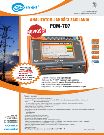 indeks: WMPLPQM707 wersja bez cęgów: WMPLPQM707NC ANALIZATOR JAKOŚCI ZASILANIA NOWOŚĆ! PQM-707 Temperatura pracy: -10...50°C DOTYKOWY EKRAN ANALIZATOR REJESTRUJE WSZYSTKIE PARAMETRY SIECI ZGODNIE Y Z KLASĄ S NORM -30 0-4 00 EN 61 ·7" ekran dotykowy - intuicyjna obsługa ·kategoria CAT IV 600V - wysokie bezpieczeństwo ·parametry w klasie S - wysoka dokładność pomiarów ·akumulator Li-Ion - większa mobilność ·wyjmowana karta pamięci - brak ograniczeń zapisu danych Parametry mierzone: Sonel S.A. ul. Wokulskiego 11 58-100 Świdnica tel. +48 74 85 83 878 fax +48 74 85 83 808 [email protected] www.sonel.pl · Napięcia L1, L2, L3, N-PE (pięć wejść pomiarowych), – wartości średnie, minimalne i maksymalne w zakresie do 760 V, możliwość współpracy z przekładnikami napięciowymi, · Prądy L1, L2, L3, N (cztery wejścia pomiarowe) – wartości średnie, minimalne i maksymalne, pomiar prądu w zakresie do 3 kA (w zależności od użytych cęgów prądowych),możliwość współpracy z przekładnikami prądowymi, · Współczynniki szczytu dla prądu (CFI) i napięcia (CFU), · Częstotliwość w zakresie 40Hz – 70Hz, · Moc czynna (P), bierna (Q), odkształcenia (D), pozorna (S) wraz z określeniem charakteru mocy biernej (pojemnościowa, indukcyjna), · Rejestracja mocy: – Metoda Budeanu, – IEEE 1459, · Energia czynna (EP), bierna (Eq), pozorna (ES), · Współczynnik mocy (Power Factor), cosφ, tgφ, · Harmoniczne do 40-tej w napięciu i prądzie, · Współczynnik zniekształceń harmonicznych THD dla prądu i napięcia, · Wskaźnik krótkookresowego (PST) oraz długookresowego (PLT) migotania światła (spełnione wymogi EN 61000-4-15 klasa S), · Asymetria napięć (spełnione wymogi EN 61000-4-30 klasa S) i prądów, · Rejestracja zdarzeń dla prądu i napięcia wraz z oscylogramami oraz wykresami RMS 1/2 okresu, · Prąd rozruchu*, · Kalkulator taryf energii*, · Wszystkie parametry rejestrowane zgodnie z klasą S normy EN 61000-4-30. *Funkcje dostępne od 2017 Analizator jakości zasilania PQM-707 Przyrząd przewidziany jest do pracy w sieciach: Układy obsługiwanych sieci: · o częstotliwości znamionowej 50/60 Hz. · o napięciach znamionowych: 64/110 V;110/190 V; 115/200 V; 127/220 V; 220/380 V; 230/400 V; 240/415 V; 254/440 V; 290/500 V, 400/690 V, · prądu stałego. · jednofazowy, · dwufazowy ze wspólnym N, · trójfazowy gwiazda z i bez przewodu N, · trójfazowy trójkąt. Parametry analizatora: Zakres pomiarowy Maks. rozdzielczość Błąd podstawowy Napięcie przemienne (TRMS) Parametr — 0,0…760,0 V 0,01 % Unom ±0,5% Unom Współczynnik szczytu (Crest Factor) Napięcie 1,00…10,00 (≤1,65 dla napięcia 690 V) 0,01 ±5% Prąd 1,00…10,00 (≤3,6 Inom) 0,01 ± 5% w.m. Prąd przemienny TRMS — w zależności od cęgów* 0,01% Inom ±2% w.m. jeśli w.m. ≥ 10% Inom ±2% Inom jeśli w.m. < 10% Inom (błąd nie uwzględnia błędu cęgów) Częstotliwość — 40,00...70,00 Hz 0,01Hz ±0,05 Hz Moc czynna,bierna, pozorna I odkształcenia — w zależności od konfiguracji (przekładniki, cęgi) do czterech miejsc po przecinku w zależności od konfiguracji (przekładniki, cęgi) Energia cznna bierna i pozorna — w zależności od konfiguracji (przekładniki, cęgi) do czterech miejsc po przecinku jak błąd mocy cosφ i współczynnik mocy (PF) — 0,00...1,00 0,01 ±0,03 tg φ — 0,00...10,00 0,01 zależy od błędu mocy czynnej i biernej Napięcie taki sam jak napięcia przemiennego True RMS taka sama jak napięcia przemiennego True RMS ±5% w.m. jeśli w.m. ≥ 3% Unom ±0,15% Unom jeśli w.m. < 3% Unom Prąd taki sam jak prądu przemiennego True RMS taka sama jak prądu przemiennego True RMS ±5% w.m. jeśli w.m. ≥ 10% Inom ±0,5% Inom jeśli w.m. < 10% Inom Prąd 0.0...100.0% (względem wartości skutecznej) 0,1% Wskaźnik migotania światła (flicker) — 0,40...10,00 0,01 ±10% Współczynnik asymetrii Napięcie oraz prąd 0,0...10,0% 0,1% ±0,15% (błąd bezwzględny) Prąd rozruchu — w zależności od cęgów 0,01% Inom ±4% w.m. jeśli w.m. ≥ 10% Inom ±4% Inom jeśli w.m. < 10% Inom (RMS1/2) Harmoniczne Napięcie THD ±5% ±5% *Cęgi F-1A, F-2A, F-3A: 0..3000 A (10000 Ap-p) *Cęgi C-4A: 0..1000 A (3600 Ap-p)*Cęgi C-5A: 0..1000 A (3600 Ap-p)*Cęgi C-6A: 0..10 A (36 Ap-p) *Cęgi C-7A: 0...100 A (360 Ap-p) Wyposażenie standardowe: - zasilacz sieciowy Z7, WAZASZ7 - adapter napięciowy magnetyczny, (4 szt.). WAADAUMAGKPL - futerał L4, WAFUTL4 - program Sonel Analiza do odczytu i analizy danych, - akumulator Li-Ion, WAAKU15 - przewód do zasilacza sieciowego 230V WAPRZLAD230 - przewód do ładowania i zasilania miernika z gniazda sam., WAPRZLAD12SAM - rysik do obsługi dotykowej, - karta pamięci microSD 4GB, - instrukcja obsługi, karta gwarancyjna, świadectwo wzorcowania. - przewód 2,2 m czarny, 3 szt, - przewód 2,2 m niebieski, 1 szt, - przewód 2,2 m żółty, 1 szt, - krokodylek czarny K01, 3 szt, - krokodylek niebieski K02, 1 szt, - krokodylek czerwony K02, 2 szt, - krokodylek żółty K02,1 szt, - przewód do transmisji danych USB, - rozdzielacz fazy AC-16, - giętkie cęgi F-3A, 4 szt, - adapter zasilacza AZ-2, 1 szt, WAPRZ2X2BLBB WAPRZ2X2BUBB WAPRZ2X2YEBB WAKROBL20K01 WAKROBU20K02 WAKRORE20K02 WAKROYE20K02 WAPRZUSB WAADAAC16 WACEGF3AOKR WAADAAZ2 Wyposażenie dodatkowe: - twarda walizka na cęgi, WAWALL2 - adapter napięciowy z gwintem M4/M6 WAADAM4M6 - adapter AGT-16P lub C (16A) do gniazd trójfazowych WAADAAGT16P(C) - adapter AGT-32P lub C (32A) do gniazd trójfazowych WAADAAGT32P(C) - adapter AGT-63P (63A) do gniazd trójfazowych WAADAAGT63P - adapter AGT-16T (16A) do gniazd przemysłowych jednofazowych WAADAAGT16T - adapter AGT-32T (32A) do gniazd prze. jednofazowych - sonda ostrzowa z gniazdem bananowym - żółta - sonda ostrzowa z gniazdem bananowym - niebieska - sonda ostrzowa z gniazdem bananowym - czerwona - sonda ostrzowa z gniazdem bananowym - czarna Cęgi C-4A C-5A C-6A C-7A INDEKS WACE