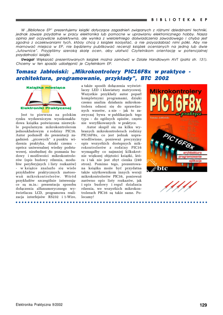 B I B L I O T E K A E P W „Bibliotece EP” prezentujemy książki dotyczące zagadnień związanych z różnymi dziedzinami techniki, jednak zawsze przydatne w pracy elektronika lub pomocne w uprawianiu elektronicznego hobby. Nasza opinia jest oczywiście subiektywna, ale wynika z wieloletniego doświadczenia zawodowego i chyba jest zgodna z oczekiwaniami tych, którzy chcą z książek korzystać, a nie przyozdabiać nimi półki. Aby nie marnować miejsca w EP, nie będziemy publikować recenzji książek ocenianych na jedną lub dwie „lutownice”. Przyjęliśmy szeroką skalę ocen, aby ułatwić Czytelnikom orientację w potencjalnej przydatności książki. Uwaga! Większość prezentowanych książek można zamówić w Dziale Handlowym AVT (patrz str. 131). Chcemy w ten sposób udostępnić je Czytelnikom EP. Tomasz Jabłoński: „Mikrokontrolery PIC16F8x w praktyce − architektura, programowanie, przykłady”, BTC 2002 Jest to pierwsza na polskim rynku wydawniczym wysokonak³adowa ksi¹øka poúwiÍcona niezwykle popularnym mikrokontrolerom jednouk³adowym z†rodziny PIC16. Autor podszed³ do prezentacji zagadnieÒ ìpicowychî z†punktu widzenia praktyka, dziÍki czemu oprÛcz uniwersalnej wiedzy podstawowej, niezbÍdnej do poznania budowy i†moøliwoúci mikrokontrolerÛw (opis budowy rdzenia, modu³Ûw peryferyjnych i†listy rozkazÛw) - w†ksi¹øce znalaz³o siÍ wiele przyk³adÛw praktycznych zastosowaÒ mikrokontrolerÛw. WúrÛd przyk³adÛw szczegÛlnie interesuj¹ce s¹ m.in.: prezentacja sposobu do³¹czenia alfanumerycznego wyúwietlacza LCD, programowa realizacja interfejsÛw RS232 i†1-Wire, a†takøe sposÛb do³¹czenia wyúwietlaczy LED i†klawiatury matrycowej. Wszystkie przyk³ady autor popar³ kompletnymi programami, dziÍki czemu analiza dzia³ania mikrokontrolera odnosi siÍ do sprawdzonych wzorÛw, a†nie - jak to zazwyczaj bywa w†publikacjach tego typu - do ogÛlnych opisÛw, czÍsto nie weryfikowanych w†praktyce. Autor skupi³ siÍ na kilku wybranych mikrokontrolerach rodziny PIC16F8x, co jest jednak usprawiedliwione, poniewaø precyzyjny opis wszystkich dostÍpnych mikrokontrolerÛw z rodziny PIC16 wymaga³by co najmniej kilkukrotnie wiÍkszej objÍtoúci ksi¹øki, ktÛra i†tak nie jest zbyt cienka (240 stron). Pomimo tego, prezentowana ksi¹øka moøe byÊ przydatna takøe uøytkownikom innych wersji mikrokontrolerÛw PIC16, poniewaø zarÛwno opis listy rozkazÛw, jak i†opis budowy i†regu³ dzia³ania rdzenia, we wszystkich mikrokontrolerach PIC16 s¹ takie same. Polecamy! ○ ○ ○ ○ ○ ○ ○ ○ ○ ○ ○ ○ ○ ○ ○ ○ ○ ○ ○ ○ ○ ○ ○ ○ ○ ○ ○ ○ ○ ○ ○ ○ ○ ○ ○ ○ ○ ○ ○ ○ ○ ○ ○ ○ ○ ○ ○ ○ ○ ○ ○ ○ ○ ○ ○ ○ ○ ○ ○ ○ ○ ○ ○ ○ Elektronika Praktyczna 9/2002 129