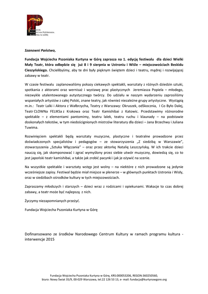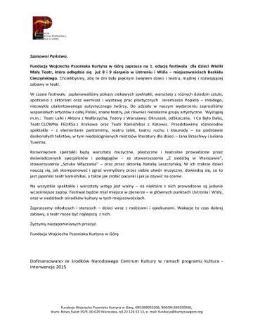 Szanowni Państwo, Fundacja Wojciecha Pszoniaka Kurtyna w Górę zaprasza na 1. edycję festiwalu dla dzieci Wielki Mały Teatr, która odbędzie się już 8 i 9 sierpnia w Ustroniu i Wiśle – miejscowościach Beskidu Cieszyńskiego. Chcielibyśmy, aby te dni były pięknym świętem dzieci i teatru, mądrej i rozwijającej zabawy w teatr. W czasie festiwalu zaplanowaliśmy pokazy ciekawych spektakli, warsztaty z różnych dziedzin sztuki, spotkania z aktorami oraz wernisaż i wystawę prac plastycznych Jeremiasza Popiela – młodego, niezwykle utalentowanego autystycznego twórcy. Do udziału w naszym wydarzeniu zaprosiliśmy wspaniałych artystów z całej Polski, znane teatry, jak również niezależne grupy artystyczne. Wystąpią m.in.: Teatr Lalki i Aktora z Wałbrzycha, Teatry z Warszawy: Okruszek, odSkocznia, I Co Było Dalej, Teatr CLOWNa FELIKSa z Krakowa oraz Teatr Kamishibai z Katowic. Przedstawimy różnorodne spektakle – z elementami pantomimy, teatru lalek, teatru ruchu i klaunady – na podstawie doskonałych tekstów, w tym niedoścignionych mistrzów literatury dla dzieci – Jana Brzechwy i Juliana Tuwima. Rozwinięciem spektakli będą warsztaty muzyczne, plastyczne i teatralne prowadzone przez doświadczonych specjalistów i pedagogów – ze stowarzyszenia „Z siedzibą w Warszawie”, stowarzyszenia „Sztuka Włączania” – oraz przez aktorkę Natalię Leszczyńską. W ich trakcie dzieci nauczą się, jak skomponować i zgrać wymyślony przez siebie utwór muzyczny, dowiedzą się, co to jest japoński teatr kamishibai, a także jak zrobić pacynki i jak je ożywić na scenie. Na wszystkie spektakle i warsztaty wstęp jest wolny – na niektóre z nich prowadzone są jedynie wcześniejsze zapisy. Festiwal będzie miał miejsce w plenerze – w głównych punktach Ustronia i Wisły, oraz w siedzibach ośrodków kultury w tych miejscowościach. Zapraszamy młodszych i starszych – dzieci wraz z rodzicami i opiekunami. Wakacje to czas dobrej zabawy, a teatr może być najlepszą z nich. Życzymy niezapomnianych przeżyć. Fundacja Wojciecha Pszoniaka Kurtyna w Górę Dofinansowano ze środków Narodowego Centrum Kultury w ramach programu kultura interwencje 2015 Fundacja Wojciecha Pszoniaka Kurtyna w Górę, KRS:000053206, REGON:360250560, biuro: Nowy Świat 35/9, 00-029 Warszawa, tel.22 126 53 13, e- mail: [email protected] PROGRAM 8.08.2015. (sobota), godz. 11:00, Ustroń, Rynek 9.08.2015. (niedziela), godz. 11:00, Wisła, Plac Bogumiła Hoffa MAŁE HISTORIE Teatr I Co Było Dalej z Warszawy dzieci 3-9 lat scenografia: Anna Wojtecka lalki: Katarzyna Mazurek współpraca: Anna Szawiel muzyka: Natalia Leszczyńska obsada: Natalia Leszczyńska Scenariusz spektaklu został oparty na czterech opowiadaniach dla dzieci: Wiery Badalskiej Muzyka na krzywej wieży, Joanny Papuzińskiej Agnieszka opowiada bajkę , Marii Łaskowieckiej Cieślak Kto kiedy zasypia i Wandy Chotomskiej Mój piękny złoty koń. Kilkanaście lalkowych postaci mieszka w zaczarowanej szafie i kieszeniach spódnicy pewnej zwariowanej, rozśpiewanej mamy. Akcja toczy się w dwóch planach. Łączy je postać mamy, która uwielbia opowiadać historie, a najbardziej lubi zdradzać rozmaite sekrety dzieciom. Spektakl jest połączeniem teatru lalek, teatru ożywionej formy oraz improwizacji aktorskiej i muzycznej ze światem dzieci. 8.08.2015. (sobota), godz. 12:00, Ustroń-Hermanice, świetlica dla dzieci i młodzieży przy kościele Dominikanów, ul. Dominikańska 14 9.08.2015. (niedziela), godz. 12:00, Wisła, Wiślańskie Centrum Kultury, Plac Bogumiła Hoffa 3 WARSZTATY MUZYCZNO-TEATRALNE dzieci 6-9 lat prowadzenie: Edyta Ołdak Podczas warsztatów uczestnicy będą samodzielnie komponować i grać różne melodie. Stworzą Orkiestrę Niewidzialnych Instrumentów i zapoznają się z ludowymi instrumentami oraz z zasadami komponowania współczesnych utworów muzycznych. Zapisy: Ustroń – [email protected], do 31 lipca 2015, liczba miejsc ograniczona Wisła – [email protected], do 7 sierpnia 2015, liczba miejsc ograniczona 8.08.2015. (sobota), godz. 13:00, Ustroń, Rynek 9.08.2015. (niedziela), godz. 14:00, Wisła, Plac Bogumiła Hoffa 3 PAN TOM BUDUJE DOM Teatr Okruszek z Warszawy dzieci 3-9 lat wg Stefana Themersona adaptacja i reżyseria: Jacek Papis muzyka: Hanna Klepacka rysunki: Jola Drozd obsada: Agnieszka Roszkowska, Dorota Papis Do architekta pana Kąta przychodzi Tom Łebski, żeby zbudować dom... Tak zaczyna się niezwykle dowcipna historia, otwierająca wyobraźnię najmłodszych. Dzieci uwielbiają jej rytmiczny wiersz, powtórzenia i przygody głównego bohatera, który sam jest trochę dzieckiem. Historia w sam raz dla ciekawych świata małych budowniczych! Pan Tom buduje dom to spektakl: edukacyjny – dzieci dowiadują się w bardzo zabawnej formie, jakie są domy na świecie; ekologiczny – używane w spektaklu materiały pochodzą z recyklingu; interaktywny – dzieci czynnie uczestniczą w przedstawieniu, odpowiadają na pytania i uczą się od aktorów piosenek. A na koniec niespodzianka: mali widzowie dostaną kredki oraz kartki i narysują swój wymarzony dom. 8.08.2015. (sobota), godz. 15:00, Ustroń-Hermanice, świetlica dla dzieci i młodzieży przy kościele Dominikanów, ul. Dominikańska 14 9.08.2015. (niedziela), godz. 15:30, Wisła, Wiślańskie Centrum Kultury, Plac Bogumiła Hoffa 3 WARSZTATY LALKOWE SKARPETKOWE ZWIERZĘ dzieci 6-10 lat prowadzenie: Natalia Leszczyńska Podczas warsztatów dzieci skonstruują swoje własne pacynki, a następnie opanują podstawy animacji lalek i wykonają krótkie etiudy aktorskie. Zapisy: Ustroń – [email protected], do 31 lipca 2015, liczba miejsc ograniczona Wisła – [email protected], do 7 sierpnia 2015, liczba miejsc ograniczona 8.08.2015. (sobota), godz. 17:00, Ustroń, Rynek U/RODZINY Teatr Lalki i Aktora w Wałbrzychu tekst i reżyseria: Ewelina Ciszewska scenografia i kostiumy: Ewelina Ciszewska muzyka: K