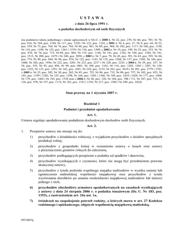 USTAWA z dnia 26 lipca 1991 r. o podatku dochodowym od osób fizycznych (na podstawie tekstu jednolitego i zmian ogłoszonych w Dz.U. z 2000 r. Nr 22, poz. 270, Nr 60, poz. 703, Nr 70, poz. 816, Nr 104, poz. 1104, Nr 117, poz. 1228 i Nr 122, poz. 1324, z 2001 r. Nr 4, poz. 27, Nr 8, poz. 64, Nr 52, poz. 539, Nr 73, poz. 764, Nr 74, poz. 784, Nr 88, poz. 961, Nr 89, poz. 968, Nr 102, poz. 1117, Nr 106, poz. 1150, Nr 110, poz. 1190, Nr 125, poz. 1363 i 1370 i Nr 134, poz. 1509, z 2002 r. Nr 19, poz. 199, Nr 25, poz. 253, Nr 74, poz. 676, Nr 78, poz. 715, Nr 89, poz. 804, Nr 135, poz. 1146, Nr 141, poz. 1182, Nr 169, poz. 1384, Nr 181, poz. 1515, Nr 200, poz. 1679 i Nr 240, poz. 2058, z 2003 r. Nr 7, poz. 79, Nr 45, poz. 391, Nr 65, poz. 595, Nr 84, poz. 774, Nr 90, poz. 844, Nr 96, poz. 874, Nr 122, poz. 1143, Nr 135, poz. 1268, Nr 137, poz. 1302, Nr 166, poz. 1608, Nr 202, poz. 1956, Nr 222, poz. 2201, Nr 223, poz. 2217 i Nr 228, poz. 2255, z 2004 r. Nr 29, poz. 257, Nr 54, poz. 535, Nr 93, poz. 894, Nr 99, poz. 1001, Nr 109, poz. 1163, Nr 116, poz. 1203, 1205 i 1207, Nr 120, poz. 1252, Nr 123, poz. 1291, Nr 162, poz. 1691, Nr 210, poz. 2135, Nr 263, poz. 2619 i Nr 281, poz. 2779 i 2781, z 2005 r. Nr 25, poz. 202, Nr 30, poz. 262, Nr 85, poz. 725, Nr 86, poz. 732, Nr 90, poz. 757, Nr 102, poz. 852, Nr 143, poz. 1199 i 1202, Nr 155, poz. 1298, Nr 164, poz. 1365 i 1366, Nr 169, poz. 1418 i 1420, Nr 177, poz. 1468, Nr 179, poz. 1484 i Nr 183, poz. 1538 oraz z 2006 r. Nr 46, poz. 328, Nr 104, poz. 708 i 711, Nr 107, poz. 723, Nr 136, poz. 970, Nr 157, poz. 1119, Nr 183, poz. 1353 i 1354, Nr 217, poz. 1588 i Nr 249, poz. 1824) Stan prawny na 1 stycznia 2007 r. Rozdział 1 Podmiot i przedmiot opodatkowania Art. 1. Ustawa reguluje opodatkowanie podatkiem dochodowym dochodów osób fizycznych. Art. 2. 1. Przepisów ustawy nie stosuje się do: 1) przychodów z działalności rolniczej, z wyjątkiem przychodów z działów specjalnych produkcji rolnej, 2) przychodów z gospodarki leśnej w rozumieniu ustawy o lasach oraz ustawy o przeznaczeniu gruntów rolnych do zalesienia, 3) przychodów podlegających przepisom o podatku od spadków i darowizn, 4) przychodów wynikających z czynności, które nie mogą być przedmiotem prawnie skutecznej umowy, 5) przychodów z tytułu podziału wspólnego majątku małżonków w wyniku ustania lub ograniczenia małżeńskiej wspólności majątkowej oraz przychodów z tytułu wyrównania dorobków po ustaniu rozdzielności majątkowej małżonków lub śmierci jednego z nich, 6) przychodów (dochodów) armatora opodatkowanych na zasadach wynikających z ustawy z dnia 24 sierpnia 2006 r. o podatku tonażowym (Dz. U. Nr 183, poz. 1353), z zastrzeżeniem art. 24a ust. 1a, 7) świadczeń na zaspokojenie potrzeb rodziny, o których mowa w art. 27 Kodeksu rodzinnego i opiekuńczego, objętych wspólnością majątkową małżeńską. PIT2007tj 2. Działalnością rolniczą, w rozumieniu ust. 1 pkt 1, jest działalność polegająca na wytwarzaniu produktów roślinnych lub zwierzęcych w stanie nieprzetworzonym (naturalnym) z własnych upraw albo hodowli lub chowu, w tym również produkcja materiału siewnego, szkółkarskiego, hodowlanego oraz reprodukcyjnego, produkcja warzywnicza gruntowa, szklarniowa i pod folią, produkcja roślin ozdobnych, grzybów uprawnych i sadownicza, hodowla i produkcja materiału zarodowego zwierząt, ptactwa i owadów użytkowych, produkcja zwierzęca typu przemysłowo-fermowego oraz hodowla ryb, a także działalność, w której minimalne okresy przetrzymywania zakupionych zwierząt i roślin, w trakcie których następuje ich biologiczny wzrost, wynoszą co najmniej: 1) miesiąc - w przypadku roślin, 2) 16 dni - w przypadku wysokointensywnego tuczu specjalizowanego gęsi lub kaczek, 3) 6 tygodni - w przypadku pozostałego drobiu rzeźnego, 4) 2 miesiące - w przypadku pozostałych zwierząt - licząc od dnia nabycia. 3. Działami specjalnymi produkcji rolnej są: uprawy w szklarniach i ogrzewanych tunelach foliowych, uprawy grzybów i ich grzybni, uprawy roślin "in vitro", fermowa hodowla i chów drobiu rzeźnego i nieśnego, wylęgarnie drobiu, hodowla i chów zwierząt futerkowych i laboratoryjnych, hodowla dżdżownic, hodowla entomofagów, hodowla jedwabników, prowadzenie pasiek oraz hodowla i chów innych zwierząt poza gospodarstwem rolnym. 3a. Nie stanowią działów specjalnych produkcji rolnej uprawy, hodowla i chów zwierząt w rozmiarach nieprzekraczających wielkości określonych w załączniku nr 2 do ustawy, zwanym „załącznikiem nr 2”. 4. Ilekroć w ustawie jest mowa o gospodarstwie rolnym, oznacza to gospodarstwo rolne w rozumieniu przepisów ustawy o podatku rolnym. 5. (skreślony) Art. 3. 1. Osoby fizyczne, jeżeli mają miejsce zamieszkania na terytorium Rzeczypospolitej Polskiej, podlegają obowiązkowi podatkowemu od całości swoich dochodów (przychodów) bez względu na miejsce położenia źródeł przychodów (nieograniczony obowiązek podatkowy). 1a. Za osobę mającą miejsce zamieszkania na terytorium Rzeczypospolitej Polskiej uważa się osobę fizyczną, która: 1) posiada na terytorium Rzeczypospolitej Polskiej centrum interesów osobistych lub gospodarczych (ośrodek interesów życiowych) lub 2) przebywa na terytorium Rzeczypospolitej Polskiej dłużej niż 183 dni w roku podatkowym. 2. (skreślony) 2a. Osoby fizyczne, jeżeli nie mają na terytorium Rzeczypospolitej Polskiej miejsca zamieszkania, podlegają obowiązkowi podatkowemu tylko od dochodów (przychodów) osiąganych na terytorium Rzeczypospolitej Polskiej (ograniczony obowiązek podatkowy). 2b. Za dochody (przychody) osiągane na terytorium Rzeczypospolitej Polskiej uważa się w szczególności dochody (przychody) z: 2 3. 1) pracy wykonywanej na terytorium Rzeczypospolitej Polskiej na podstawie stosunku służbowego, stosunku pracy, pracy nakładczej oraz spółdzielczego stosunku pracy, bez względu na miejsce wypłaty wynagro