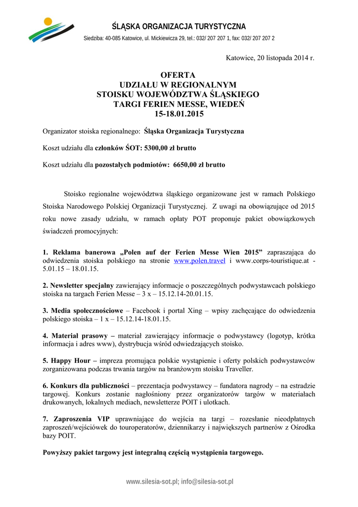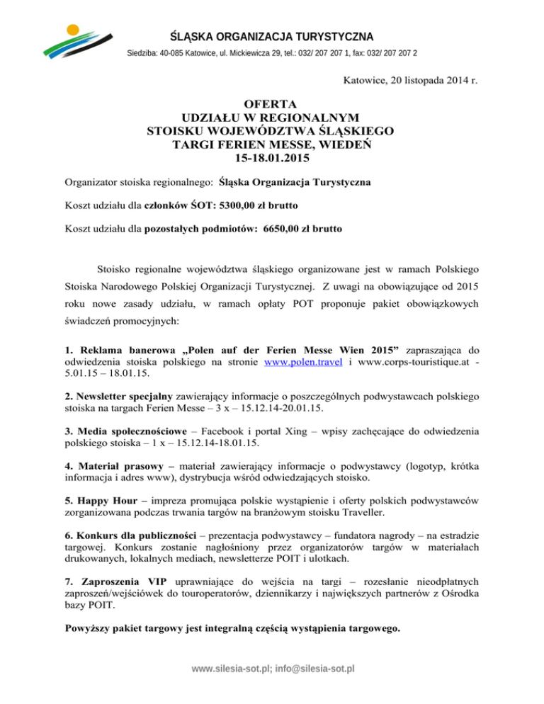 ŚLĄSKA ORGANIZACJA TURYSTYCZNA Siedziba: 40-085 Katowice, ul. Mickiewicza 29, tel.: 032/ 207 207 1, fax: 032/ 207 207 2 Katowice, 20 listopada 2014 r. OFERTA UDZIAŁU W REGIONALNYM STOISKU WOJEWÓDZTWA ŚLĄSKIEGO TARGI FERIEN MESSE, WIEDEŃ 15-18.01.2015 Organizator stoiska regionalnego: Śląska Organizacja Turystyczna Koszt udziału dla członków ŚOT: 5300,00 zł brutto Koszt udziału dla pozostałych podmiotów: 6650,00 zł brutto Stoisko regionalne województwa śląskiego organizowane jest w ramach Polskiego Stoiska Narodowego Polskiej Organizacji Turystycznej. Z uwagi na obowiązujące od 2015 roku nowe zasady udziału, w ramach opłaty POT proponuje pakiet obowiązkowych świadczeń promocyjnych: 1. Reklama banerowa „Polen auf der Ferien Messe Wien 2015” zapraszająca do odwiedzenia stoiska polskiego na stronie www.polen.travel i www.corps-touristique.at 5.01.15 – 18.01.15. 2. Newsletter specjalny zawierający informacje o poszczególnych podwystawcach polskiego stoiska na targach Ferien Messe – 3 x – 15.12.14-20.01.15. 3. Media społecznościowe – Facebook i portal Xing – wpisy zachęcające do odwiedzenia polskiego stoiska – 1 x – 15.12.14-18.01.15. 4. Materiał prasowy – materiał zawierający informacje o podwystawcy (logotyp, krótka informacja i adres www), dystrybucja wśród odwiedzających stoisko. 5. Happy Hour – impreza promująca polskie wystąpienie i oferty polskich podwystawców zorganizowana podczas trwania targów na branżowym stoisku Traveller. 6. Konkurs dla publiczności – prezentacja podwystawcy – fundatora nagrody – na estradzie targowej. Konkurs zostanie nagłośniony przez organizatorów targów w materiałach drukowanych, lokalnych mediach, newsletterze POIT i ulotkach. 7. Zaproszenia VIP uprawniające do wejścia na targi – rozesłanie nieodpłatnych zaproszeń/wejściówek do touroperatorów, dziennikarzy i największych partnerów z Ośrodka bazy POIT. Powyższy pakiet targowy jest integralną częścią wystąpienia targowego. www.silesia-sot.pl; [email protected] ŚLĄSKA ORGANIZACJA TURYSTYCZNA Siedziba: 40-085 Katowice, ul. Mickiewicza 29, tel.: 032/ 207 207 1, fax: 032/ 207 207 2 Zgłoszenia udziału w stoisku regionalnym podczas targów Ferien Messe w Wiedniu przyjmujemy do dnia 5 grudnia 2014 r. do godziny 12:00 na załączonej karcie zgłoszenia. Osoba do kontaktu: Natalia Wójcik Specjalista ds. Promocji Śląska Organizacja Turystyczna tel. 32 207 207 1 [email protected] www.silesia-sot.pl; [email protected]