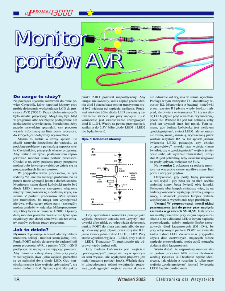 + Monitor portów AVR Do czego to służy? Na początku stycznia zadzwonił do mnie pewien Czytelnik, który napotkał kłopoty przy próbie dołączenia wyświetlacza LCD do procesora AVR (‘8535). Przez telefon nie sposób było ustalić przyczyny. Mógł nią być błąd w programie albo też błędne podłączenie lub uszkodzenie wyświetlacza. Poradziłem, żeby przede wszystkim sprawdził, czy procesor wysyła informację na linie portu procesora, do których jest dołączony wyświetlacz. Można to zrobić w różny sposób. Po chwili namysłu doszedłem do wniosku, że podobne problemy z pewnością napotka wielu Czytelników, piszących własne programy. Aby ułatwić im życie, postanowiłem zaprojektować monitor stanu portów procesora. Chodzi o to, żeby podczas pracy programu można było łatwo sprawdzić, co dzieje się na poszczególnych liniach portów. W przypadku wielu procesorów, w tym rodziny ‘51, nie ma żadnego problemu, bo na porcie może wystąpić jeden z dwóch stanów. Monitorem stanu danej końcówki może być dioda LED i rezystor szeregowy włączone między daną końcówkę a dodatnią szynę zasilania. Z portami procesorów AVR sprawa jest trudniejsza, bo mogą tam występować nie dwa, tylko cztery różne stany - szczegóły można znaleźć w odcinku Mikroprocesorowej Oślej łączki w numerze 1/2003. Opisany dalej monitor pozwala określić nie tylko spoczynkowy stan danej końcówki, ale też zmiany stanów podczas pracy programu. Jak to działa? Rysunek 1 pokazuje schemat ideowy układu monitora, ściślej - monitor stanu jednej linii. Punkt PORT należy dołączyć do badanej linii portu procesora AVR, a punkty VCC i GND podłączyć do napięcia zasilającego procesor. Aby rozróżnić cztery stany (dwa przy pracy w roli wyjścia, dwa - jako wejścia) potrzebne są co najmniej dwie diody LED. Gdy końcówka pracuje jako wejście „pływające”, nie świeci żadna z diod. Sytuacja jest taka, jakby 18 punkt PORT pozostał niepodłączony. Aby lampki nie świeciły, suma napięć przewodzenia diod i złącza baza-emiter tranzystora musi być większa od napięcia zasilania. Ponieważ niektóre żółte diody LED zaczynają zauważalnie świecić już przy napięciu 1,7V, koniecznie jest zastosowanie szeregowych diod D1...D4. Wtedy na pewno przy napięciu zasilania do 5,5V żółte diody LED1 i LED2 nie będą świecić. Rys. 1 Schemat ideowy Gdy sprawdzana końcówka pracuje jako wyjście, procesor ustawia tam „czysty” stan wysoki albo niski, co odpowiada dołączeniu punktu PORT do plusa zasilania albo do masy. Znaczny prąd płynie przez rezystor R1 i jasno świeci jedna z diod LED1, LED2. Przy stanie wysokim wyjścia – LED2, przy niskim – LED1. Tranzystor T1 praktycznie nie odgrywa wtedy żadnej roli. Gdy badana końcówka jest wejściem „podciągniętym”, panuje na niej w spoczynku stan wysoki, ale wydajność prądowa jest mała (znacznie poniżej 1mA). Właśnie dzięki zdecydowanie różnej wydajności prądowej „podciągnięte” wejście można skutecz- nie odróżnić od wyjścia w stanie wysokim. Pomaga w tym tranzystor T1 i dodatkowy rezystor R2. Mianowicie z badanej końcówki przez rezystor R1 płynie wtedy bardzo mały prąd, ale otwiera on tranzystor T1 i przez diodę LED2 płynie prąd o wartości wyznaczonej przez R2. Wartość R2 jest tak dobrana, żeby prąd ten wynosił 1mA lub mniej. Tym samym, gdy badana końcówka jest wejściem „podciągniętym”, świeci LED2, ale ze znacznie zmniejszoną jasnością, wyznaczoną przez wartość rezystora R2. W ten sposób jasność świecenia LED2 pokazuje, czy chodzi o „prawdziwy” wysoki stan wyjścia (jasne światło), czy o „podciągnięcie” wejścia (świecenie słabe, ale wyraźnie zauważalne). Rezystor R3 jest potrzebny, żeby układ nie reagował na prądy upływu, mniejsze niż 5µA. Na rysunku 2 pokazane są reakcje monitora na wszystkie cztery możliwe stany linii portu i rozpływ prądów. Oczywiście, gdy porty będą pracować w roli wyjść i gdy będą się na nich szybko zmieniać stany, będą świecić obie lampki. Świecenie obu lampek świadczy więc, że na badanej końcówce występuje przebieg impulsowy, a stosunek jasności lampek wskaże współczynnik wypełnienia tego przebiegu. Uwaga! W proponowanej wersji układ przeznaczony jest do pracy przy napięciu zasilania w granicach 5V±0,5V. Jeśli procesor miałby pracować przy innym napięciu zasilania albo z diodami LED o innym napięciu przewodzenia, należy zmienić liczbę szeregowych diod krzemowych (D1...D4), by przy odłączonym punkcie PORT nie świeciła żadna z diod LED. Zwłaszcza w przypadku użycia diod czerwonych, mających niższe napięcie przewodzenia, może zajść potrzeba dodania diod krzemowych Warto dodać, że najprostszy monitor stanu portów procesora AVR można zbudować według rysunku 3. Działanie będzie identyczne, jak układu z rysunku 1, tylko przy wejściu „podciągniętym” jasność świecenia LED2 będzie bardzo mała. E l e k t ro n i k a d l a Ws z y s t k i c h Kto chciałby wypróbować taki prosty układ, powinien zastosować diodę LED2 z przezroczystą soczewką, żeby można było dostrzec to znikome świecenie przy prądzie diody rzędu 0,1mA. z naszej strony internetowej. Należy dołączyć wejście monitora (PORT) do punktu D0 (zacisk ARK lub dolna szpilka zwory J5), jak pokazuje rysunek 4. Piotr Górecki Montaż i uruchomienie Rys. 3 Do tak prostego układu nie przewidziano płytki drukowanej. Wszyscy uczestnicy kursu mikroprocesorowej Oślej łączki powinni wykonać przynajmniej jednokanałowy tester według rysunku 1, choćby w postaci „pająka”, jak na fotografii wstępnej. Aby dołączyć monitor do badanej końcówki portu, warto wykorzystać jedną końcówkę z listwy z gniazdkami. Kto chce, może zmontować kilka, nawet osiem, kanałów, by uzyskać prosty analizator stanów. Aby wstępnie sprawdzić działanie test