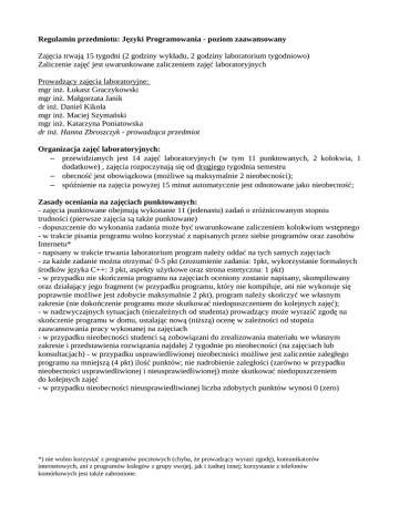 Regulamin przedmiotu: Języki Programowania - poziom zaawansowany Zajęcia trwają 15 tygodni (2 godziny wykładu, 2 godziny laboratorium tygodniowo) Zaliczenie zajęć jest uwarunkowane zaliczeniem zajęć laboratoryjnych Prowadzący zajęcia laboratoryjne: mgr inż. Łukasz Graczykowski mgr inż. Małgorzata Janik dr inż. Daniel Kikoła mgr inż. Maciej Szymański mgr inż. Katarzyna Poniatowska dr inż. Hanna Zbroszczyk - prowadząca przedmiot Organizacja zajęć laboratoryjnych: – przewidzianych jest 14 zajęć laboratoryjnych (w tym 11 punktowanych, 2 kolokwia, 1 dodatkowe) , zajęcia rozpoczynają się od drugiego tygodnia semestru – obecność jest obowiązkowa (możliwe są maksymalnie 2 nieobecności); – spóźnienie na zajęcia powyżej 15 minut automatycznie jest odnotowane jako nieobecność; Zasady oceniania na zajęciach punktowanych: - zajęcia punktowane obejmują wykonanie 11 (jedenastu) zadań o zróżnicowanym stopniu trudności (pierwsze zajęcia są także punktowane) - dopuszczenie do wykonania zadania może być uwarunkowane zaliczeniem kolokwium wstępnego - w trakcie pisania programu wolno korzystać z napisanych przez siebie programów oraz zasobów Internetu* - napisany w trakcie trwania laboratorium program należy oddać na tych samych zajęciach - za każde zadanie można otrzymać 0-5 pkt (zrozumienie zadania: 1pkt, wykorzystanie formalnych środków języka C++: 3 pkt, aspekty użytkowe oraz strona estetyczna: 1 pkt) - w przypadku nie skończenia programu na zajęciach oceniony zostanie napisany, skompilowany oraz działający jego fragment (w przypadku programu, który nie kompiluje, ani nie wykonuje się poprawnie możliwe jest zdobycie maksymalnie 2 pkt), program należy skończyć we własnym zakresie (nie dokończenie programu może skutkować niedopuszczeniem do kolejnych zajęć); - w nadzwyczajnych sytuacjach (niezależnych od studenta) prowadzący może wyrazić zgodę na skończenie programu w domu, ustalając nową (niższą) ocenę w zależności od stopnia zaawansowania pracy wykonanej na zajęciach - w przypadku nieobecności studenci są zobowiązani do zrealizowania materiału we własnym zakresie i przedstawienia rozwiązania najdalej 2 tygodnie po nieobecności (na zajęciach lub konsultacjach) - w przypadku usprawiedliwionej nieobecności możliwe jest zaliczenie zaległego programu na mniejszą (4 pkt) ilość punktów; nie nadrobienie zaległości (zarówno w przypadku nieobecności usprawiedliwionej i nieusprawiedliwionej) może skutkować niedopuszczeniem do kolejnych zajęć - w przypadku nieobecności nieusprawiedliwionej liczba zdobytych punktów wynosi 0 (zero) *) nie wolno korzystać z programów pocztowych (chyba, że prowadzący wyrazi zgodę), komunikatorów internetowych, ani z programów kolegów z grupy swojej, jak i żadnej innej; korzystanie z telefonów komórkowych jest także zabronione. Zasady oceniania kolokwiów: – w trakcie semestru będą 2 (dwa) kolokwia: jedno w połowie semestru, drugie na końcu; – kolokwium będzie polegało na napisaniu 1 (jednego) programu z materiału zrealizowanego na zajęciach (możliwe jest jednak korzystanie z: - własnych programów z zajęć, - materiałów wykładu dostępnych w trybie “offline” lub w wersji papierowej, - podręczników do programowania w C oraz C++, - własnych notatek); - napisany program należy przesłać przed końcem trwania kolokwium na adres e-mailowy prowadzącego; - program będzie oceniany w skali 0-20 pkt (pierwsze kolokwium) oraz w skali 0-25 pkt (drugie kolokwium); oceniane będą: - zakres merytoryczny zrealizowanego zadania, - wykorzystane środki formalne języka C++, - aspekty użytkowe interfejsu, - strona estetyczna; Istnieje możliwość poprawy kolokwium na ostatnich zajęciach (w grupie swojej lub innej), przy pierwszej poprawie kolokwium możliwe będzie zdobycie maksymalnie -5 pkt mniej niż w pierwszym terminie, przy drugiej poprawie – 10 pkt mniej. Zaliczenie obu kolokwiów jest jednym z warunków zaliczenia przedmiotu! (warunkiem zaliczenia kolokwium jest otrzymanie za jego napisanie ponad 50% punktów) Na ocenę końcowa przedmiotu wpływają: wyniki z kolokwium z laboratorium: 1 * 20 pkt + 1 * 25 pkt = 45 pkt; wyniki z programów napisanych na zajęciach 11 * 5 pkt = 55 pkt. Ocena końcowa wystawiana jest na podstawie procentowego udziału sumy Uzyskanych punktów do sumy punktów możliwej do uzyskania (100 pkt) wg. następującej zależności: >= 51% - 3.0 >= 61% - 3.5 >= 71% - 4.0 >= 81% - 4.5 >= 91% - 5.0 Na ostatnich (15) zajęciach osoby, którym brakuje do oceny o 0.5 (pół) stopnia wyższej nie więcej niż 5 pkt mogą poprawić się poprzez napisanie dodatkowego programu. Osoby uczęszczające na wykłady mogą mieć podwyższoną ocenę z przedmiotu o 0.5 oceny w przypadku zaliczonych zajęć laboratoryjnych. Zaliczenie eksternistyczne Dla osób programujących w C++ możliwe jest zaliczenie przedmiotu projektem eksternistycznym. Osoby chcące zaliczyć przedmiot w tej formie powinny zgłosić się do prowadzącego najdalej na drugich zajęciach laboratoryjnych, na trzecich zajęciach napiszą kolokwium kwalifikujące do pracy w tym trybie. Wymagania do projektów eksternistycznych: - nietrywialny problem, do którego rozwiązania najlepiej nadaje się podejście obiektowe, - dokładna specyfikacja projektu, - stworzony projekt z dokumentacją w kodzie źródłowym, - dokumentacja użytkownika. I) Zaliczenie projektu eksternistycznego polega na zaliczeniu 3 (trzech) etapów kontrolnych w terminach zajęć podanych w nawiasach: beta (5), release candidate (10), final (15). II) Po etapie beta prowadzący może projekt zdyskwalifikować, dlatego do tego czasu zalecane jest uczestniczenie w zajęciach programowych. III) Po etapie release candidate, w przypadku braku możliwości skończenia projektu zawierającego wszystkie elementy języka omawiane na wykładzie prowadzący może projekt zamknąć. Od tego mom