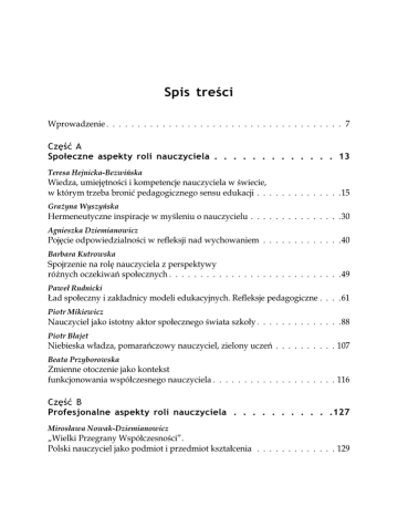 Spis treści Wprowadzenie . . . . . . . . . . . . . . . . . . . . . . . . . . . . . . . . . . . . . . 7 Część A Społeczne aspekty roli nauczyciela . . . . . . . . . . . . . 13 Teresa Hejnicka-Bezwińska Wiedza, umiejętności i kompetencje nauczyciela w świecie, w którym trzeba bronić pedagogicznego sensu edukacji . . . . . . . . . . . . . .15 Grażyna Wyszyńska Hermeneutyczne inspiracje w myśleniu o nauczycielu . . . . . . . . . . . . . . .30 Agnieszka Dziemianowicz Pojęcie odpowiedzialności w refleksji nad wychowaniem . . . . . . . . . . . . .40 Barbara Kutrowska Spojrzenie na rolę nauczyciela z perspektywy różnych oczekiwań społecznych . . . . . . . . . . . . . . . . . . . . . . . . . . . .49 Paweł Rudnicki Ład społeczny i zakładnicy modeli edukacyjnych. Refleksje pedagogiczne . . . .61 Piotr Mikiewicz Nauczyciel jako istotny aktor społecznego świata szkoły . . . . . . . . . . . . . .88 Piotr Błajet Niebieska władza, pomarańczowy nauczyciel, zielony uczeń . . . . . . . . . . 107 Beata Przyborowska Zmienne otoczenie jako kontekst funkcjonowania współczesnego nauczyciela . . . . . . . . . . . . . . . . . . . . 116 Część B Profesjonalne aspekty roli nauczyciela . . . . . . . . . . .127 Mirosława Nowak-Dziemianowicz „Wielki Przegrany Współczesności”. Polski nauczyciel jako podmiot i przedmiot kształcenia . . . . . . . . . . . . . 129 6 Nauczyciel: misja czy zawód? Społeczne i profesjonalne aspekty roli Jadwiga Kowalikowa Przygotowanie ogólnopedagogiczne oraz specjalistyczne jako składnik kompetencji zawodowej nauczyciela zdobywanej w ramach studiów z perspektywy polonisty . . . . . . . . . . . . 163 Anna Sajdak Modele nauczania – uczenia się w przygotowaniu dydaktycznym nauczycieli . . . . . . . . . . . . . . . . . . . 178 Jadwiga Kędzierska Profesjonalne kompetencje nauczyciela . . . . . . . . . . . . . . . . . . . . . . . 190 Anna Karłyk-Ćwik Kompetencje zawodowe wychowawców w pracy z agresywnymi nieletnimi. Propozycje udoskonaleń w procesie kształcenia pedagogów. . . . . . . . . . . 201 Iwona Hęćka Nauczyciele religii wobec rozwoju moralnego uczniów . . . . . . . . . . . . . 220 Małgorzata Rosin Pedagogia T. Gordona jako sposób usensawiania świata z punktu widzenia racjonalności emancypacyjnej . . . . . . . . . . . . . . . . . 232 Noty biograficzne . . . . . . . . . . . . . . . . . . . . . . . . . . . . . . . . . . . 244