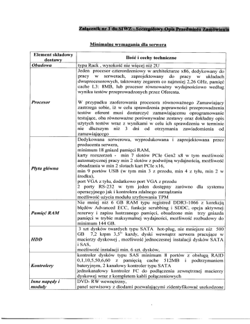 Minimalne wymagania dla serwera Element składowy dostawy Obudowa Procesor Ilość i cechy techniczne typu Rack , wysokość nie więcej niż 2U Jeden procesor czterordzeniowy w architekturze x86, dedykowany do pracy w serwerach, zaprojektowany do pracy w układach dwuprocesorowych, taktowany zegarem co najmniej 2,26 GHz, pamięć cache L3: 8MB, lub procesor równoważny wydajnościowo według wyniku testów przeprowadzonych przez Oferenta. W przypadku zaoferowania procesora równoważnego Zamawiający zastrzega sobie, iż w celu sprawdzenia poprawności przeprowadzenia testów oferent musi dostarczyć zamawiającemu oprogramowanie testujące, oba równoważne porównywalne zestawy oraz dokładny opis użytych testów wraz z wynikami w celu ich sprawdzenia w terminie me dłuższym niż 3 dni od otrzymania zawiadomienia od zamawiającego Płyta główna Dedykowana serwerowa, wyprodukowana 1 zaprojektowana przez producenta serwera, minimum 18 gniazd pamięci RAM, karty rozszerzeń - min 7 slotów PCie Gen2 x8 w tym możliwość automatycznej pracy min 2 slotów z podwójną wydajnością, możliwość obsadzania w min 2 slotach kart PC Ie x 16, min 9 portów USB (w tym min 3 z przodu, min 4 z tyłu, min 2 w środku), Pamięć RAM HDD Kontrolery Inne napędy moduły i port VGA z tyłu, dodatkowo port VGA z przodu 2 porty RS-232 w tym jeden dostępny zarówno dla systemu operacyjnego jak i kontrolera zdalnego zarządzania możliwość użycia modułu szyfrowania TPM Nie mniej niż 6 GB RAM typu registred DDR3-1066 z korekcją błędów Advanced ECC, funkcje scrubbing i SDDC, opcja aktywnej rezerwy i zapisu lustrzanego pamięci, obsadzone min trzy gniazda pamięci w trybie maksymalnej wydajności, możliwość rozbudowy do minimum 144 GB. 3 szt dysków twardych typu SATA hot-plug, nie mniejsze niż 500 GB 7,2 krpm 3,5" każdy, dyski wewnątrz serwera pracujące w macierzy dyskowej , możliwość jednoczesnej instalacji dysków SATA i SAS, możliwość instalacji min. 6 szt. dysków, kontroler dysków typu SAS minimum 8 portów z obsługą RAID 0,1,10,5,50,6,60 z pam1ęc1ą cache 512MB 1 podtrzymaniem bateryjnym, 2 kanałowy kontroler typu SATA jednokanałowy kontroler FC do podłączenia zewnętrznej macierzy dyskowej wraz z kompletem kabli połączeniowych DVD- RW wewnętrzny, panel serwisowy z diodami pozwalającymi zidentyfikować uszkodzone Element składowy dostawy Karta graficzna Karty sieciowe Zasilanie i chłodzenie Oprogramowanie Wsparcie dla systemów operacyinych Certyfikaty producenta Dokumentacja Gwarancja Inne Ilość i cechy techniczne elementy Zintegrowana, rozdzielczość min. 1600 x 1200 2 karty sieciowe typu Ethernet 10/100/1000 (akceleracja TCP/IP), rozruch PXE przez sieć LAN z serwera PXE, rozruch iSCSI przez zintegrowaną kartę sieci LAN, 1 karta Ethernet 10/1 OO wyłącznie dla komunikacji z kontrolerem zdalnego zarządzania Redundantne dwa zasilacze zgodne ze standardem EP A o efektywności mm 89% typu hot-plug, nadmiarowe chłodzenie - redundantne wentylatory typu hot-plug Oprogramowanie zarządzające i diagnostyczne wyprodukowane przez producenta serwera umożliwiające konfigurację kontrolera RAID, instalację systemów operacyjnych, zdalne zarządzanie, diagnostykę i przewidywanie awarii w oparciu o informacje dostarczane w ramach zintegrowanego w serwerze systemu umożliwiającego monitoring systemu i środowiska (temperatura, dyski, zasilacze itd.). Jest wymagana kompatybilność serwera z następującymi sieciowymi systemami operacyjnymi: Windows 2008, SUSE LINUX SLES-1 O X86, Red Hat LINUX RHEL5 X86 Certyfikat producenta ISO 9001 w zakresie projektowania, produkcji i serwisu produktów, CE oraz ISO 14001. Karty gwarancyjne, instrukcje, licencje oprogramowania, nośniki ze sterownikami 36 miesięcy, serwis w miejscu użytkowania serwera Dostarczony sprzęt musi być fabrycznie nowy, musi pochodzić z oficjalnego kanału sprzedaży producenta na rynek polski. Wymagane oświadczenie producenta że oferowany do przetargu sprzęt spełnia ten wymóg. Elementy, z których zbudowane są serwery muszą być produktami producenta tych serwerów lub być przez niego certyfikowane (wymagane oświadczenie producenta dołączone do oferty) oraz muszą być objęte gwarancjąproducenta, potwierdzoną przez oryginalne karty gwarancyjne. Oferent zobowiązany jest dostarczyć wraz z ofertą, szczegółową specyfikację techniczną oferowanego sprzętu. Dostępność części zamiennych przez 5 lat od momentu zakupu serwera ( oświadczenie producenta ) Macierz dyskowa Lp. Nazwa Minimalne wymagane parametry podzespołu I. Obudowa 2. Pojemność 3. Kontrolery 4. Interfejsy FC 5. Poziomy RAID 6. Wspierane dyski 1) System musi być dostarczony ze wszystkimi komponentami do instalacji w standardowej szafie rack I 9" z zajętością maks 2U w tej szafie. 2) Obudowa musi zawierać układ nadmiarowy dla modułów zasilania i chłodzenia umożliwiający wymianę tych elementów w razie awarii bez konieczności wyłączania macierzy 3) Obudowa powinna posiadać widoczne elementy sygnalizacyjne do informowania o stanie poprawnej pracy lub awarii/macierzy. 4) Maksymalna moc zasilania nie może przekraczać 800W dla maksymalnej możliwej konfiguracji macierzy. 5) Obudowa nie może zawierać elementów typu bateria/akumulator wymagających jakiegokolwiek reżimu obsługowego: wymiana, przełączanie, ładowanie, itp. 1) System musi być wyposażony w minimum 6 dysków o pojemności 750 GB każdy oraz ma umożliwiać instalację min 12 dysków formatu 3,5" wykonanych w technologii SAS lub NearLine-SAS. 2) System musi posiadać możliwość dołączania półek rozszerzeń umożliwiających uzyskanie sumarycznej pojemności do 24 dysków formatu 3,5". 3) System musi mieć możliwość rozbudowy o redundantny kontroler RAID bez utraty wcześniej zapisanych danych. 4) Macierz powinna posiadać możliwość późniejszej rozbudowy jak w pkt.2 wyłącznie poprzez zakup elementów sprzętowych