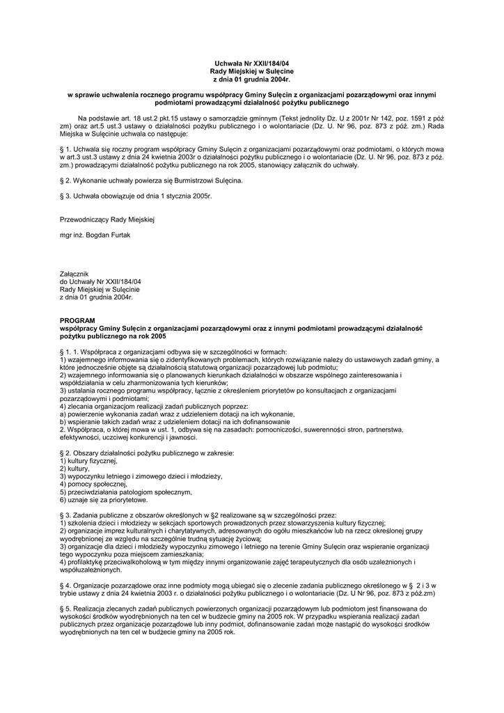 Uchwała Nr XXII/184/04 Rady Miejskiej w Sul cine z dnia 01 grudnia 2004r. w sprawie uchwalenia rocznego programu współpracy Gminy Sul cin z organizacjami pozarz dowymi oraz innymi podmiotami prowadz cymi działalno po ytku publicznego Na podstawie art. 18 ust.2 pkt.15 ustawy o samorz dzie gminnym (Tekst jednolity Dz. U z 2001r Nr 142, poz. 1591 z pó zm) oraz art.5 ust.3 ustawy o działalno ci po ytku publicznego i o wolontariacie (Dz. U. Nr 96, poz. 873 z pó . zm.) Rada Miejska w Sul cinie uchwala co nast puje: § 1. Uchwala si roczny program współpracy Gminy Sul cin z organizacjami pozarz dowymi oraz podmiotami, o których mowa w art.3 ust.3 ustawy z dnia 24 kwietnia 2003r o działalno ci po ytku publicznego i o wolontariacie (Dz. U. Nr 96, poz. 873 z pó . zm.) prowadz cymi działalno po ytku publicznego na rok 2005, stanowi cy zał cznik do uchwały. § 2. Wykonanie uchwały powierza si Burmistrzowi Sul cina. § 3. Uchwała obowi zuje od dnia 1 stycznia 2005r. Przewodnicz cy Rady Miejskiej mgr in . Bogdan Furtak Zał cznik do Uchwały Nr XXII/184/04 Rady Miejskiej w Sul cinie z dnia 01 grudnia 2004r. PROGRAM współpracy Gminy Sul cin z organizacjami pozarzdowymi oraz z innymi podmiotami prowadz cymi działalno po ytku publicznego na rok 2005 § 1. 1. Współpraca z organizacjami odbywa si w szczególno ci w formach: 1) wzajemnego informowania si o zidentyfikowanych problemach, których rozwi zanie nale y do ustawowych zada gminy, a które jednocze nie obj te s działalno ci statutow organizacji pozarz dowej lub podmiotu; 2) wzajemnego informowania si o planowanych kierunkach działalno ci w obszarze wspólnego zainteresowania i współdziałania w celu zharmonizowania tych kierunków; 3) ustalania rocznego programu współpracy, ł cznie z okre leniem priorytetów po konsultacjach z organizacjami pozarz dowymi i podmiotami; 4) zlecania organizacjom realizacji zada publicznych poprzez: a) powierzenie wykonania zada wraz z udzieleniem dotacji na ich wykonanie, b) wspieranie takich zada wraz z udzieleniem dotacji na ich dofinansowanie 2. Współpraca, o której mowa w ust. 1, odbywa si na zasadach: pomocniczo ci, suwerenno ci stron, partnerstwa, efektywno ci, uczciwej konkurencji i jawno ci. § 2. Obszary działalno ci po ytku publicznego w zakresie: 1) kultury fizycznej, 2) kultury, 3) wypoczynku letniego i zimowego dzieci i młodzie y, 4) pomocy społecznej, 5) przeciwdziałania patologiom społecznym, 6) uznaje si za priorytetowe. § 3. Zadania publiczne z obszarów okre lonych w §2 realizowane s w szczególno ci przez: 1) szkolenia dzieci i młodzie y w sekcjach sportowych prowadzonych przez stowarzyszenia kultury fizycznej; 2) organizacje imprez kulturalnych i charytatywnych, adresowanych do ogółu mieszka ców lub na rzecz okre lonej grupy wyodr bnionej ze wzgl du na szczególnie trudn sytuacj yciow; 3) organizacje dla dzieci i młodzie y wypoczynku zimowego i letniego na terenie Gminy Sul cin oraz wspieranie organizacji tego wypoczynku poza miejscem zamieszkania; 4) profilaktyk przeciwalkoholow w tym mi dzy innymi organizowanie zaj terapeutycznych dla osób uzale nionych i współuzale nionych. § 4. Organizacje pozarz dowe oraz inne podmioty mog ubiega si o zlecenie zadania publicznego okre lonego w § 2 i 3 w trybie ustawy z dnia 24 kwietnia 2003 r. o działalno ci po ytku publicznego i o wolontariacie (Dz. U Nr 96, poz. 873 z pó .zm) § 5. Realizacja zlecanych zada publicznych powierzonych organizacji pozarz dowym lub podmiotom jest finansowana do wysoko ci rodków wyodr bnionych na ten cel w bud ecie gminy na 2005 rok. W przypadku wspierania realizacji zada publicznych przez organizacje pozarz dowe lub inny podmiot, dofinansowanie zada mo e nast pi do wysoko ci rodków wyodr bnionych na ten cel w bud ecie gminy na 2005 rok.