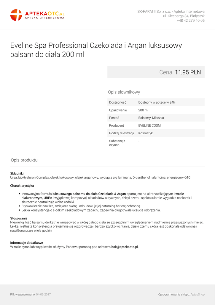 SK-FARM II Sp. z o.o. - Apteka Internetowa ul. Kleeberga 34, Białystok +48 42 279 40 05 Eveline Spa Professional Czekolada i Argan luksusowy balsam do ciała 200 ml Cena: 11,95 PLN Opis słownikowy Dostępność Dostępny w aptece w 24h Opakowanie 200 ml Postać Balsamy, Mleczka Producent EVELINE COSM Rodzaj rejestracji Kosmetyk Substancja czynna - Opis produktu Składniki Urea, bioHyaluron Complex, olejek kokosowy, olejek arganowy, wyciąg z alg laminaria, D-panthenol i alantoina, energisomy Q10 Charakterystyka Innowacyjna formuła luksusowego balsamu do ciała Czekolada & Argan oparta jest na ultranawilżającym kwasie hialuronowym, UREA i wyjątkowej kompozycji składników aktywnych, dzięki czemu spektakularnie wygładza naskórek i skutecznie neutralizuje wolne rodniki. Błyskawicznie nawilża, zmiękcza skórę i odbudowuje jej naturalną barierę ochronną. Lekka konsystencja o słodkim czekoladowym zapachu zapewnia długotrwałe uczucie odprężenia. Stosowanie Niewielką ilość balsamu delikatnie wmasować w skórę całego ciała ze szczególnym uwzględnieniem nadmiernie przesuszonych miejsc. Lekka, nietłusta konsystencja przyjemnie się rozprowadza i bardzo szybko wchłania, dzięki czemu skóra jest doskonale odżywiona i nawilżona przez wiele godzin. Informacje dodatkowe W razie pytań lub wątpliwości służymy Państwu pomocą pod adresem [email protected]. Plik wygenerowano: 04-03-2017 Powered by TCPDF (www.tcpdf.org) Oprogramowanie sklepu: AptusShop
