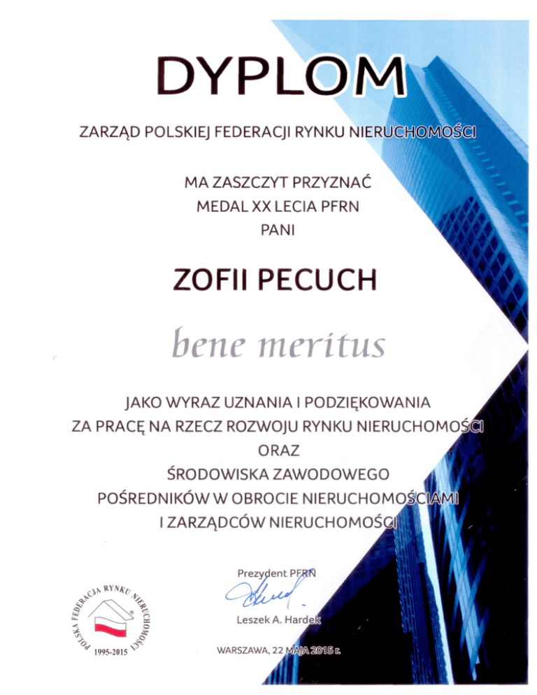 DYPLOM ZARZĄD POLSKIEJ FEDERACJI RYNKU NIERUCHOMOŚCI MA ZASZCZYT PRZYZNAĆ MEDAL XX LECIA PFRN PANI ZOFII PECUCH bene meritus JAKO WYRAZ UZNANIA I PODZIĘKOWANIA ZA PRACĘ NA RZECZ ROZWOJU RYNKU NIERUCHOMOŚCI ORAZ ŚRODOWISKA ZAWODOWEGO POŚREDNIKÓW W OBROCIE NIERUCHOMOŚCIAMI I ZARZĄDCÓW NIERUCHOMOŚCI Leszek A. Hardek WARSZAWA, 22 MAJA