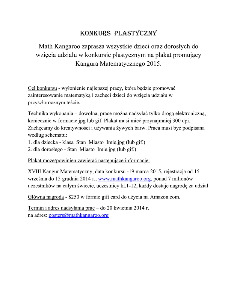 Konkurs Plastyczny Math Kangaroo zaprasza wszystkie dzieci oraz dorosłych do wzięcia udziału w konkursie plastycznym na plakat promujący Kangura Matematycznego 2015. Cel konkursu - wyłonienie najlepszej pracy, która będzie promować zainteresowanie matematyką i zachęci dzieci do wzięcia udziału w przyszłorocznym teście. Technika wykonania – dowolna, prace można nadsyłać tylko drogą elektroniczną, koniecznie w formacie jpg lub gif. Plakat musi mieć przynajmniej 300 dpi. Zachęcamy do kreatywności i używania żywych barw. Praca musi być podpisana wedlug schematu: 1. dla dziecka - klasa_Stan_Miasto_Imię.jpg (lub gif.) 2. dla dorosłego - Stan_Miasto_Imię.jpg (lub gif.) Plakat może/powinien zawierać następujące informacje: XVIII Kangur Matematyczny, data konkursu -19 marca 2015, rejestracja od 15 września do 15 grudnia 2014 r., www.mathkangaroo.org, ponad 7 milionów uczestników na całym świecie, uczestnicy kl.1-12, każdy dostaje nagrodę za udział Główna nagroda - $250 w formie gift card do użycia na Amazon.com. Termin i adres nadsyłania prac – do 20 kwietnia 2014 r. na adres: [email protected]