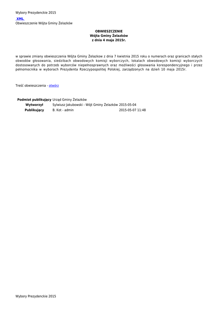 Wybory Prezydenckie 2015 XML Obwieszczenie Wójta Gminy Żelazków OBWIESZCZENIE Wójta Gminy Żelazków z dnia 4 maja 2015r. w sprawie zmiany obwieszczenia Wójta Gminy Żelazkow z dnia 7 kwietnia 2015 roku o numerach oraz granicach stałych obwodów głosowania, siedzibach obwodowych komisji wyborczych, lokalach obwodowych komisji wyborczych dostosowanych do potrzeb wyborców niepełnosprawnych oraz możliwości głosowania korespondencyjnego i przez pełnomocnika w wyborach Prezydenta Rzeczypospolitej Polskiej, zarządzonych na dzień 10 maja 2015r. Treść obwieszczenia - otwórz Podmiot publikujący Urząd Gminy Żelazków Wytworzył Sylwiusz Jakubowski - Wójt Gminy Żelazków 2015-05-04 Publikujący B. Kot - admin Wybory Prezydenckie 2015 2015-05-07 11:48