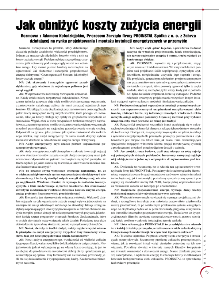 Jak obniżyć koszty zużycia energii M A L K E R NP: Audyt, czyli „plan” to jedno, a prawdziwa trudność zaczyna się w trakcie projektowania, kiedy obowiązujące, nie zawsze racjonalne przepisy i normy, trzeba odnieść do konkretnego obiektu. AK: PROINSTAL wywodzi się z projektowania, mając w tym zakresie 17 lat doświadczeń. We wszystkich fazach projektu nasi projektanci ściśle współpracują z przyszłym użytkownikiem, uwzględniając wszystkie jego sugestie i uwagi. Dla przykładu, generalnym założeniem przyjmowanym przez nas przy projektowaniu systemów grzewczych jest zastosowanie takich rozwiązań, które pozwolą ogrzewać tylko te części zakładu, które są niezbędne, tylko wtedy, kiedy jest to potrzebne i tylko do takich temperatur, które są wymagane. Podobne założenie towarzyszy projektowaniu wszystkich innych instalacji mających wpływ na koszty produkcji i funkcjonowania zakładu. NP: Producenci urządzeń wyposażenia instalacji przemysłowych zarzucili nas supernowoczesnymi urządzeniami naszpikowanymi elektroniką, z których każde, wg informacji zawartych w folderach reklamowych, osiąga najlepsze parametry. Czym się kierować przy wyborze urządzeń, żeby mieć pewność, że zakup jest trafny? AK: Rzeczywiści producenci wszystkich branż prześcigają się w wykresach udowadniających korzyści płynące z zakupu ich produktu w stosunku do konkurencji. Dlatego też, na specjalistycznym rynku urządzeń, instalacji i systemów energetycznych dla przemysłu, pomiędzy producentem a użytkownikiem jest miejsce dla takich firm jak nasza. Firm zatrudniających specjalistów mogących w interesie klienta podjąć merytoryczną dyskusję z producentami urządzeń przed podjęciem decyzji o zakupie. NP: Jest projekt, teraz budowa, czyli etap niosący za sobą najwięcej potencjalnych różnych problemów. Inwestorzy zazwyczaj najchętniej oddają temat w jedne ręce od projektu do wykonawstwa, pod tzw. klucz. AK: Doskonale to rozumiemy, bo to właśnie ten typ inwestorów stworzył takie firmy jak PROINSTAL. Posiadamy doświadczoną kadrę kierowniczą, wyspecjalizowane brygady montażowe zarówno w zakresie instalacji technologicznej, jak i automatyki, posiadamy specjalistyczny sprzęt i pracujemy wg standardów normy ISO 9001, biorąc pełną odpowiedzialność za realizowane zadanie od koncepcji po uruchomienie. NP: Racjonalne gospodarowanie energią wymaga dużej wiedzy technicznej pracowników użytkownika w tym zakresie. AK: Większość stosowanych rozwiązań nie wymaga specjalistycznej obsługi, a szczegółowe instrukcje oraz szkolenia pracowników użytkownika muszą gwarantować, że po ostatecznym przekazaniu systemu energetycznego do eksploatacji będzie on w pełni zrozumiały, przyjazny w użytkowaniu i umożliwi oszczędne gospodarowanie energią. Dodatkowo do dyspozycji naszych klientów stawiamy wyspecjalizowany serwis, gotowy rozwiązać każdy problem w zakresie instalacji na terenie zakładu. NP: Lista referencyjna PROINSTALU to przedsiębiorstwa niemalże z każdej dziedziny przemysłu, a realizowane w nich zadania dotyczą kompleksowych modernizacji. W czym tkwi tajemnica sukcesu? AK: To żadna tajemnica. Po prostu znamy się na energetyce i instalacjach przemysłowych. Rozumiemy problemy zakładów przemysłowych, wiemy, jak je rozwiązać i skąd wziąć pieniądze potrzebne na ich rozwiązanie. Potrafimy również w interesie naszych klientów kompetentnie i twardo rozmawiać z dostawcami energii. Nasze działania przynoszą oszczędności, a wydatki na energię to znaczące koszty w całkowitych kosztach funkcjonowania wielu zakładów. PROINSTAL to sprawdzony fachowiec w przemyśle. 3 Szukanie oszczędności to problem, który determinuje aktualnie politykę działalności większości przedsiębiorstw. Jednym ze znaczących składników kosztów wielu z nich są koszty zużycia energii. Problem nabiera szczególnego znaczenia, jeśli weźmiemy pod uwagę ciągły wzrost cen nośników energii. Czy można jeszcze bardziej zaoszczędzić na ogrzewaniu? Jak skutecznie i oszczędnie gospodarować energią elektryczną? Czym ogrzewać? Słowem, jak obniżyć koszty zużycia energii? NP: Jak skutecznie i oszczędnie ogrzewać przedsiębiorstwo, gdy wiadomo że najtańszym paliwem jest wciąż węgiel? AK: W ogrzewnictwie nie istnieją rozwiązania uniwersalne. Każdy obiekt należy rozpatrywać indywidualnie. Nowoczesna technika grzewcza daje wiele możliwości skutecznego ogrzewania, a zastosowanie najtańszego paliwa nie musi oznaczać najniższych jego kosztów. Określając koszty eksploatacji przy zastosowaniu poszczególnych paliw należy uwzględnić szereg innych kosztów, które pociąga ich stosowanie, takie jak koszty obsługi czy opłaty za gospodarcze korzystanie ze środowiska. Węgiel, choć w wielu przypadkach bezkonkurencyjny i najwłaściwszy, znacznie ogranicza możliwości zastosowania wielu nowoczesnych urządzeń pozwalających na racjonalne gospodarowanie energią cieplną. Odpowiedź na pytanie, jakie paliwo i jaki system zastosować dla konkretnego obiektu, daje audyt energetyczny. Ta sama zasada dotyczy wyboru kierunków działania w celu obniżenia zużycia energii elektrycznej. NP: Audyt energetyczny, czyli analiza potrzeb i opłacalności poszczególnych rozwiązań. AK: Audyt energetyczny, czyli biznesplan w zakresie inwestycji mającej na celu obniżenie kosztów zużycia energii. Audyt energetyczny musi jednoznacznie odpowiadać na pytanie: na co opłaca się wydać pieniądze, ile trzeba wydać i po jakim okresie się to zwróci, a także wskazać możliwe źródła finansowania inwestycji? NP: To ostatnie chyba wszystkich interesuje najbardziej. To, że w wielu przedsiębiorstwach system ogrzewania jest nieefektywny i nieekonomiczny, i że da się obniżyć zużycie energii elektrycznej, nie ulega wątpliwości. Wiadomo również, że wymaga to nakładów inwestycyjnych, a takie modernizac