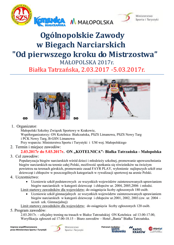 Ogólnopolskie Zawody w Biegach Narciarskich "Od pierwszego kroku do Mistrzostwa” MAŁOPOLSKA 2017r. Białka Tatrzańska, 2.03.2017 -5.03.2017r. OD DO 1. Organizator: Małopolski Szkolny Związek Sportowy w Krakowie, Współorganizatorzy: ON Kotelnica Białczańska, PSZS Limanowa, PSZS Nowy Targ i PCK Nowy Targ, B-GSN Limanowa Przy wsparciu: Ministerstwa Sportu i Turystyki i UM woj. Małopolskiego 2. Termin i miejsce zawodów: 2.03.2017r do 5.03.2017r. ON „KOTELNICA”- Białka Tatrzańska - Małopolska 3. Cel zawodów: Popularyzacja biegów narciarskich wśród dzieci i młodzieży szkolnej, promowanie upowszechniania biegów narciarskich na terenie całej Polski, możliwość spotkania się rówieśników na świeżym powietrzu na terenach górskich, promowanie zasad FAYR PLAY, wyłonienie najlepszych szkół oraz dziewcząt i chłopców w poszczególnych kategoriach w rywalizacji sportowej na arenie Polski. 4. Uczestnictwo: Uczniowie szkół podstawowych ze wszystkich województw zainteresowanych uprawianiem biegów narciarskich w kategorii dziewcząt i chłopców ur. 2004, 2005,2006 i młodsi. Limit startowy zawodników dla województw; do osiągnięcia liczby zgłoszonych 180 osób. Uczniowie szkół gimnazjalnych ze wszystkich województw zainteresowanych uprawianiem biegów narciarskich w kategorii dziewcząt i chłopców ur.2001, 2002, 2003.(ew. ur. 2004 – uczeń szk. Gimnazjalnej) Limit startowy zawodników dla województw; do osiągnięcia liczby zgłoszonych 120 osób. 5. Program zawodów: 2.03.2017r. – oficjalny trening na trasach w Białce Tatrzańskiej ON Kotelnica od 13.00-17.00, Weryfikacja zgłoszeń od 17.00-18.15 – Biuro zawodów – Hotel „Bania” Białka Tatrzańska. Impreza współfinansowana przez Ministerstwo Sportu i Turystyki Patronat medialny: odprawa techniczna, losowanie – godz. 18.30 03.03.2017r. – bieg stylem klasycznym dystans 2km, 1km,- dla SP , 3km – Gimn. 04.03.2017r.- bieg stylem dowolnym dystans 3km, 2km - dla SP , 5km – Gimn. 05.03.2017r. – bieg sztafetowy 4 x 2km MIX ( 2 x 2km styl Cl + 2 x 2km styl F ) –SP bieg sztafetowy 4 x 3km MIX ( 2 x 3km styl Cl + 2 x 3km styl F ) – Szkoły Gimnazjalne /dziewcząt, chłopców. Uwaga. Biegi indywidualne będą rozgrywane w formie startu co 30 sekund. Biegi sztafetowe – start ze wspólnego startu w poszczególnych kategoriach wiekowych. 6. Koszty organizacyjne : Pokrywa MSZS Kraków ze środków MSiT, UM woj. Małopolskiego oraz ze środków partnerów imprezy. Koszty uczestnictwa w zawodach – poszczególne szkoły we własnym zakresie. 7. ZGŁOSZENIA – należy kierować drogą elektroniczną na adres: [email protected], ( na druku zamieszczonym na stronie organizatora) lub listownie do : Małopolski SZS Kraków ul. Powstania Warszawskiego 6, 31-549 Kraków. Oryginały zgłoszenia potwierdzone przez Dyrektora Szkoły będą przyjmowane w 1 dniu na odprawie technicznej w godzinach od 17.00 -18.00 w Biurze Zawodów. 8. Zakwaterowanie i wyżywienie :We własnym zakresie uczestników, ekip szkolnych i wojewódzkich. 9. Nagrody: Organizator przewiduje nagrody w formie dyplomów, medali i pucharów, oraz ew. nagród rzeczowych pozyskanych od sponsorów. 10.Punktacja łączna zespołowa szkół: z biegów indywidualnych+ sztafetowych wg. Klucza; I m- 13pkt, IIm- 11 pkt, IIIm- 10 pkt, IV m- 9 pkt ...XII m - 1pkt. 11. Postanowienia końcowe: Zawody zostaną przeprowadzone zgodnie z NRS, Reg. SZS i zapowiedzią zawodów. Wyjątek stanowi zapis : W biegu stylem klasycznym obowiązkowo należy startować na sprzęcie do stylu klasycznego ( narty, buty, kije). Ostateczna interpretacja regulaminu należy do Jury Zawodów. Zarządy wojewódzkie SZS ,proszone są o rozpropagowanie w/w imprezy i pomoc w udziale zainteresowanych szkól w zawodach. W wypadku niekorzystnych warunków śniegowych, atmosferycznych – organizator zastrzega sobie prawo zmiany miejsca i terminu rozgrywania zawodów. ( Trasy zastępcze – COS Zakopane lub CSZ Ptaszkowa). 12. Pozostałe informacje organizacyjno-sportowe można uzyskać na stronie internetowej: mszs.krakow.pl lub skipol.pl. Ostateczna decyzja o miejscu organizacji zawodów, ewentualnych kosztach dopłaty zostanie przekazana zgłoszonym ekipom na 5 dni przed zawodami. Telefony kontaktowe : (12) 411-51-19 i u Kierownik Zawodów Feliks Piwowar – 608 206 220 lub DT PZN Stanisław Mrowca -604 14 74 59. Za Komitet Organizacyjny Kierownik Zawodów mgr Feliks Piwowar Impreza współfinansowana przez Ministerstwo Sportu i Turystyki Patronat medialny: