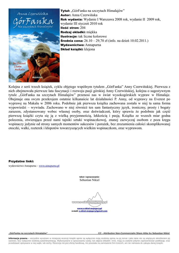 Tytuł: „GórFanka na szczytach Himalajów” Autor: Anna Czerwińska Rok wydania: Wydanie I Warszawa 2008 rok, wydanie II 2009 rok, wydanie III styczeń 2010 rok Ilość stron: 204 Rodzaj okładki: miękka Ilustracje: tak liczne kolorowe Średnia cena: 26.10 – 29,70 zł (info. na dzień 10.02.2011.) Wydawnictwo: Annapurna Skład książki: klejona Kolejna z serii trzech książek, cyklu objętego wspólnym tytułem „GórFanka” Anny Czerwińskiej. Pierwsza z nich obejmowała pierwsze lata fascynacji i rozwoju pasji górskiej Anny Czerwińskiej, kolejna o sugestywnym tytule „GórFanka na szczytach Himalajów” przenosi nas w świat wysokogórskich wypraw w Himalaje. Obejmuje ona swym przekrojem ostatnie kilkanaście lat działalności P. Anny, od wyprawy na Everest po wyprawę na Makalu w 2006 roku. Podobnie jak pierwsza książka zachowana została w niej ta sama forma wypowiedzi – wywiadu. Zachowano w niej również ten sam fantastyczny język, ironiczny, prosty i bogaty zarazem, zdystansowany wobec własnej osoby, oraz doświadczeń, który sprawia że podobnie jak część pierwszą książki czyta się ją z wielką przyjemnością, lekkością i pasją. Książka ze wszech miar godna polecenia, otwierająca przed nami tajniki sztuki wspinaczkowej, znanej zazwyczaj osobom z poza kręgu wspinaczy jedynie od strony samych momentów sukcesów i porażek, bez zrozumienia całości skomplikowanej otoczki, walki, rozterek i kłopotów towarzyszących wielkim wspinaczkom, oraz wyprawom. Przydatne linki: wydawnictwo Annapurna – www.annapurna.pl tekst i opracowanie: Sebastian Nikiel www.s-nikiel-mojegory.pl e-mail: [email protected] „GórFanka na szczytach Himalajów” CC - Attribution Non-Commercialm Share Alike by Sebastian Nikiel Informacja prawna – wszystkie wyrażane w niniejszej recenzji książki opinie są wyłącznie moją osobistą opinią na jej temat i jako takie nie są wiążącym określeniem jej wartości, lecz wyłącznie osobistą autointerpretacją. Wykorzystane w opracowaniu cytaty, lub zdjęcia okładek i inne, mają za zadanie jedynie zaprezentować publikację, oraz przedstawić opisywane w niej wątki, lub cechy. Recenzja nie jest ofertą handlową, nie powstała na zamówienie firm trzecich, ani nie namawia do zakupu danej książki.