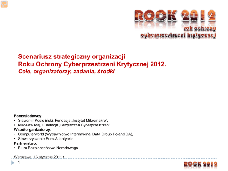 Scenariusz strategiczny organizacji Roku Ochrony Cyberprzestrzeni Krytycznej 2012. Cele, organizatorzy, zadania, środki Pomysłodawcy: • Sławomir Kosieliński, Fundacja „Instytut Mikromakro”, • Mirosław Maj, Fundacja „Bezpieczna Cyberprzestrzeń” Współorganizatorzy: • Computerworld (Wydawnictwo International Data Group Poland SA), • Stowarzyszenie Euro-Atlantyckie. Partnerstwo: • Biuro Bezpieczeństwa Narodowego Warszawa, 13 stycznia 2011 r. 1 ORGANIZATORZY 2 DEKLARACJA 3 MISJA ROCK ROCK ROCK 4 • Przygotować rekomendacje dla Prezydenta RP, w jakich okolicznościach można wprowadzić jeden ze stanów nadzwyczajnych w przypadku ataku w cyberprzestrzeni • Sprawdzić gotowość klasycznego systemu zarządzania kryzysowego do reagowania po ataku cybernetycznym • Zwiększyć zaufanie między przedsiębiorcami a sektorem publicznym przy przeciwdziałaniu zagrożeniom z cyberprzestrzeni ZADANIA Porozumienie między współorganizatorami grudzień 2011 Organizacja konwersatoriów, webinariów i głównej konferencji WiB Kampania promocyjna w mediach Prośba o partnerstwo BBN grudzień 2011 Pozyskanie głównych partnerów biznesowych 5 Uzgodnienie zasad współpracy merytorycznej z instytucjami rządowymi i międzynarodowymi Monitoring stanu bezpieczeństwa podczas EURO 2012 Konferencja „Wolność i bezpieczeństwo” 19 – 21 września 2012 Ćwiczenia z ochrony cyberprzestrzeni podczas „WiB” KONWERSATORIUM „PIĘĆ ŻYWIOŁÓW” Fundacja Bezpieczna cyberprzestrzeń, Computerworld i Fundacja „Instytut Mikromakro” w ramach ogłoszonego przezeń Roku Ochrony Cyberprzestrzeni Krytycznej (ROCK 2012) zapraszają do udziału w pracach konwersatorium „Pięć żywiołów”. Dzisiaj na bezpieczeństwo należy patrzyć nie tylko przez pryzmat zapanowania nad czterema, starożytnymi żywiołami – wodą, ogniem, powietrzem i ziemią, ale również należy mieć baczenie na piąty żywioł: cyberprzestrzeń. Podczas naszych spotkań przeanalizujemy stan bezpieczeństwa infrastruktury krytycznej w Polsce i na świecie, ocenimy koncepcje ochrony cyberprzestrzeni i przygotujemy kilka scenariuszy treningu/ćwiczeń w tej materii. Z jednego z nich skorzystamy w dniach 19 – 21 września 2012 r. na IX Konferencji „Wolność i bezpieczeństwo”. Uczestnicy Konwersatorium opracują nade wszystko rekomendacje dla Prezydenta RP, w jakich okolicznościach można wprowadzić jeden ze stanów nadzwyczajnych w przypadku ataku w cyberprzestrzeni oraz przedstawią wnioski z oceny stanu bezpieczeństwa na EURO 2012 w Polsce i na Ukrainie oraz na XXX Letnich Igrzyskach Olimpijskich w Londynie. Zarazem miło nam poinformować, że konwersatorium pełni zaszczytną funkcję Rady Programowej konferencji „Wolność i bezpieczeństwo”. 6 SPOTKANIA KONWERSATORIUM SPOTKANIA KONWERSATORIUM 23 lutego 2012 r: przedstawienie koncepcji ćwiczeń ochrony cyberprzestrzeni oraz stanu ochrony cyberprzestrzeni na świecie (2 godziny) w ramach konferencji SEMAFOR - Security Management Audit Forum, Warszawa, Hotel Courtyard by Marriott, 23-24 lutego 2012 r. 2 kwietnia 2012 r.: praca nad wstępnym scenariuszem oraz najlepsze praktyki bezpieczeństwa teleinformatycznego w firmach zarządzających infrastrukturą krytyczną (4 godziny). Temat główny: Bezpieczeństwo w energetyce. 14 maj 2012 prezentacja wstępnego scenariusza oraz praca nad dopracowaniem scenariusza. Notabene wówczas odbędzie się w Polsce Cyber Defence Leaders Forum (CDLF’12), który poprzedzi organizowane corocznie przez NATO w państwach członkowskich eksperckie warsztaty NATO Cyber Defence Workshop (NCDW’12). 4 czerwca 2012 r.: prezentacja dopracowanego scenariusza. Temat główny: współpraca sektora prywatnego i sektora publicznego w zakresie ochrony cyberprzestrzeni (4 godziny) 3 września 2012 r.: koncepcyjne przeprowadzenie ćwiczeń (tzw. dry run), podsumowanie końcowych przygotowań do ćwiczeń i konferencji „Wolność i bezpieczeństwo”, generalne wnioski, ocena stanu bezpieczeństwa na EURO 2012 i igrzyskach olimpijskich 19 – 21 września 2012 r.: konferencja „Wolność i bezpieczeństwo”; ćwiczenia; uzgodnienie rekomendacji dla Prezydenta RP. 15 października 2012 r.: spotkanie pokonferencyjne, podsumowanie ćwiczeń. Raport końcowy z ROCK 2012. Rekomendacje dla Prezydenta RP. 7 ZESPÓŁ DS. ĆWICZEŃ OCHRONY CYBERPRZESTRZENI Przed uczestnikami konwersatorium stoi specjalne zadanie, jakim jest opracowanie założeń treningu/ćwiczeń ochrony cyberprzestrzeni. Wymaga to większego zaangażowania, toteż pod wodzą Mirosława Maja (Fundacja Bezpieczna Cyberprzestrzeń) powołujemy specjalny zespół, który zajmie się technicznymi aspektami ćwiczeń. Postępy w pracach nad założeniami ćwiczeń będą przedstawiane na kolejnych spotkaniach konwersatorium. 8 MECHANIZM DZIAŁANIA ROCK – RELACJE MIĘDZY PARTNERAMI 9 MECHANIZM DZIAŁANIA ROCK – RELACJE MIĘDZY IMPREZAMI Zespół ds. ćwiczeń ochrony cyberprzestrzeni Konwersatorium Pięć żywiołów 10 ORGANIZACJE I EKSPERCI ORGANIZACJE, KTÓRE POPROSIMY O AKTYWNY UDZIAŁ W ROCK 2012 EKSPERCI, KTÓRYCH ZAPROSIMY DO WSPÓŁPRACY (LISTA IN STATU NASCENDI) • • • • • • • • • • • • • • • • • • • • • • • • • • ENISA DHS NATO Estonian Defense League Stowarzyszenie Euro-atlantyckie CERT POLSKA MIL CERT CERT.GOV.PL Rządowe Centrum Bezpieczeństwa Agencja Bezpieczeństwa Wewnętrznego Ministerstwo Administracji I Cyfryzacji Ministerstwo Spraw Wewnętrznych Ministerstwo Gospodarki Ministerstwo Obrony Narodowej Mehis Hakkaja, Estonian Defense League Krzysztof Silicki, NASK Wiesław Paluszynski, PTI Piotr Rutkowski, Instytut Mikromakro Sławomir Michalczuk, Urząd Miejski w Gdańsku Marcin Burda, Lechia Operator Antoni Mielniczuk, Instytut Mikromakro Andrzej Gontarz, Computerworld Krzysztof Komorowski, Instytut Mikromakro Piotr Sienkiewicz, Akademia Obrony Narodowej Tomasz Piktel, Motorola Solut