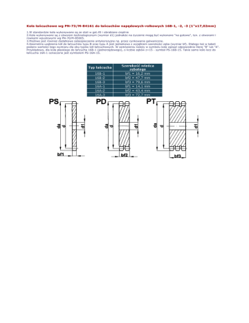 Koła łańcuchowe wg PN-73/M-84161 do łańcuchów napędowych-rolkowych 16B-1, -2, -3 (1"x17,02mm) 1.W standardzie koła wykonywane są ze stali w gat.45 i obrabiane cieplnie 2.Koła wykonywane są z otworem technologicznym (wymiar d1) jednakŜe na Ŝyczenie mogą być wykonane "na gotowo", tzn. z otworami i rowkami wpustowymi wg PN-70/M-85005. 3.MoŜliwe jest równieŜ dodatkowe zabezpieczenie antykorozyjne np. przez cynkowanie galwaniczne. 4.Geometria uzębienia kół do łańcuchów typu B oraz typu A jest jednakowa z wyjątkiem szerokości zęba (wymiar bf). Dlatego teŜ w tabeli podano wartości tego wymiaru dla obu typów kół łańcuchowych. W zamówieniu naleŜy w symbolu koła wpisać odpowiednio literę "B" lub "A". Przykładowo, dla koła płaskiego do łańcucha 16B-1 (jednorzędowego), o liczbie zębów z=15 - symbol PS-16B-15. Takie samo koło lecz do łańcucha 16A-1 oznaczone jest symbolem PS-16A-15.