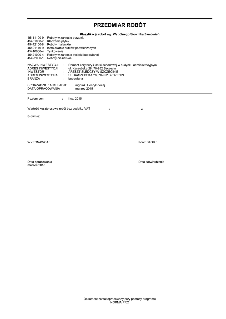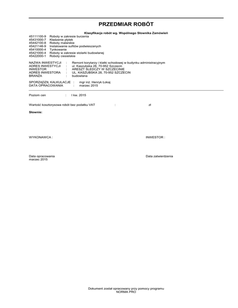 Klasyfikacja robót wg. Wspólnego Słownika Zamówień