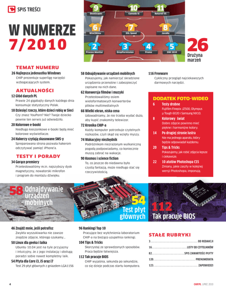 SPIS TREŚCI W NUMERZE 7/2010 26 Drużyna marzeń TEMAT NUMERU 26 Najlepsza jedenastka Windows CHIP prezentuje superligę narzędzi wzbogacających system. AKTUALNOŚCI 12 Głód danych PL Prawie 24 gigabajty danych każdego dnia konsumuje statystyczny Polak. 18 Dziesięć rzeczy, które dzieci robią w Sieci Czy znasz YouPorn? Nie? Twoje dziecko pewnie ten serwis już odwiedziło. 20 Kolorowe e-booki Niedługo kieszonkowe e-booki będą mieć kolorowe wyświetlacze. 24 Hakerzy czytają skasowane SMS-y Spreparowana strona pozwala hakerom odczytywać pamięć iPhone’a. TESTY I PORADY 34 Gorące premiery Przetestowaliśmy m.in. najszybszy dysk magnetyczny, nowatorski mikrofon i program do montażu dźwięku. 58 Odnajdywanie urządzeń mobilnych Pokazujemy, jak namierzyć skradzione urządzenia przenośne i zabezpieczyć zapisane na nich dane. 116 Freeware Cykliczny przegląd najciekawszych darmowych narzędzi. 62 Konwersja filmów i muzyki Przetestowaliśmy osiem wieloformatowych konwerterów plików multimedialnych DODATEK FOTO-WIDEO 6 Fujifilm Finepix JZ500, Olympus 66 Wielki ekran, niska cena Udowadniamy, że nie trzeba wydać dużo, aby kupić znakomity telewizor. μ Tough 6020 i Samsung NX10. 8 Każdy komputer potrzebuje czytelnych rozkazów, czyli skąd się wzięły myszy. piękne i harmonijne kolory. 14 Po drugiej stronie lustra Nie ma jednego aparatu, który 74 Wakacyjny niezbędnik Podróżnikom niezrażonym wulkaniczną pogodą podpowiadamy, co koniecznie muszą zabrać na wakacje. będzie odpowiadał każdemu. 20 Tips & Tricks Pokazujemy, jak robić zdjęcia lepsze i ciekawsze. 90 Kosmos i science fiction To, co jeszcze do niedawna było czystą fantazją, może niedługo stać się rzeczywistością. 54 mobilnych Kolorowy świat Dobre zdjęcie powinno mieć 72 Kronika CHIP-a 58 Odnajdywanie urządzeń Testy drobne 22 10 atutów Photoshopa CS5 Zmiany, jakie zaszły w kolejnej wersji Photoshopa, imponują. 112 Test płyt głównych Tak pracuje BIOS 46 Znajdź mnie, jeśli potrafisz Zwykła wyszukiwarka nie zawsze znajdzie zdjęcie, którego szukamy... 50 Linux dla geeka i laika Ubuntu 10.04 jest na tyle przyjazny i intuicyjny, że z jego instalacją i obsługą poradzi sobie nawet kompletny laik. 54 Płyta dla Core i3, i5 oraz i7 Test 29 płyt głównych z gniazdem LGA1156 4 96 Rankingi Top 10 Pracujące bez wytchnienia laboratorium CHIP-a na bieżąco uzupełnia rankingi. 104 Tips & Tricks Skorzystaj ze sprawdzonych sposobów. Praca będzie łatwiejsza. 112 Tak pracuje BIOS CHIP wyjaśnia, sekunda po sekundzie, co się dzieje podczas startu komputera. STAŁE RUBRYKI 3 . . . . . . . . . . . . . . . . . . . . . . . . . . . . . . . . . . . OD REDAKCJI 16 . . . . . . . . . . . . . . . . . . . . . . . . . . LISTY OD CZYTELNIKÓW 82 . . . . . . . . . . . . . . . . . . . . . . . . SPIS ZAWARTOŚCI PŁYTY 120. . . . . . . . . . . . . . . . . . . . . . . . . . . . . . . PRENUMERATA 123. . . . . . . . . . . . . . . . . . . . . . . . . . . . . . . . . ZAPOWIEDZI CHIP.PL LIPIEC 2010 Adres redakcji: 00-342 Warszawa, ul. Topiel 23 tel.: 22 320 19 00, faks: 22 320 19 01 WWW: www.chip.pl, e-mail: [email protected] SPRZĘT OPROGRAMOWANIE DRUKARKI WIELOFUNKCYJNE ATRAMENTOWE EDYTORY GRAFIKI CANON PIXMA MX350 . . . . . . . . . . . . . . . . . . . . . 38 CORELDRAW GRAPHICS SUITE X5. . . . . . . . . . 42 KONTROLA RODZICIELSKA DYSKI NAS SYNOLOGY DS710+ . . . . . . . . . . . . . . . . . . . . . 38 OPIEKUN DZIECKA W INTERNECIE 2.0. . . . . . 42 NAUKA JĘZYKÓW DYSKI TWARDE 2,5” ZEWNĘTRZNE WIELKI SŁOWNIK PQI H566 6566-500GR100A 500 GB . . . . . . 38 DYSKI TWARDE 3,5” ZEWNĘTRZNE POPRAWNEJ POLSZCZYZNY . . . . . . . . . . . . . . . 42 PROGRAMY NARZĘDZIOWE FREECOM HARD DRIVE XS ADVANCED DEFRAG 4.5 . . . . . . . . . . . . . . . . . . . . 43 3.0 (34138) 2 TB . . . . . . . . . . . . . . . . . . . . . . . . . . . 39 FILEMINIMIZER PICTURES 2.0. . . . . . . . . . . . . . 43 NERO MULTIMEDIA SUITE . . . . . . . . . . . . . . . . . . . 43 KARTY GRAFICZNE PCI-E ZOTAC GEFORCE GTX 470 1280MB GDDR5 . 39 NETBOOKI LENOVO IDEAPAD S12-20021 . . . . . . . . . . . . . 39 GRY I MULTIMEDIA GRY AKCJI TPP NOTEBOOKI Z WINDOWS 7 LOST PLANET 2. . . . . . . . . . . . . . . . . . . . . . . . . . . . . 44 FUJITSU LIFEBOOK S710. . . . . . . . . . . . . . . . . . . 40 PRINCE OF PERSIA: ZAPOMNIANE PIASKI . 44 ODTWARZACZE MULTIMEDIALNE GRY FABULARNE LG BD390 . . . . . . . . . . . . . . . . . . . . . . . . . . . . . . . . . . 40 ALPHA PROTOCOL. . . . . . . . . . . . . . . . . . . . . . . . . . 44 PŁYTY GŁÓWNE AMD AM3 GRY ZRĘCZNOŚCIOWE ASUS CROSSHAIR IV FORMULA. . . . . . . . . . . . . 40 SKATE 3 . . . . . . . . . . . . . . . . . . . . . . . . . . . . . . . . . . . . 45 GIGABYTE GA-880GMA-UD2H . . . . . . . . . . . . . 41 UFC UNDISPUTED 2010 . . . . . . . . . . . . . . . . . . . . 45 PROCESORY WYŚCIGI INTEL CORE I7-930. . . . . . . . . . . . . . . . . . . . . . . . . 41 SPLIT/SECOND. . . . . . . . . . . . . . . . . . . . . . . . . . . . . . 45 Redakcja: Redaktor naczelny: Michał Adamczyk Sekretarz redakcji: Monika Żuber-Mamakis Zespół: Bartłomiej Dramczyk, Rafał Frąckiewicz, Tomasz Kulas, Piotr Lisowski, Maciej Laskus, Konstanty Młynarczyk, Andrzej Pająk, Rafał Petras Graficy: Karol Laskowski, Karol Perepłyś (Studio 27), Piotr Sokołowski Korekta: Katarzyna Winsztal, Jolanta Kucharska Stali współpracownicy: Stanisław Paluch, Eryk Algo, Michał Karpiński, Michał Kołodziejczyk, Jerzy Gozdek, Monika Otoka, Ewa Prus, Radosław Staszak Okładka: Piotr Sokołowski Zdjęcia: Jakub Bauke Serwis internetowy: Online Business Manager: Robert Dec Redaktor prowadzący: Barbara Stawarz Laboratorium: Kierownik: Jarosław Cichoszewski Z-ca kierownika: Jacek Wójtowicz Zespół: Marcin Błaszak, Robert Dutkiewicz, Grzegorz Glonek, Marek Grzybowski, Karol Kulas, Arkadiusz Uriasz, Marek Winter Zgłoszenia sprzętów do testów: [email protected] Produkcja: Kierownik: Tomasz Gajda Pre-Press: Jan Kutyna, Adrian Stykowski Wydawca