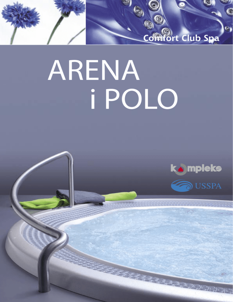 Comfort Club Spa ARENA i POLO ® ARENA Model Arena ma wymiar 343 cm x 258 cm , pojemność wodna urządzenia to 2600 l i może on pomieścić jednocześnie aż 12 osób. Jest to zatem doskonałe rozwiązanie do klubów sportowych, gdzie po treningach z dobroczynnego masażu może korzystać większa liczba osób. Wymiar niecki Wymiar w ramie stalowej Pojemność wodna Waga bez wody/ z wodą Ilość miejsc Kratka przelewowa/ilość odpływów Całkowita ilość dysz dysze wodne/powietrzne dysze napływowe Uchwyt Oświetlenie 343 x 258 x 79 cm 343 x 258 x 100 cm 2600 l 440/3040 kg od 6 do 12 osób tak/ 8 szt. 76 szt. 56/12 szt. 8 szt. 1 szt. ze stali kwasoodpornej tak Izolacja termiczna Sterowanie urządzeniem Pompa hydromasażu nr 1 Pompa hydromasażu nr 2 Dmuchawa powietrza Odpływy denne Antypoślizgowe schody i dno Zasilanie elektryczne do zasilania technologii hydromasażu do zasilania technologii filtracji Kolory niecki PU 4 przyciski pneumatyczne 1,5 kW + 3 HP 1,5 kW + 3 HP do zastosowań publicznych tak/ 2 szt. tak 5x2,5 OWY, zabezpieczenie 20A, In=0,03A w zależności od zestawu filtracyjnego 2 POLO Model Polo ma średnicę o 222 cm i może pomieścić do 5 osób. Pojemność wodna urządzenia to 1100 l. Ten model to rozwiązanie do mniejszch obiektów, w których przywiązuje się wagę do jakości masażu. Wymiar niecki Wymiar w ramie stalowej Pojemność wodna Waga bez wody/ z wodą Ilość miejsc Kratka przelewowa/ilość odpływów Całkowita ilość dysz dysze wodne/powietrzne dysze napływowe Uchwyt Oświetlenie Izolacja termiczna Sterowanie urządzeniem Pompa hydromasażu Dmuchawa powietrza Odpływy denne Antypoślizgowe schody i dno Zasilanie elektryczne do zasilania technologii hydromasażu do zasilania technologii filtracji Kolory niecki Ø 222 x 79 cm Ø 222 x 90 cm 1100 l 210/ 1310 kg od 3 do 5 osób tak/ 4 szt. 40 szt. 21/11 szt. 8 szt. 1 szt. ze stali kwasoodpornej tak PU 3 przyciski pneumatyczne 1,5 kW + 3 HP do zastosowań publicznych tak/ 1 szt. tak 5x2,5 OWY, zabezpieczenie 20A, In=0,03A w zależności od zestawu filtracyjnego 15 Dostępne kolory Linia minibasenów z hydromasażem Comfort Club Spa produkcji USSPA wzbogaciła się o dwa nowe modele - Arena i Polo. Są to urządzenia z kratką przelewową do wykorzystania głównie w obiektach hotelowych, pensjonatach, aquaparkach, w centrach odnowy biologicznej oraz ośrodkach wellness i spa. Przyciągają one uwagę między innymi eleganckim opływowym kształtem i atrakcyjnym wzornictwem. Wyposażenie każdego modelu obejmuje : ü oddzielny system masażu wodnego i powietrznego, ü oświetlenie podwodne, ü sterowanie pneumatyczne, ü uchwyt ze stali nierdzewnej, ü antypoślizgowe schody i dno, ü kratkę przelewową. Niecki obydwu modeli wyposażone są w nowatorski układ dysz wodnych oraz niezależny układ dysz powietrznych, które pozwalają na komfortowy hydromasaż. Spiralne rozłożenie dysz wodnych oraz ich różnorodność pozwalają na komfortowy masaż wszystkich części pleców, a układ dysz wodnych w dnie pozwala na relaksujący masaż stóp. A dodatkowo można skorzystać z delikatnej kąpieli perełkowej dzięki zainstalowanym dyszom powietrznym. Niecki 1 Summer Saphire Mystic Emerald Sahara1 Caribbean Champagne metal Bluegrass Kalahari Tahoe Ponderosa Azure metal White pearl Oceanwave Oyster Sea mist Gypsum mineral1 kolory niecki Arena 79 343 100 258 343 258