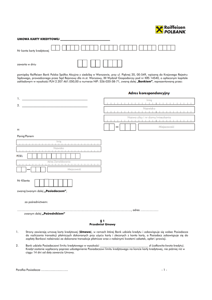 UMOWA KARTY KREDYTOWEJ ___________________________________ Nr konta karty kredytowej zawarta w dniu pomiędzy Raiffeisen Bank Polska Spółka Akcyjna z siedzibą w Warszawie, przy ul. Pięknej 20, 00-549, wpisaną do Krajowego Rejestru Sądowego, prowadzonego przez Sąd Rejonowy dla m.st. Warszawy, XII Wydział Gospodarczy pod nr KRS 14540, o opłaconym kapitale zakładowym w wysokości PLN 2.207.461.050,00 o numerze NIP: 526-020-58-71, zwaną dalej „Bankiem”, reprezentowaną przez: 1. ______________________________________________ 2. ______________________________________________ a: Panią/Panem Nr Klienta zwaną/zwanym dalej „Posiadaczem”, za pośrednictwem: …………………………………………………………………………………………………………, adres ………………. zwanym dalej „Pośrednikiem” §1 Przedmiot Umowy 1. Strony zawierają umowę karty kredytowej (Umowa), w ramach której Bank udziela kredytu i zobowiązuje się wobec Posiadacza do rozliczania transakcji płatniczych dokonanych przy użyciu karty i zleconych z konta karty, a Posiadacz zobowiązuje się do zapłaty Bankowi należności za dokonane transakcje płatnicze wraz z należnymi kwotami odsetek, opłat i prowizji. 2. Bank udziela Posiadaczowi limitu kredytowego w wysokości __________________________________ zł (całkowita kwota kredytu). Kredyt zostanie wypłacony poprzez udostępnienie Posiadaczowi limitu kredytowego na koncie karty kredytowej, nie później niż w ciągu 14 dni od daty zawarcia Umowy. Parafka Posiadacza ................................ -1- 3. Umowa zawierana jest na okres trzech lat. 4. Umowa jest przedłużana na kolejny okres wskazany na wznowionej karcie głównej, o ile żadna ze stron nie złoży oświadczenia o odmowie jej przedłużenia. Oświadczenie o odmowie przedłużania Umowy powinno być złożone drugiej stronie Umowy najpóźniej na 31 dni przed upływem okresu obowiązywania Umowy. Bank może nie przedłużyć Umowy w przypadku zaistnienia okoliczności wymienionych w Regulaminie. 5. Transakcje płatnicze mogą być wykonywane w okresie obowiązywania Umowy, począwszy od dnia aktywacji karty do ostatniego dnia miesiąca wskazanego na karcie głównej. 6. Bank i Posiadacz ustalają, że na dzień wystawienia Umowy limit dzienny wartościowy dla karty głównej przeznaczony na dokonywanie: 1) wypłat gotówki i przelewów z konta karty wynosi .......... zł, 2) transakcji bezgotówkowych wynosi ............ zł. 7. W trakcie trwania Umowy Posiadacz ma możliwość ustanowienia limitów innych niż wskazane w ust. 6. 8. W przypadku stwierdzenia zagrożenia terminowości spłaty zobowiązań, wynikającego z pogorszenia się sytuacji majątkowej Posiadacza, wpływającego negatywnie na jego zdolność kredytową, w skutek obniżenia kwoty miesięcznego dochodu o co najmniej 20% lub wzrostu kwoty miesięcznych zobowiązań o co najmniej 20%, Bank może dokonać, bez zgody Posiadacza blokady karty, obniżenia przyznanego limitu kredytowego oraz ograniczeń dotyczących kwot i liczby dokonywanych transakcji, określonych w Umowie. 9. Bank niezwłocznie poinformuje Posiadacza, w sposób określony w Regulaminie, o zmianie limitu kredytowego, dokonaniu blokady karty lub ograniczeń transakcji. 10. Limit kredytowy powinien być wykorzystany na cele konsumpcyjne nie związane z prowadzeniem działalności gospodarczej. 11. Na wniosek Posiadacza Bank wyda karty dodatkowe osobom przez niego wskazanym. 12. Pojęcia użyte w Umowie mają znaczenie nadane im w Regulaminie kart kredytowych Raiffeisen Bank Polska S.A., zwanym dalej „Regulaminem”. 1. §2 Zabezpieczenia Zabezpieczenie spłaty zobowiązań Posiadacza wynikających z Umowy zostają ustanowione w formie: pełnomocnictwa do pobierania kwot należnych Bankowi z rachunków bankowych Posiadacza prowadzonych przez Bank, o którym mowa w ust. 2, oświadczenia o poddaniu się egzekucji, ubezpieczenia spłaty zadłużenia, na warunkach określonych w Szczególnych Warunkach Grupowego Ubezpieczenia Użytkowników kart Kredytowych RB, w ramach którego Bank płaci składkę ubezpieczeniową refinansowaną przez Posiadacza, kaucji. 2. 1. W przypadku wystąpienia opóźnienia w spłacie zobowiązań, Posiadacz udziela Bankowi, nieodwołalnie i bezwarunkowo, pełnomocnictwa do pobierania kwot należnych Bankowi z tytułu niespłaconych należności wynikających z Umowy, z rachunków bankowych Posiadacza prowadzonych przez Bank. Pełnomocnictwo nie wygasa z chwilą śmierci Posiadacza. §3 Oprocentowanie, opłaty, prowizje Posiadacz zobowiązuje się do uiszczenia następujących należności: 1) opłaty za wydanie karty w pierwszym roku w wysokości __________ zł, 2) opłaty za użytkowanie karty w kolejnych latach w wysokości ________________ zł, 3) odsetek obliczonych według rocznej zmiennej stopy oprocentowania zadłużenia, która na dzień sporządzenia Umowy wynosi: a) dla transakcji gotówkowych ____________%, liczonych od dnia rozliczenia transakcji, b) dla transakcji bezgotówkowych __________%, liczonych od dnia rozliczenia transakcji, przy czym odsetek nie pobiera się w przypadku, gdy spłata całości zadłużenia nastąpi we wskazanym na wyciągu terminie płatności, c) dla transakcji przeznaczonych na spłatę zadłużenia w innym banku _____________%, liczonych od dnia zlecenia przelewu. Parafka Posiadacza ................................ -2- Wysokość stopy oprocentowania nie może przekraczać czterokrotności stawki referencyjnej. Stawka referencyjna na dzień wystawienia Umowy wynosi ………..%. Bazowa stopa oprocentowania na dzień wystawienia Umowy wynosi………… 4) prowizji i opłat wynikających z realizacji dyspozycji złożonych przez Posiadacza lub Użytkownika, a mianowicie: prowizje od transakcji gotówkowych prowizja za wypłatę gotówki we wszystkich bankomatach w kraju i za granicą oraz za transakcje zrealizowane w bankach, urzędach pocztowych lub