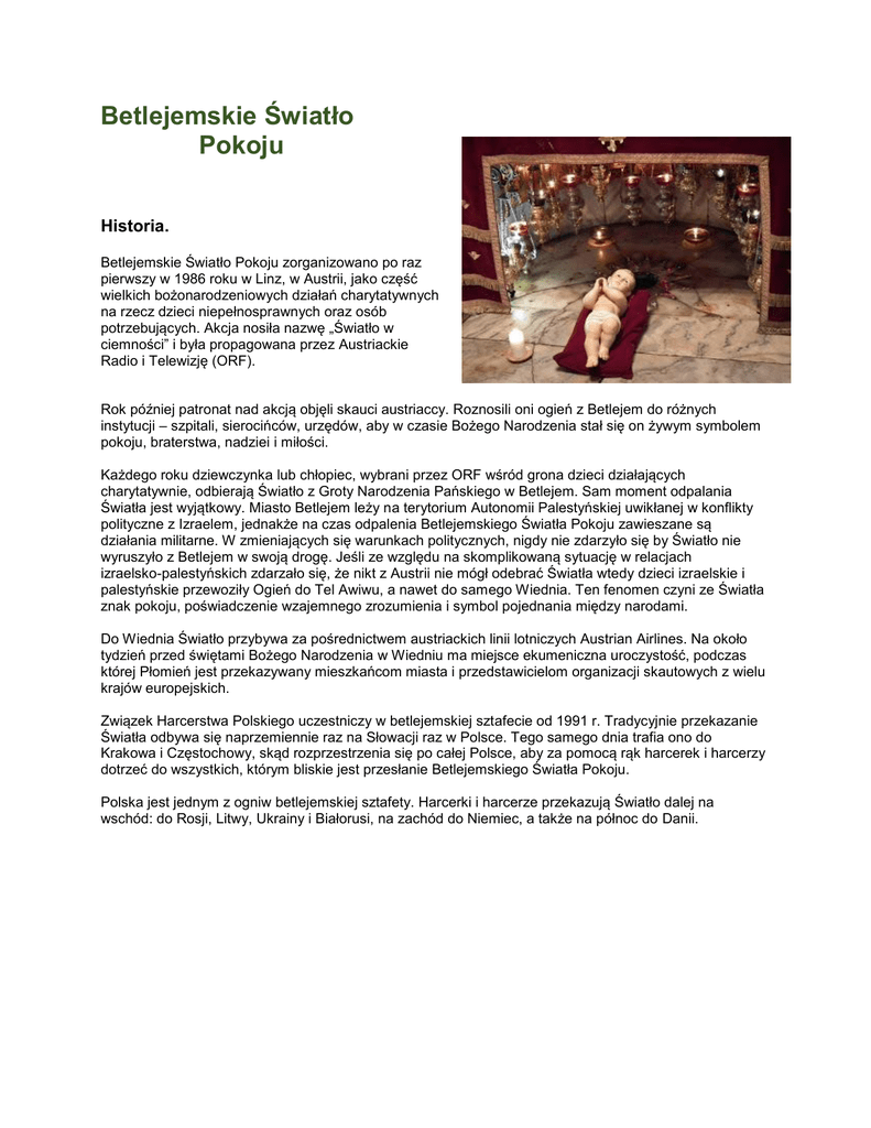 Betlejemskie Światło Pokoju Historia. Betlejemskie Światło Pokoju zorganizowano po raz pierwszy w 1986 roku w Linz, w Austrii, jako część wielkich bożonarodzeniowych działań charytatywnych na rzecz dzieci niepełnosprawnych oraz osób potrzebujących. Akcja nosiła nazwę „Światło w ciemności” i była propagowana przez Austriackie Radio i Telewizję (ORF). Rok później patronat nad akcją objęli skauci austriaccy. Roznosili oni ogień z Betlejem do różnych instytucji – szpitali, sierocińców, urzędów, aby w czasie Bożego Narodzenia stał się on żywym symbolem pokoju, braterstwa, nadziei i miłości. Każdego roku dziewczynka lub chłopiec, wybrani przez ORF wśród grona dzieci działających charytatywnie, odbierają Światło z Groty Narodzenia Pańskiego w Betlejem. Sam moment odpalania Światła jest wyjątkowy. Miasto Betlejem leży na terytorium Autonomii Palestyńskiej uwikłanej w konflikty polityczne z Izraelem, jednakże na czas odpalenia Betlejemskiego Światła Pokoju zawieszane są działania militarne. W zmieniających się warunkach politycznych, nigdy nie zdarzyło się by Światło nie wyruszyło z Betlejem w swoją drogę. Jeśli ze względu na skomplikowaną sytuację w relacjach izraelsko-palestyńskich zdarzało się, że nikt z Austrii nie mógł odebrać Światła wtedy dzieci izraelskie i palestyńskie przewoziły Ogień do Tel Awiwu, a nawet do samego Wiednia. Ten fenomen czyni ze Światła znak pokoju, poświadczenie wzajemnego zrozumienia i symbol pojednania między narodami. Do Wiednia Światło przybywa za pośrednictwem austriackich linii lotniczych Austrian Airlines. Na około tydzień przed świętami Bożego Narodzenia w Wiedniu ma miejsce ekumeniczna uroczystość, podczas której Płomień jest przekazywany mieszkańcom miasta i przedstawicielom organizacji skautowych z wielu krajów europejskich. Związek Harcerstwa Polskiego uczestniczy w betlejemskiej sztafecie od 1991 r. Tradycyjnie przekazanie Światła odbywa się naprzemiennie raz na Słowacji raz w Polsce. Tego samego dnia trafia ono do Krakowa i Częstochowy, skąd rozprzestrzenia się po całej Polsce, aby za pomocą rąk harcerek i harcerzy dotrzeć do wszystkich, którym bliskie jest przesłanie Betlejemskiego Światła Pokoju. Polska jest jednym z ogniw betlejemskiej sztafety. Harcerki i harcerze przekazują Światło dalej na wschód: do Rosji, Litwy, Ukrainy i Białorusi, na zachód do Niemiec, a także na północ do Danii. „Zauważ człowieka” to hasło przyświecające tegorocznej sztafecie Betlejemskiego Światła Pokoju. Już po raz dwudziesty piąty harcerze i harcerki staną się strażnikami światła, które jest symbolem nadziei i pokoju między narodami. Wszystko, co uczyniliście jednemu z tych braci moich najmniejszych, mnieście uczynili(Mt 25,40). XXI wiek, to czas globalizacji i licznych osiągnięć techniki w XXI w. Owocem ich jest coraz szybsze i nie zawsze łatwiejsze życie codzienne. W tych warunkach o wiele łatwiej zgubić drogę, którą każdy człowiek podąża w rodzinie czy społeczeństwie. Człowiek jest zmuszony prosić o pomoc drugiego człowieka. Nie przychodzi mu to łatwo. Trudno zwrócić się do kogoś z prośbą o dobre słowo, o poradę, życzliwe wysłuchanie i zainteresowanie się naszymi sprawami. Wielu ludzi samotnych, starszych, a często i chorych czeka na to, aby ktoś się nimi zainteresował i pomógł. Trzeba wielkiej wrażliwości, aby ich dostrzec w tłumie. Czekają na człowieka, który ich zrozumie, nie zlekceważy i chętnie im pomoże. Są również i tacy, którzy nie chcą ujawnić swoich potrzeb, nieraz bardzo ważnych i pilnych. Ukrywają je. Czasami może to płynąć z ambicji, często z nieśmiałości. A może delikatność nakazuje im ukrywanie swoich potrzeb ? Takich ludzi niełatwo dostrzec. Trzeba ich po prostu szukać. My, harcerki i harcerze Związku Harcerstwa Polskiego, przekazując Betlejemskie Światło Pokoju pragniemy uwrażliwić na wszystkie potrzeby współczesnego człowieka, byśmy proszącym radośnie spieszyli z pomocą, milczących w cierpieniu dostrzegli, a ukrywających się odnajdywali i okazywali im pomoc. Betlejemski Ogień niech umacnia nasze braterstwo i współpracę dla dobra człowieka. Niech obudzi i pogłębi w nas wrażliwość na cudze potrzeby. Na uroczyste przekazanie Betlejemskiego Światła Pokoju zapraszamy dnia 20.12.2015r. o godz. 11.00 do Kościoła Parafialnego pw. Najświętszego Serca Pana Jezusa w Tanowie. Z harcerskim pozdrowieniem CZUWAJ! zuchy z 1 Tanowskiej Gromady Zuchowej „Sokoliki” harcerze z 1 Tanowskiej Drużyny Harcerskiej „Sokoły”