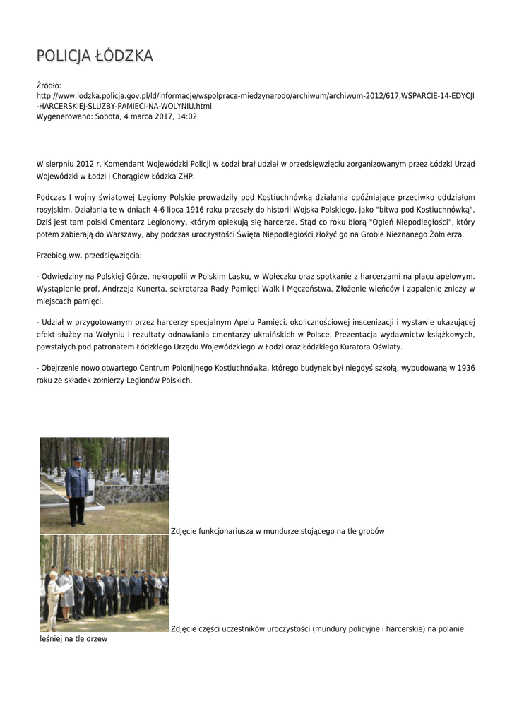 POLICJA ŁÓDZKA Źródło: http://www.lodzka.policja.gov.pl/ld/informacje/wspolpraca-miedzynarodo/archiwum/archiwum-2012/617,WSPARCIE-14-EDYCJI -HARCERSKIEJ-SLUZBY-PAMIECI-NA-WOLYNIU.html Wygenerowano: Sobota, 4 marca 2017, 14:02 W sierpniu 2012 r. Komendant Wojewódzki Policji w Łodzi brał udział w przedsięwzięciu zorganizowanym przez Łódzki Urząd Wojewódzki w Łodzi i Chorągiew Łódzka ZHP. Podczas I wojny światowej Legiony Polskie prowadziły pod Kostiuchnówką działania opóźniające przeciwko oddziałom rosyjskim. Działania te w dniach 4-6 lipca 1916 roku przeszły do historii Wojska Polskiego, jako "bitwa pod Kostiuchnówką". Dziś jest tam polski Cmentarz Legionowy, którym opiekują się harcerze. Stąd co roku biorą "Ogień Niepodległości", który potem zabierają do Warszawy, aby podczas uroczystości Święta Niepodległości złożyć go na Grobie Nieznanego Żołnierza. Przebieg ww. przedsięwzięcia: - Odwiedziny na Polskiej Górze, nekropolii w Polskim Lasku, w Wołeczku oraz spotkanie z harcerzami na placu apelowym. Wystąpienie prof. Andrzeja Kunerta, sekretarza Rady Pamięci Walk i Męczeństwa. Złożenie wieńców i zapalenie zniczy w miejscach pamięci. - Udział w przygotowanym przez harcerzy specjalnym Apelu Pamięci, okolicznościowej inscenizacji i wystawie ukazującej efekt służby na Wołyniu i rezultaty odnawiania cmentarzy ukraińskich w Polsce. Prezentacja wydawnictw książkowych, powstałych pod patronatem Łódzkiego Urzędu Wojewódzkiego w Łodzi oraz Łódzkiego Kuratora Oświaty. - Obejrzenie nowo otwartego Centrum Polonijnego Kostiuchnówka, którego budynek był niegdyś szkołą, wybudowaną w 1936 roku ze składek żołnierzy Legionów Polskich. Zdjęcie funkcjonariusza w mundurze stojącego na tle grobów Zdjęcie części uczestników uroczystości (mundury policyjne i harcerskie) na polanie leśniej na tle drzew Zdjęcie dużego białego budynku będącego siedzibą Centrum Dialogu Kostiuchnówka Ocena: 0/5 (0) Tweetnij