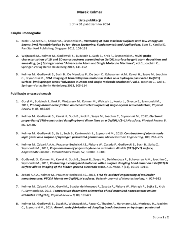 Marek Kolmer Lista publikacji z dnia 31 października 2014 Książki i monografie 1. Krok F., Saeed S.R., Kolmer M., Szymonski M., Patterning of ionic insulator surfaces with low-energy ion beams, [w:] Nanofabrication by Ion- Beam Sputtering: Fundamentals and Applications, Som T., Kanjilal D. Pan Stanford Publishing, Singapur 2012, 109-131 2. Wojtaszek M., Kolmer M., Godlewski S., Budzioch J., Such B., Krok F., Szymonski M., Multi-probe characterization of 1D and 2D nanostructures assembled on Ge(001) surface by gold atom deposition and annealing, [w:] Springer series “Advances in Atom and Single Molecule Machines”, vol.1, Joachim C., Springer-Verlag Berlin Heidelberg 2012, 141-152 3. Kolmer M., Godlewski S., Such B., De Mendoza P., De Leon C., Echavarren A.M., Kawai H., Saeys M., Joachim C., Szymonski M., SPM imaging of trinaphthylene molecular states on a hydrogen passivated Ge(001) surface, [w:] Springer series “Advances in Atom and Single Molecule Machines”, vol.3, Joachim C., Grill L., Springer-Verlag Berlin Heidelberg 2013, 105-114 Publikacje w czasopismach 1. Goryl M., Budzioch J., Krok F., Wojtaszek M., Kolmer M., Walczak L., Konior J., Gnecco E., Szymonski M., 2012, Probing atomic-scale friction on reconstructed surfaces of single-crystal semiconductors, Physical Review B, 85, 085308 2. Kolmer M., Godlewski S., Kawai H., Such B., Krok F., Saeys M., Joachim C., Szymonski M., 2012, Electronic properties of STM-constructed dangling-bond dimer lines on a Ge(001)-(2×1):H surface, Physical Review B, 86, 125307 3. Kolmer M., Godlewski S., Lis J., Such B., Kantorovich L., Szymonski M., 2013, Construction of atomic-scale logic gates on a surface of hydrogen passivated germanium, Microelectronic Engineering, 109, 262–265 4. Kolmer M., Zebari A.A.A., Prauzner-Bechcicki J.S., Piskorz W., Zasada F., Godlewski S., Such B., Sojka Z., Szymonski M., 2013, Polymerization of polyanthrylene on a titanium dioxide (011)-(2x1) surface, Angewandte Chemie - International Edition, 52, 10300 –10303 5. Godlewski S., Kolmer M., Kawai H., Such B., Zuzak R., Saeys M., De Mendoza P., Echavarren A.M., Joachim C., Szymonski M., 2013, Contacting a conjugated molecule with a surface dangling bond dimer on a Ge(001):H surface allows imaging of the hidden ground electronic state, ACS Nano, 7 (11), 10105-10111 6. Zebari A.A.A., Kolmer M., Prauzner-Bechcicki J.S., 2013, STM tip-assisted engineering of molecular nanostructures: PTCDA islands on Ge(001):H surfaces, Beilstein Journal of Nanotechnology, 4, 927–932 7. Kolmer M., Zebari A.A.A., Goryl M., Buatier de Mongeot F., Zasada F., Piskorz W., Pietrzyk P., Sojka Z., Krok F., Szymonski M. 2013, Temperature-dependent orientation of self-organized nanopatterns on ionirradiated TiO 2 (110), Physical Review B, 88, 195427 8. Kolmer M., Godlewski S., Zuzak R., Wojtaszek M., Rauer C., Thuaire A., Hartmann J.M., Moriceau H., Joachim C., Szymonski M., 2014, Atomic scale fabrication of dangling bond structures on hydrogen passivated Strona 1 z 2 Si(001) wafers processed and nanopackaged in a clean room environment, Applied Surface Science, 288, 83– 89 Publikacje w czasopismach popularno-naukowych 1. Kolmer M., Godlewski S., Kawai H., Such B., Krok F., Saeys M., Joachim C., Szymonski M., 2012, Towards atomic-scale logic gates construction on a Ge(001)-(2×1):H surface, E-nanonewsletter, 25, www.phantomsnet.net, 5-11 Strona 2 z 2