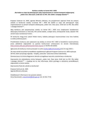 Konkurs wiedzy na temat HIV i AIDS dla kobiet w ciąży lub planujących ciążę organizowany w ramach kampanii edukacyjnej „Jeden test. Dwa życia. Zrób test na HIV. Dla siebie i swojego dziecka™” Krajowe Centrum ds. AIDS, agenda Ministra Zdrowia, ma przyjemność zaprosić Panie do wzięcia udziału w Konkursie wiedzy na temat HIV i AIDS dla kobiet w ciąży lub planujących ciążę organizowanym w ramach kampanii edukacyjnej „Jeden test. Dwa życia. Zrób test na HIV. Dla siebie i swojego dziecka™”. Ideą Konkursu jest popularyzacja wiedzy na temat HIV i AIDS oraz zwiększenie świadomości dotyczącej testowania w kierunku HIV wśród kobiet, a dzięki temu zmniejszenie liczby zakażeń HIV wśród nowo narodzonych dzieci. W konkursie mogą brać udział młode mamy, kobiety planujące macierzyństwo oraz inne kobiety w wieku prokreacyjnym. Przedmiotem konkursu jest wykazanie się wiedzą na temat HIV i AIDS w kontekście macierzyństwa przez udzielenie odpowiedzi na pytania konkursowe umieszczone na stronie internetowej http://www.aids.gov.pl/kampanie/1test.2zycia/ w Strefie dla kobiet. Zgłoszenia do konkursu można przesyłać na adres [email protected] do 22 maja 2015 r. 26 maja wśród wszystkich prawidłowo wypełnionych zgłoszeń Krajowe Centrum ds. AIDS wylosuje 50 Pań, które otrzymają nagrodę – książkę „Córeczka” autorstwa Liliany Fabisińskiej. Zamieszczony na stronie Regulamin określa szczegółowo warunki uczestnictwa w konkursie. Zapraszamy do odwiedzenia strony kampanii „Jeden test. Dwa życia. Zrób test na HIV. Dla siebie i swojego dziecka™” – znajdują się na niej informacje, które pomogą w udzieleniu prawidłowych odpowiedzi w teście wiedzy. Zapraszamy Panie do udziału w konkursie! Krajowe Centrum ds. AIDS Agenda Ministra Zdrowia Dodatkowych informacji w tej sprawie udziela: Anna Kaczmarek, [email protected], tel. 22 331 77 81