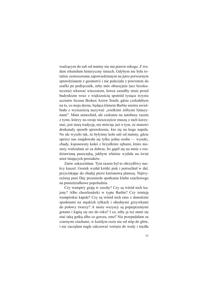 wadzącym do sali od matmy nie ma prawie nikogo. Z trudem stłumiłam histeryczny śmiech. Gdybym nie była totalnie zestresowana zapowiedzianym na jutro potwornym sprawdzianem z geometrii i nie poleciała z powrotem do szafki po podręcznik, żeby móc obsesyjnie (acz bezskutecznie) wkuwać wieczorem, łowca zastałby mnie przed budynkiem wraz z większością spośród tysiąca trzystu uczniów liceum Broken Arrow South, gdzie czekałabym na to, co moja durna, będąca klonem Barbie siostra uwielbiała z wyższością nazywać „wielkimi żółtymi limuzynami”. Mam samochód, ale czekanie na autobusy razem z tymi, którzy na swoje nieszczęście muszą z nich korzystać, jest starą tradycją, nie mówiąc już o tym, że stanowi doskonały sposób sprawdzenia, kto się na kogo napala. No ale wyszło tak, że byłyśmy koło sali od matmy, gdzie oprócz nas znajdowała się tylko jedna osoba — wysoki, chudy, kujonowaty koleś z brzydkimi zębami, które niestety widziałam aż za dobrze, bo gapił się na mnie z rozdziawioną paszczęką, jakbym właśnie wydała na świat miot latających prosiaków. Znów zakaszlałam. Tym razem był to obrzydliwy mokry kaszel. Gostek wydał krótki pisk i potruchtał w dal, przyciskając do chudej piersi kartonową planszę. Najwyraźniej pani Day przeniosła spotkania klubu szachowego na poniedziałkowe popołudnia. Czy wampiry grają w szachy? Czy są wśród nich kujony? Albo cheerleaderki w typie Barbie? Czy istnieją wampirskie kapele? Czy są wśród nich emo z damskimi spodniami na męskich tyłkach i ohydnymi grzywkami do połowy twarzy? A może wszyscy są popieprzonymi gotami i kąpią się raz do roku? I co, niby ja też mam się stać taką gotką albo co gorsza, emo? Nie przepadałam za czarnymi ciuchami, w każdym razie nie od stóp do głów, i nie zaczęłam nagle odczuwać wstrętu do wody i mydła 15