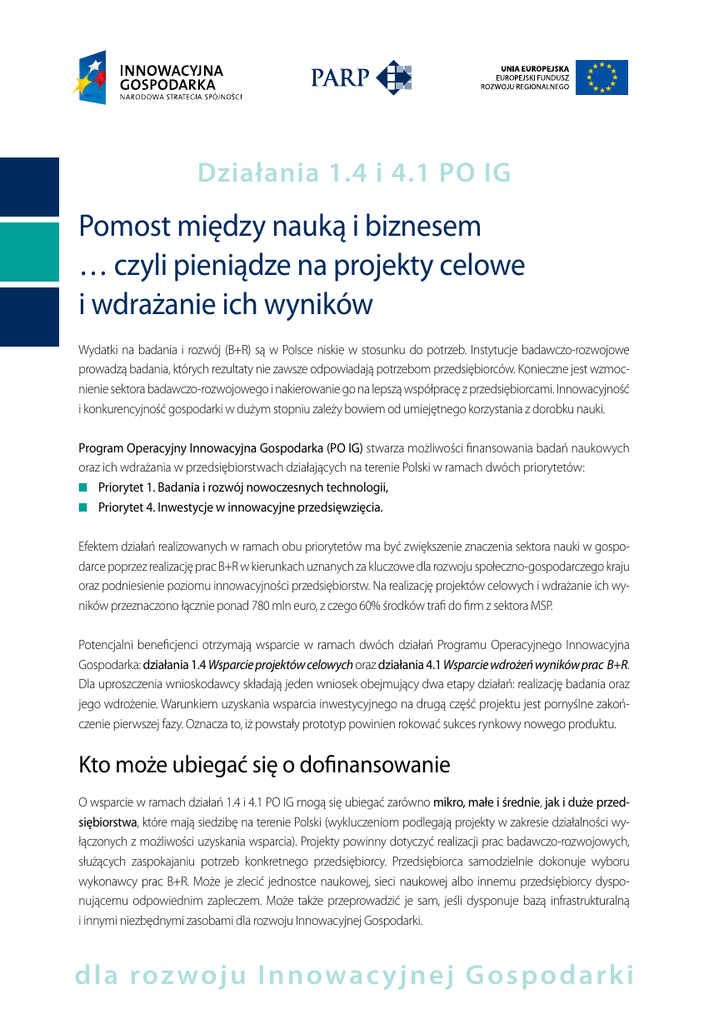 Działania 1.4 i 4.1 PO IG Pomost między nauką i biznesem … czyli pieniądze na projekty celowe i wdrażanie ich wyników Wydatki na badania i rozwój (B+R) są w Polsce niskie w stosunku do potrzeb. Instytucje badawczo-rozwojowe prowadzą badania, których rezultaty nie zawsze odpowiadają potrzebom przedsiębiorców. Konieczne jest wzmocnienie sektora badawczo - rozwojowego i nakierowanie go na lepszą współpracę z przedsiębiorcami. Innowacyjność i konkurencyjność gospodarki w dużym stopniu zależy bowiem od umiejętnego korzystania z dorobku nauki. Program Operacyjny Innowacyjna Gospodarka (PO IG) stwarza możliwości finansowania badań naukowych oraz ich wdrażania w przedsiębiorstwach działających na terenie Polski w ramach dwóch priorytetów: � Priorytet 1. Badania i rozwój nowoczesnych technologii, � Priorytet 4. Inwestycje w innowacyjne przedsięwzięcia. Efektem działań realizowanych w ramach obu priorytetów ma być zwiększenie znaczenia sektora nauki w gospodarce poprzez realizację prac B+R w kierunkach uznanych za kluczowe dla rozwoju społeczno-gospodarczego kraju oraz podniesienie poziomu innowacyjności przedsiębiorstw. Na realizację projektów celowych i wdrażanie ich wyników przeznaczono łącznie ponad 780 mln euro, z czego 60% środków trafi do firm z sektora MSP. Potencjalni beneficjenci otrzymają wsparcie w ramach dwóch działań Programu Operacyjnego Innowacyjna Gospodarka: działania 1.4 Wsparcie projektów celowych oraz działania 4.1 Wsparcie wdrożeń wyników prac B+R. Dla uproszczenia wnioskodawcy składają jeden wniosek obejmujący dwa etapy działań: realizację badania oraz jego wdrożenie. Warunkiem uzyskania wsparcia inwestycyjnego na drugą część projektu jest pomyślne zakończenie pierwszej fazy. Oznacza to, iż powstały prototyp powinien rokować sukces rynkowy nowego produktu. Kto może ubiegać się o dofinansowanie O wsparcie w ramach działań 1.4 i 4.1 PO IG mogą się ubiegać zarówno mikro, małe i średnie, jak i duże przedsiębiorstwa, które mają siedzibę na terenie Polski (wykluczeniom podlegają projekty w zakresie działalności wyłączonych z możliwości uzyskania wsparcia). Projekty powinny dotyczyć realizacji prac badawczo-rozwojowych, służących zaspokajaniu potrzeb konkretnego przedsiębiorcy. Przedsiębiorca samodzielnie dokonuje wyboru wykonawcy prac B+R. Może je zlecić jednostce naukowej, sieci naukowej albo innemu przedsiębiorcy dysponującemu odpowiednim zapleczem. Może także przeprowadzić je sam, jeśli dysponuje bazą infrastrukturalną i innymi niezbędnymi zasobami dla rozwoju Innowacyjnej Gospodarki. dla roz woju Innowac yjnej Gospodark i Na co można uzyskać dofinansowanie W ramach działań mogą być realizowane projekty obejmujące przedsięwzięcia techniczne, technologiczne lub organizacyjne (badania przemysłowe i prace rozwojowe). Wsparciem zostaną objęte projekty inwestycyjne (zakup środków trwałych lub wartości niematerialnych i prawnych) wraz z niezbędną częścią doradczą (doradztwo kwalifikuje się do dofinansowania wyłącznie w wypadku MSP), konieczne do wdrożenia wyników prac B+R zrealizowanych w I etapie przedsięwzięcia lub w ramach Inicjatywy Technologicznej I (program wdrażany przez Ministerstwo Nauki i Szkolnictwa Wyższego). Warto pamiętać, że działanie 1.4 obejmuje dofinansowanie wydatków do momentu stworzenia prototypu, zaś działanie 4.1 stanowi kontynuację przedsięwzięcia dotyczącą wdrożenia wyników prac B+R. Poziom dofinansowania w ramach działania 1.4 i 4.1 PO IG Beneficjenci Działanie 1.4 Działanie 4.1 mikroprzedsiąbiorca badania przemysłowe – do 70% mały przedsiębiorca prace rozwojowe – do 45% inwestycje – od 50% do 70%, w zależności od lokalizacji projektu (oprócz MSP z sektora transportu), doradztwo – 50% średni przedsiębiorca badania przemysłowe do 60% prace rozwojowe do 35% inwestycje – od 30% do 60% , w zależności od lokalizacji projektu (oprócz MSP z sektora transportu), doradztwo – 50% duży przedsiębiorca badania przemysłowe do 50% prace rozwojowe do 25% inwestycje – od 30% do 50%, w zależności od lokalizacji projektu (oraz dla MSP z sektora transportu), doradztwo – 50% Maksymalna kwota dofinansowania na I etap projektu (badania przemysłowe i prace rozwojowe) nie może przekroczyć 7,5 mln euro. Najwyższe wsparcie, jakie można uzyskać na wdrożenie (II etap), wynosi 20 mln zł. Wartość wydatków kwalifikowanych na I etap projektu dla projektów celowych realizowanych w województwach, w których w ramach Regionalnych Programów Operacyjnych uruchomiono analogiczny instrument wsparcia. Całkowita wartość projektu celowego nie może przekroczyć 50 mln euro. Przedsiębiorca musi zaplanować realizację zarówno części badawczej, jak i wdrożeniowej projektu. Jedynym odstępstwem od tej zasady są projekty składane przez beneficjentów w ramach działającej już Inicjatywy Technologicznej – w tym wypadku wnioskodawca aplikuje jedynie o dofinansowanie części wdrożeniowej (II etap). Szczegółowe informacje dotyczące programów europejskich realizowanych przez Polską Agencję Rozwoju Przedsiębiorczości można uzyskać w Informatorium pod numerami telefonów: 022 432 89 91, 022 432 89 92, 022 432 89 93 oraz 0 801 33 22 02, 0 801 40 64 16 e-mail: [email protected] www.parp.gov.pl dla roz woju Innowac yjnej Gospodark i
