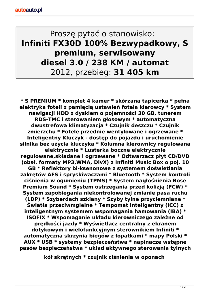 Proszę pytać o stanowisko: Infiniti FX30D 100% Bezwypadkowy, S premium, serwisowany diesel 3.0 / 238 KM / automat 2012, przebieg: 31 405 km * S PREMIUM * komplet 4 kamer * skórzana tapicerka * pełna elektryka foteli z pamięcią ustawień fotela kierowcy * System nawigacji HDD z dyskiem o pojemności 30 GB, tunerem RDS-TMC i sterowaniem głosowym * automatyczna dwustrefowa klimatyzacja * Czujnik deszczu * Czujnik zmierzchu * Fotele przednie wentylowane i ogrzewane * Inteligentny Kluczyk - dostęp do pojazdu i uruchomienie silnika bez użycia kluczyka * Kolumna kierownicy regulowana elektrycznie * Lusterka boczne elektrycznie regulowane,składane i ogrzewane * Odtwarzacz płyt CD/DVD (obsł. formaty MP3,WMA, DivX) z Infiniti Music Box o poj. 10 GB * Reflektory bi-ksenonowe z systemem doświetlania zakrętów AFS i spryskiwaczami * Bluetooth * System kontroli ciśnienia w ogumieniu (TPMS) * System nagłośnienia Bose Premium Sound * System ostrzegania przed kolizją (FCW) * System zapobiegania niekontrolowanej zmianie pasa ruchu (LDP) * Szyberdach szklany * Szyby tylne przyciemniane * Światła przeciwmgielne * Tempomat inteligentny (ICC) z inteligentnym systemem wspomagania hamowania (IBA) * ISOFIX * Wspomaganie układu kierowniczego zależne od prędkości jazdy * Wyświetlacz centralny z ekranem dotykowym i wielofunkcyjnym sterownikiem Infiniti * automatyczna skrzynia biegów z łopatkami * mapy Polski * AUX * USB * systemy bezpieczeństwa * napinacze wstępne pasów bezpieczeństwa * układ aktywnego sterowania tylnych kół skrętnych * czujnik ciśnienia w oponach 1/2 4x4; ABS; ASR; ESP; alufelgi; autoalarm; centralny zamek; czujnik deszczu; czujniki cofania; el. lusterka; el.szyby; immobiliser; kierownica wielofunkcyjna; klimatyzacja; komputer; ksenony; podgrzewana przednia szyba; podgrzewane fotele; poduszka powietrzna; przyciemniane szyby; radio / CD; skórzana tapicerka; nawigacja; szyberdach; tempomat; wspomaganie kierownicy; światła przeciwmgłowe; relingi dachowe; elektryczne fotele; tapicerka premium; regulacja wysokości fotela; klimatronik bezwypadkowy; garażowany; serwisowany w ASO; gwarancja Cena: 159 700 PLN netto Opiekun: Marcin Podemski 602-435-900 Jana Pawła II 69, Punkt A 2/2