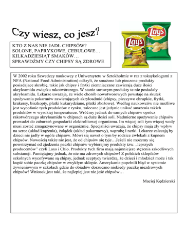 KTO Z NAS NIE JADŁ CHIPSÓW? SOLONE, PAPRYKOWE, CEBULOWE… KILKADZIESIĄT SMAKÓW… SPRAWDŹMY CZY CHIPSY SĄ ZDROWE W 2002 roku Szwedzcy naukowcy z Uniwersytetu w Sztokholmie w raz z toksykologami z NFA (National Food Administration) odkryli, Ŝe smaŜone lub pieczone produkty posiadające skrobię, takie jak chipsy i frytki ziemniaczane zawierają duŜe ilości akryloamidu związku rakotwórczego. W stanie surowym produkty te nie posiadały akryloamidu. Lekarze uwaŜają, Ŝe wiele chorób nowotworowych powstaje na skutek spoŜywania pokarmów zawierających akryloadmid (chipsy, pieczywo chrupkie, frytki, krakersy, biszkopty, płatki kukurydziane, płatki zboŜowe). Według naukowców nie moŜliwe jest wycofanie tych produktów z rynku, zalecane jest jedynie unikać smaŜenia takich produktów w wysokiej temperaturze. Wróćmy jednak do samych chipsów oprócz rakotwórczego akryloamidu w chipsach są duŜe ilości soli. Nadmierne spoŜywanie chipsów prowadzi do zaburzeń gospodarki elektrolitowej organizmu. Im więcej soli tym więcej wody musi zostać zmagazynowane w organizmie. Specjaliści uwaŜają, Ŝe chipsy mają zły wpływ na serce (układ krąŜenia), Ŝołądek (układ pokarmowy), wątrobę i nerki. Lekarze zalecają by dzieci nie jadły w ogóle chipsów. Mówi się nawet o tym by rodzice zwlekali z kupnem chipsów. Nowością takŜe nie jest, Ŝe od chipsów się tyje…JeŜeli nie moŜemy się powstrzymać od zjedzenia paczki chipsów wybierajmy produkty tzw. „lepszych producentów” czyli Lays i Chio. Produkty tych firm mają najmniejsze stęŜenia szkodliwych substancji. Pamiętajmy jednak, Ŝe nie ma zdrowych chipsów! Z polskich sklepików szkolnych wycofywane są chipsy, jednak sceptycy twierdzą, Ŝe dzieci i młodzieŜ moŜe i tak kupić sobie paczkę chipsów w zwykłym sklepie. Amerykanie popełnili błąd w systemie Ŝywieniowym w szkołach gdzie do obiadów dorzucano niekiedy paczkę niezdrowych chipsów! Wniosek jest taki, Ŝe najlepiej jest nie jeść chipsów… Maciej Kędzierski