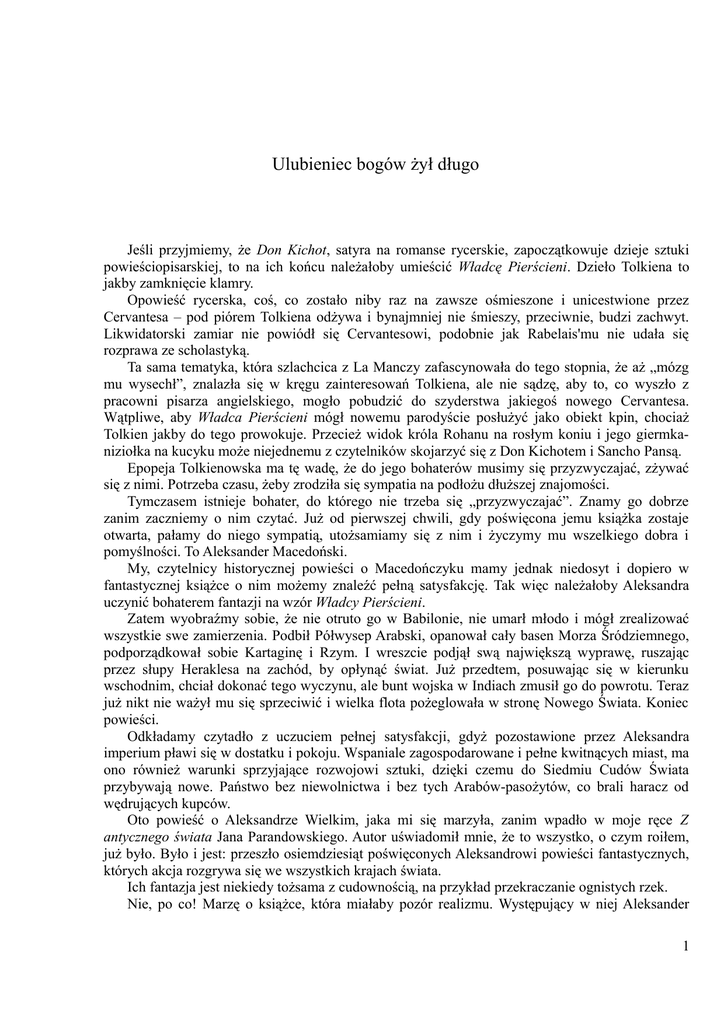 Ulubieniec bogów żył długo Jeśli przyjmiemy, że Don Kichot, satyra na romanse rycerskie, zapoczątkowuje dzieje sztuki powieściopisarskiej, to na ich końcu należałoby umieścić Władcę Pierścieni. Dzieło Tolkiena to jakby zamknięcie klamry. Opowieść rycerska, coś, co zostało niby raz na zawsze ośmieszone i unicestwione przez Cervantesa – pod piórem Tolkiena odżywa i bynajmniej nie śmieszy, przeciwnie, budzi zachwyt. Likwidatorski zamiar nie powiódł się Cervantesowi, podobnie jak Rabelais'mu nie udała się rozprawa ze scholastyką. Ta sama tematyka, która szlachcica z La Manczy zafascynowała do tego stopnia, że aż „mózg mu wysechł”, znalazła się w kręgu zainteresowań Tolkiena, ale nie sądzę, aby to, co wyszło z pracowni pisarza angielskiego, mogło pobudzić do szyderstwa jakiegoś nowego Cervantesa. Wątpliwe, aby Władca Pierścieni mógł nowemu parodyście posłużyć jako obiekt kpin, chociaż Tolkien jakby do tego prowokuje. Przecież widok króla Rohanu na rosłym koniu i jego giermkaniziołka na kucyku może niejednemu z czytelników skojarzyć się z Don Kichotem i Sancho Pansą. Epopeja Tolkienowska ma tę wadę, że do jego bohaterów musimy się przyzwyczajać, zżywać się z nimi. Potrzeba czasu, żeby zrodziła się sympatia na podłożu dłuższej znajomości. Tymczasem istnieje bohater, do którego nie trzeba się „przyzwyczajać”. Znamy go dobrze zanim zaczniemy o nim czytać. Już od pierwszej chwili, gdy poświęcona jemu książka zostaje otwarta, pałamy do niego sympatią, utożsamiamy się z nim i życzymy mu wszelkiego dobra i pomyślności. To Aleksander Macedoński. My, czytelnicy historycznej powieści o Macedończyku mamy jednak niedosyt i dopiero w fantastycznej książce o nim możemy znaleźć pełną satysfakcję. Tak więc należałoby Aleksandra uczynić bohaterem fantazji na wzór Władcy Pierścieni. Zatem wyobraźmy sobie, że nie otruto go w Babilonie, nie umarł młodo i mógł zrealizować wszystkie swe zamierzenia. Podbił Półwysep Arabski, opanował cały basen Morza Śródziemnego, podporządkował sobie Kartaginę i Rzym. I wreszcie podjął swą największą wyprawę, ruszając przez słupy Heraklesa na zachód, by opłynąć świat. Już przedtem, posuwając się w kierunku wschodnim, chciał dokonać tego wyczynu, ale bunt wojska w Indiach zmusił go do powrotu. Teraz już nikt nie ważył mu się sprzeciwić i wielka flota pożeglowała w stronę Nowego Świata. Koniec powieści. Odkładamy czytadło z uczuciem pełnej satysfakcji, gdyż pozostawione przez Aleksandra imperium pławi się w dostatku i pokoju. Wspaniale zagospodarowane i pełne kwitnących miast, ma ono również warunki sprzyjające rozwojowi sztuki, dzięki czemu do Siedmiu Cudów Świata przybywają nowe. Państwo bez niewolnictwa i bez tych Arabów-pasożytów, co brali haracz od wędrujących kupców. Oto powieść o Aleksandrze Wielkim, jaka mi się marzyła, zanim wpadło w moje ręce Z antycznego świata Jana Parandowskiego. Autor uświadomił mnie, że to wszystko, o czym roiłem, już było. Było i jest: przeszło osiemdziesiąt poświęconych Aleksandrowi powieści fantastycznych, których akcja rozgrywa się we wszystkich krajach świata. Ich fantazja jest niekiedy tożsama z cudownością, na przykład przekraczanie ognistych rzek. Nie, po co! Marzę o książce, która miałaby pozór realizmu. Występujący w niej Aleksander 1 zajmowałby się „po prostu” naprawianiem świata, tępieniem zła, przywracaniem sprawiedliwości, a także osuszaniem bagien, pogłębianiem rzek, nawadnianiem pustyń, zamienianiem tego padołu w rajski ogród – bez komarów, żmij i chorób. Słowo koniec widniejące na ostatniej stronie historycznej książki o królu Makedonów należałoby zastąpić notką: koniec tomu pierwszego. Tom drugi poinformowałby czytelnika już na wstępie, że pogłoski o śmierci króla okazały się fałszywe. Aleksander zdemaskował trucicieli ocalając życie swojego małego syna i własne. Niestety, trucicielom powiodło się i wysiłki tytana poszły na marne. Na marne także cała ta moja pisanina! Wszystko już było, wszystko zostało napisane. Mam na myśli liczącą sobie osiemdziesiąt pozycji biblioteczkę powieści fantastycznych z Aleksandrem w roli głównej. Na początku tych rojeń o Niezwyciężonym kazałem mu być poprzednikiem Kolumba i zasmarowując arkusz papieru nie zdawałem sobie sprawy, że ja sam „odkrywam Amerykę”. 2