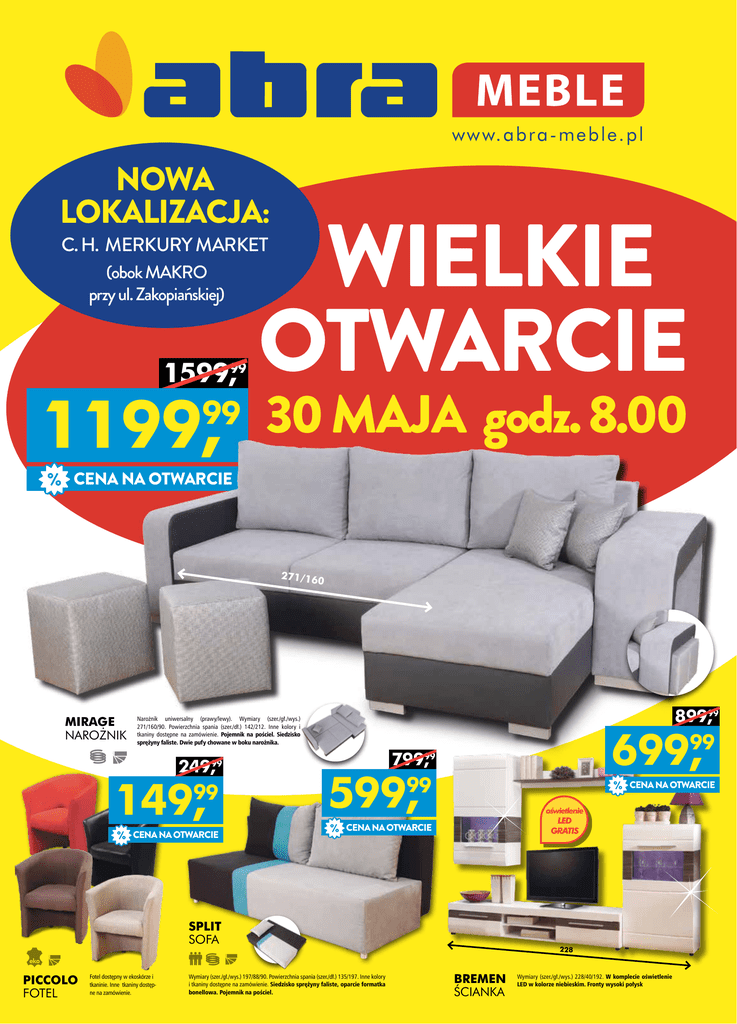 www.abra-meble.pl NOWA LOKALIZACJA: WIELKIE OTWARCIE C. H. MERKURY MARKEt (obok MAKRO przy ul. Zakopiańskiej) 1599,99 1199, 99 30 maja godz. 8.00 CENA NA OTWARCIE 271/160 MIRAGE NAROŻNIK 899,99 Narożnik uniwersalny (prawy/lewy). Wymiary (szer./gł./wys.) 271/160/90. Powierzchnia spania (szer./dł.) 142/212. Inne kolory i tkaniny dostępne na zamówienie. Pojemnik na pościel. Siedzisko sprężyny faliste. Dwie pufy chowane w boku narożnika. 249,99 149, 99 CENA NA OTWARCIE 699, 99 799, 99 599, 99 CENA NA OTWARCIE oświetlenie LED GRATIS CENA NA OTWARCIE SPLIT SOFA PICCOLO FOTEL Fotel dostępny w ekoskórze i tkaninie. Inne tkaniny dostępne na zamówienie. Wymiary (szer./gł./wys.) 197/88/90. Powierzchnia spania (szer./dł.) 135/197. Inne kolory i tkaniny dostępne na zamówienie. Siedzisko sprężyny faliste, oparcie formatka bonellowa. Pojemnik na pościel. 228 BREMEN ŚCIANKA Wymiary (szer./gł./wys.) 228/40/192. W komplecie oświetlenie LED w kolorze niebieskim. Fronty wysoki połysk 1099,99 819, 99 CENA NA OTWARCIE RODI SOFA Wymiary (szer./gł./wys.) 200/100/93. Powierzchnia spania (szer./dł.) 146/200. Inne kolory i tkaniny dostępne na zamówienie. Siedzisko sprężyna falista oraz formatka typu bonell, oparcie formatka typu bonell. Pojemnik na pościel. 1099,99 99 1399,99 999, 1199, 99 oferta specjalna CENA NA OTWARCIE SANREMO KANAPA AVILLA SOFA Wymiary (szer./gł./wys.) 200/99/87. Powierzchnia spania o wymiarach (szer./dł.) 146/200. Inne tkaniny na zamówienie. Sprężyny typu bonell. Pojemnik na pościel. Automat wspomagający rozkładanie. 1299,99 Wymiary (szer./gł./wys.) 241/100/90. Powierzchnia spania (szer./dł.) 146/198.. Inne kolory dostępne na zamówienie. Siedzisko sprężyna falista oraz formatka typu bonell, oparcie formatka typu bonell.. Pojemnik na pościel. 1099, 1299, 99 99 CENA NA OTWARCIE ALBA SOFA Wymiary (szer./gł./wys.) 200/102/88. Powierzchnia spania (szer./ dł.) 146/200. Inne kolory i tkaniny dostępne na zamówienie. Siedzisko sprężyna falista oraz formatka typu bonell, oparcie formatka typu bonell. Pojemnik na pościel. NAJNIŻSZE CENY LUBIĘ TO! 1499,99 CENA NA OTWARCIE SARA KANAPA Wymiary (szer./gł./wys.) 258/89/87. Powierzchnia spania (szer./dł.) 143/195. Inne kolory dostępne na zamówienie. Pojemnik na pościel. Sprężyna falista. W komplecie dwie pufy chowane w boku kanapy. 1299,99 totalnie Y DARMOW kredyt 1199, 99 0 x 4 o a wszystk oferta specjalna n GABI SOFA Wymiary (szer./gł./wys.) 237/95/84. Powierzchnia spania (szer./dł.) 149/195. Sprężyna falista. Kieszeń w podłokietniku. Pojemnik na pościel. 1399,99 1199, 99 CENA NA OTWARCIE COSMO SOFA Wymiary (szer./gł./wys.) 212/215/78. Powierzchnia spania (szer./dł.) 115/212. Inne kolory dostępne na zamówienie. Sprężyna falista Pojemnik na pościel. REGULOWANE ZAGŁÓWKI 1399,99 1299, 99 oferta specjalna REGULOWANE ZAGŁÓWKI MERCI SOFA Wymiary (szer./gł./wys.) 180/105/86-100. Siedzisko sprężyna falista. 1699,99 1499, 99 CENA NA OTWARCIE 139,99 TOOKY PUFA Wymiary (szer./wys.) 76/35. 219,99 99 199, oferta specjalna TOOKY FOTEL GENOVA SOFA Wymiary (szer./gł./wys.) 206/104/95. Siedzisko sprężyna falista. Wymiary (szer./wys.) 76/66. POSZUKAJ NAS NA FACEBOOKU: FACEBOOK.COM/ABRAMEBLE 599,99 99 779,99 99 699, 555, oferta specjalna oferta specjalna RITA SOFA Wymiary (szer./gł./wys.) 195/80/73. Powierzchnia spania (szer./dł.) 136/195. Pojemnik na poÊciel. 649,99 549, 99 CENA NA OTWARCIE 1199, 99 1099, 99 oferta specjalna LISA WERSALKA Wymiary (szer./gł./wys.) 195/85/90. Powierzchnia spania (szer./ dł.) 120/195. Inne kolory dostępne na zamówienie. Pojemnik na pościel. Sprężyny typu bonell. PACCO SOFA Wymiary (szer./gł./wys.) 102/88/78. Powierzchnia spania o wymiarach (szer./dł.) 80/186. Inne tkaniny dostępne na zamówienie. Siedzisko sprężyny typu bonell. 999,99 99 899, oferta specjalna VOLF SOFA Wymiary (szer./gł./wys.) 155/87/90. Powierzchnia spania (szer./dł.) 140/190. Inne kolory i tkaniny dostępne na zamówienie indywidualne. Pojemnik na pościel. Oferta stanowi wyłączność dla sieci sklepów ABRA. 949,99 99 849, oferta specjalna MAGIC WERSALKA Wymiary (szer./gł./wys.) 195/98/88. Powierzchnia spania (szer./ dł.) 153/195. Siedzisko sprężyna falista, oparcie sprężyna typu bonell. Pojemnik na pościel. TIFFANY SOFA Wymiary (szer./gł./wys.) 166/88/85. Powierzchnia spania (szer./dł.) 120/186. Inne kolory i tkaniny dostępne na zamówienie. Pojemnik na pościel. 899,99 99 799, oferta specjalna JUNIOR KANAPA Wymiary (szer./gł./wys.) 205/90/94. Powierzchnia spania (szer./ dł.)135/196. Inne kolory i tkaniny dostępne na zamówienie. Siedzisko sprężyny faliste, oparcie sprężyny faliste. Pojemnik na pościel. NAJNIŻSZE CENY LUBIĘ TO! 899,99 99 159,99 799, 119,99 oferta specjalna oferta specjalna QG-2 KRZESŁO GLOB ŚCIANKA W skład ścianki wchodzą: szafa, biurko z kontenerkiem, nadstawka oraz regał. Wymiary (szer./gł./ wys.) 245/50/180. Do ścianki polecamy komodę GLOB (szer./gł./ wys.) 90/40/80 w cenie 249,99/ 299,99. 369,99 299,99 oferta specjalna 245 1099,99 99 999, PERFECT KRZESŁO oferta specjalna 109,99 79, TAMI ŚCIANKA 99 W skład ścianki wchodzą: regał duży, biurko, półka oraz regał wąski. Wymiary (szer./gł./wys.) 250/53/189,5. Do ścianki polecamy: szafę TAMI 2D (szer./gł./wys.) 80/53/189,5 w cenie 449,99/499,99 oraz komodę TAMI (szer./gł./wys.) 80/38/94 w cenie 299,99/329,99. Inne bryły dostępne na zamówienie indywidualne. 63x190 cm 250 THOMMY MATERAC SKŁADANY 459, 99 a YOUNG SYSTEM W skład systemu wchodzą: a. regał narożny YOUNG (szer./gł./ wys.) 40/40/191 w cenie 169,99/199,99; b. szafa YOUNG (szer./ gł./wys.) 80/50/191; c. biurko YOUNG (szer./ gł./wys.) 110/50/78 w cenie 118,99/139,99; d. kontenerek YOUNG (szer./gł./wys.) 40/40/66 w cenie 194,99/229,99; e. półka YOUNG (szer./ gł./wys.) 80/22/35 w cenie 67,99/79,99; f. regał YOUNG (szer./ gł./wys.) 40/40/191; g. komoda YOUNG (szer./gł./wys.) 90/40/85. In