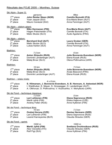 Résultats des FOJE 2005 – Monthey, Suisse Ski Alpin– Super G: ère 1 place 2e place 3e place garsons John Reidar Steen (NOR) Yoan Jaquet (SUI) Mauro Caviezel (SUI) filles Camilla Borsotti (ITA) Eva-Maria Brem (AUT) Anna Fenninger (AUT) Ski Alpin – slalom géant: 1ère place Niko Hermanen (FIN) 2e place Hagen Patscheider (ITA) 3e place Matic Skube (SLO) Eva-Maria Brem (AUT) Camilla Borsotti (ITA) Aude Aguilaniu (FRA) Ski Alpin – slalom: 1ère place Bernhard Graf (AUT) e 2 place Matic Skube (SLO) 3e place Lukas Karlen (SUI) Laura Gruber (GER) Camilla Borsotti (ITA) Anna Fenninger (AUT) Biathlon: ère 1 place 2e place 3e place 7,5 km Anton Shipulin (RUS) Dominik Landertinger (AUT) Matej Brvar (SLO) 6 km Julie Bonnevie-Svendsen (NOR) Elena Kozak (RUS) Olena Pidhrushna (UKR) 10 km Anton Shipulin (RUS) Matej Brvar (SLO) Dominik Landertinger (AUT) 7,5 km Julie Bonnevie-Svendsen (NOR) Anais Bescond (FRA) Elena Kozak (RUS) Biathlon: ère 1 place 2e place 3e place Biathlon – relais mixte: 1ère place 2e place 3e place 4 x 6 km S. Hilmarsen, J. Bonnevie-Svendsen, A. B. Hennum, A. Askestad (NOR) I. Waldhuber, E. Mayer, S. Grossegger, D. Landertinger (AUT) A. Olkhovyk, O. Pidhrushna, V. Kozhushko, V. Mohylecko (UKR) Ski de Fond – technique classique: 7,5 km ère 1 place Lari Lehtonen (FIN) Martti Jylhä (FIN) 2e place e Andrey Feller (RUS) 3 place 5 km Diana Sapronova (RUS) Eliska Hajkova (CZE) Anne Kyllönen (FIN) Ski de Fond – technique libre: 10 km ère 1 place Ondrej Horyna (CZE) 2e place Lari Lehtonen (FIN) 3e place Leanid Karneyenka (BLR) 7,5 km Denise Hermann (GER) Diana Sapronova (RUS) Claudia Straube (GER) Ski de Fond – sprint: 1ère place 2e place 3e place 1000 m Martti Jylhä (FIN) Alex Vanzetta (ITA) Rolf Figi (SUI) 1000 m Svetlana Ovchinnikova (RUS) Claudia Straube (GER) Anne Kyllönen (FIN) Ski de Fond – relais mixte, technique libre: ère 1 place 2e place 3e place 4 x 5 km J. Rykr, E. Hajkova, O. Horyna, L. Munclingerova (CZE) A. Feller, L. Shaydurova, I. Tretyakov, D. Sapronova (RUS) M. Otcenas, K. Garajova, F. Janecko, B. Blaskova (SVK) Snowboarding – SBX: 1ère place Mathias Schoepf (AUT) 2e place Andreas Hacksteiner (AUT) 3e place Tony Ramoin (FRA) Oceane Pozzo (FRA) Sina Candrian (SUI) Pia Meusburger (AUT) Snowboarding: 1ère place 2e place 3e place Peetu Piiroinen (FIN) Stian Aannestad (NOR) Tore-V. Holvik (NOR) Sophie Rodriguez (FRA) Sina Candrian (SUI) Simona Meiler (SUI) Curling: 1ère place 2e place 3e place Grande-Bretagne Suisse Allemagne Suisse Danemark Grande-Bretagne Short track – 500 m: Marco Bertoldi (ITA) 1ère place 2e place Xavier Charpentier (FRA) 3e place Maxime Chataigner (FRA) Patrycja Maliszewska (POL) Bernadett Heidum (HUN) Julia Riedel (GER) Short track – 1000 m: Maxime Chataigner (FRA) 1ère place 2e place Robert Seifert (GER) 3e place Gabor Galambos (HUN) Darazs Rozsa (HUN) Julia Riedel (GER) Elena Pribysh (ISR) Short track – 1500 m: Gabor Galambos (HUN) 1ère place e 2 place Evgeny Kozulin (RUS) 3e place Maxime Chataigner (FRA) Darazs Rozsa (HUN) Bernadett Heidum (HUN) Julia Riedel (GER) Short track – relais, 2000 m: 1ère place France e 2 place Allemagne 3e place Néerlande Hongrie Italie Allemagne Patinage Artistique: 1ère place Adrian Schultheiss (SWE) 2e place Kim Lucine (FRA) 3e place Nikita Mikhaylov (RUS) Angelina Turenko (RUS) Nicole Della Monica (ITA) Kateryna Proyda (UKR) Hockey sur Glace: 1ère place République Tchèque 2e place Suisse 3e place Russie