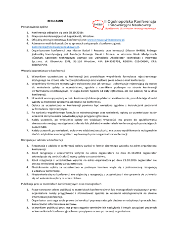 REGULAMIN Postanowienia ogólne 1. 2. 3. 4. Konferencja odbędzie się dnia 28.10.2016r. Miejscem konferencji jest ul. Legnicka 65, Wrocław. Oficjalną stroną internetową konferencji jest: www.innowacyjninaukowcy.pl. Adresem e-mail do kontaktów w sprawach związanych z konferencją jest: [email protected]. 5. Organizatorem konferencji jest Klaster Badań i Rozwoju oraz Innowacji (Klaster B+R&I), którego jednostką koordynującą jest Fundacja Rozwoju Nauki i Biznesu w obszarze Nauk Medycznych i Ścisłych. Sprawami technicznymi zajmuje się: Dolnośląski Akcelerator Technologii i Innowacji Sp. z o.o. ul. Obornicka 23/8, 51-116 Wrocław, NIP: 8943053758, REGON: 022400604, KRS: 0000507593. Warunki uczestnictwa w konferencji 1. Warunkiem uczestnictwa w konferencji jest prawidłowe wypełnienie formularza rejestracyjnego dostępnego na stronie internetowej konferencji oraz wysłanie go na adres e-mail konferencji. 2. Wypełniony formularz rejestracyjny traktowany jest jak umowa i zobowiązuje rejestrującą się osobę do wniesienia opłaty za uczestnictwo, zgodnie z cennikiem podanym na stronie konferencji i w formularzu rejestracyjnym, w ciągu dwóch tygodni od daty zgłoszenia, ale nie później niż w dniu konferencji. 3. Uczestnik wnoszący opłatę w dniu konferencji dokonuje płatności elektronicznie, przedkładając dowód wpłaty w momencie zgłoszenia obecności na konferencji. 4. Opłata za uczestnictwo w konferencji powinna być wniesiona zgodnie z instrukcjami podanymi w formularzu rejestracyjnym. 5. Po wysłaniu wypełnionego formularza rejestracyjnego oraz wniesieniu opłaty za uczestnictwo każdy uczestnik otrzyma maila potwierdzającego przyjęcie zgłoszenia. 6. Każdy uczestnik, po wniesieniu opłaty we właściwej wysokości, ma prawo do opublikowania streszczenia swojego wystąpienia (referatu lub plakatu) w materiałach konferencyjnych posiadających numer ISBN. 7. Każdy uczestnik, po wniesieniu opłaty we właściwej wysokości, ma prawo opublikowania maksymalnie dwóch artykułów w monografiach wydawanych przez organizatora konferencji. Rezygnacja z udziału w konferencji 1. Rezygnację z udziału w konferencji należy wysłać w formie pisemnego wniosku na adres organizatora konferencji. 2. Jeżeli rezygnacja z uczestnictwa wpłynie na adres organizatora do dnia 21.10.2016 organizator zobowiązuje się zwrócić całość kwoty opłaty za uczestnictwo. 3. Jeżeli rezygnacja z uczestnictwa wpłynie na adres organizatora po dniu 21.10.2016 organizator nie zwraca wniesionej opłaty za uczestnictwo. 4. Niedokonanie opłaty za uczestnictwo w podanym terminie wiąże się z jednoznaczną rezygnacją z udziału w konferencji. 5. Niestawienie się na konferencji nie wiąże się z rezygnacją z uczestnictwa i nie uprawnia do uchylenia się od wniesienia opłaty za uczestnictwo. Publikacja prac w materiałach konferencyjnych oraz monografiach 1. Prace tworzone celem publikacji w materiałach konferencyjnych lub monografiach wydawanych przez organizatora należy przygotować i sformatować zgodnie ze wzorami udostępnionymi na stronie internetowej konferencji. 2. Organizator zastrzega sobie prawo do korekty i poprawy rażących błędów w nadsyłanych pracach, bez konieczności informowania autorów. 3. Warunkiem publikacji prac jest przestrzeganie terminów ich nadsyłania i innych zarządzeń podanych w komunikatach konferencyjnych oraz pozytywna ocena po recenzji organizatora.