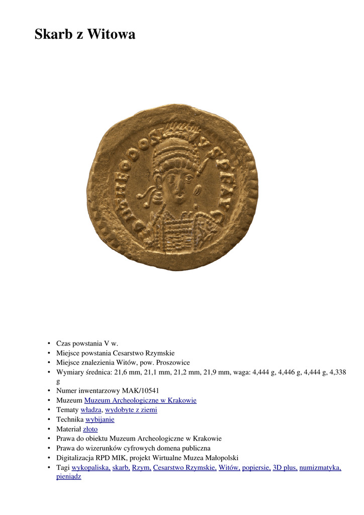 Skarb z Witowa • • • • • • • • • • • • • Czas powstania V w. Miejsce powstania Cesarstwo Rzymskie Miejsce znalezienia Witów, pow. Proszowice Wymiary średnica: 21,6 mm, 21,1 mm, 21,2 mm, 21,9 mm, waga: 4,444 g, 4,446 g, 4,444 g, 4,338 g Numer inwentarzowy MAK/10541 Muzeum Muzeum Archeologiczne w Krakowie Tematy władza, wydobyte z ziemi Technika wybijanie Materiał złoto Prawa do obiektu Muzeum Archeologiczne w Krakowie Prawa do wizerunków cyfrowych domena publiczna Digitalizacja RPD MIK, projekt Wirtualne Muzea Małopolski Tagi wykopaliska, skarb, Rzym, Cesarstwo Rzymskie, Witów, popiersie, 3D plus, numizmatyka, pieniądz Skarb czterech złotych monet rzymskich z V wieku n.e. został znaleziony w Witowie. Są to trzy solidy cesarza Teodozjusza II (402−450) i jeden solid cesarza Walentyniana II (424−455). Pierwsza grupa monet przedstawia na awersie popiersie w zbroi. Imię cesarza wypisane jest w otoku: „DN THEODOSI VS P.F. AVG”. Na rewersie przedstawiona jest siedząca bogini Roma. Waga monet jest znormalizowana (w gramach: 4,444; 4,444; 4,446). Czwarta moneta przedstawia na awersie popiersie cesarza i napis w otoku: „DN ILA VALENTINIANVS PF AVG”. Na rewersie widoczny jest cesarz stojący. Moneta jest nieco lżejsza — jej waga wynosi 4,338 g. Średnica monet zawiera się między 21 a 22 mm. Opracowanie: Muzeum Archeologiczne w Krakowie, © wszystkie prawa zastrzeżone Zobacz także inne skarby w kolekcji WMM: Skarb z Nowej Huty — Pleszowa Czara włocławska Skarb żelaznych grzywien siekieropodobnych z ul. Kanoniczej 13 w Krakowie Skarb brązowy ze Stefkowej