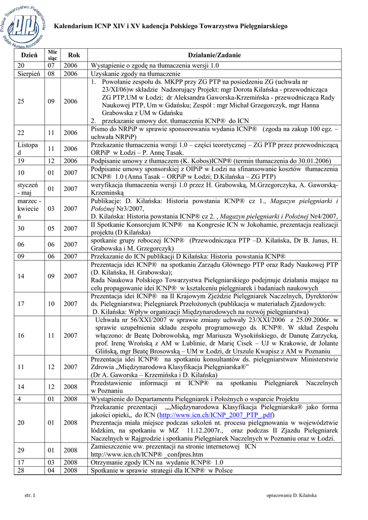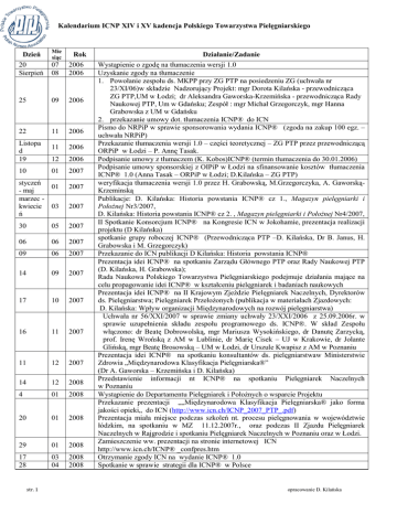 Kalendarium ICNP XIV i XV kadencja Polskiego Towarzystwa Pielęgniarskiego Dzień Mie siąc 20 Sierpień 07 08 2006 2006 25 09 2006 22 11 2006 11 2006 12 2006 01 2007 Listopa d 19 10 styczeń 01 - maj marzec kwiecie 03 ń Rok 2007 2007 30 05 2007 06 06 2007 09 06 2007 14 09 2007 17 10 2007 16 11 2007 11 12 2007 14 12 2008 4 01 2008 20 01 2008 29 01 2008 17 28 03 04 2008 2008 str. 1 Działanie/Zadanie Wystąpienie o zgodę na tłumaczenia wersji 1.0 Uzyskanie zgody na tłumaczenie 1. Powołanie zespołu ds. MKPP przy ZG PTP na posiedzeniu ZG (uchwała nr 23/XI/06)w składzie Nadzorujący Projekt: mgr Dorota Kilańska - przewodnicząca ZG PTP,UM w Łodzi; dr Aleksandra Gaworska-Krzemińska - przewodnicząca Rady Naukowej PTP, Um w Gdańsku; Zespół : mgr Michał Grzegorczyk, mgr Hanna Grabowska z UM w Gdańsku 2. przekazanie umowy dot. tłumaczenia ICNP® do ICN Pismo do NRPiP w sprawie sponsorowania wydania ICNP® (zgoda na zakup 100 egz. – uchwała NRPiP) Przekazanie tłumaczenia wersji 1.0 – części teoretycznej – ZG PTP przez przewodniczącą ORPiP w Łodzi – P. Annę Tasak. Podpisanie umowy z tłumaczem (K. Kobos)ICNP® (termin tłumaczenia do 30.01.2006) Podpisanie umowy sponsorskiej z OIPiP w Łodzi na sfinansowanie kosztów tłumaczenia ICNP® 1.0 (Anna Tasak – ORPiP w Łodzi; D.Kilańska – ZG PTP) weryfikacja tłumaczenia wersji 1.0 przez H. Grabowską, M.Grzegorczyka, A. GaworskąKrzeminską Publikacje: D. Kilańska: Historia powstania ICNP® cz 1., Magazyn pielęgniarki i Położnej Nr3/2007, D. Kilańska: Historia powstania ICNP® cz 2. , Magazyn pielęgniarki i Położnej Nr4/2007, II Spotkanie Konsorcjum ICNP® na Kongresie ICN w Jokohamie, prezentacja realizacji projektu (D Kilańska) spotkanie grupy roboczej ICNP® (Przewodnicząca PTP –D. Kilańska, Dr B. Janus, H. Grabowska i M. Grzegorczyk) Przekazanie do ICN publikacji D Kilańska: Historia powstania ICNP® Prezentacja idei ICNP® na spotkaniu Zarządu Głównego PTP oraz Rady Naukowej PTP (D. Kilańska, H. Grabowska); Rada Naukowa Polskiego Towarzystwa Pielęgniarskiego podejmuje działania mające na celu propagowanie idei ICNP® w kształceniu pielęgniarek i badaniach naukowych Prezentacja idei ICNP® na II Krajowym Zjeździe Pielęgniarek Naczelnych, Dyrektorów ds. Pielęgniarstwa; Pielęgniarek Przełożonych (publikacja w materiałach Zjazdowych: D. Kilańska: Wpływ organizacji Międzynarodowych na rozwój pielęgniarstwa) Uchwała nr 56/XXI/2007 w sprawie zmiany uchwały 23/XXI/2006 z 25.09.2006r. w sprawie uzupełnienia składu zespołu programowego ds. ICNP®. W skład Zespołu włączono: dr Beatę Dobrowolską, mgr Mariusza Wysokińskiego, dr Danutę Zarzycką, prof. Irenę Wrońską z AM w Lublinie, dr Marię Cisek – UJ w Krakowie, dr Jolante Glińską, mgr Beatę Brosowską – UM w Łodzi, dr Urszule Kwapisz z AM w Poznaniu Prezentacja idei ICNP® na spotkaniu konsultantów ds. pielęgniarstwaw Ministerstwie Zdrowia „Międzynarodowa Klasyfikacja Pielęgniarska®” (Dr A. Gaworska – Krzemińska i D. Kilańska) Przedstawienie informacji nt ICNP® na spotkaniu Pielęgniarek Naczelnych w Poznaniu Wystąpienie do Departamentu Pielęgniarek i Położnych o wsparcie Projektu Przekazanie prezentacji „„Międzynarodowa Klasyfikacja Pielęgniarska® jako forma jakości opieki„ do ICN (http://www.icn.ch/ICNP_2007_PTP_.pdf) Prezentacja miała miejsce podczas szkoleń nt. procesu pielęgnowania w województwie łódzkim, na spotkaniu w MZ 11.12.2007r., oraz podczas II Zjazdu Pielęgniarek Naczelnych w Rajgrodzie i spotkaniu Pielęgniarek Naczelnych w Poznaniu oraz w Łodzi. Zamieszczenie ww. prezentacji na stronie internetowej ICN http://www.icn.ch/ICNP® _confpres.htm Otrzymanie zgody ICN na wydanie ICNP® 1.0 Spotkanie w sprawie strategii dla ICNP® w Polsce opracowanie D. Kilańska Kalendarium ICNP XIV i XV kadencja Polskiego Towarzystwa Pielęgniarskiego styczeń - nadal 01 2008 styczeńsiepień 01 2008 04 08 2008 09 2008 09 2008 16 09 2008 21 10 2008 26nadal 10 2008 paździer nik – nadal 10 2008 wrzesie ńpaździer nik 16 str. 2 http://www.ptp.na1.pl/index.php?option=com_content&task=view&id=34&Itemid=49 Ewaluacja terminologii ICNP® (dr J. Glińska, mgr B. Brosowska, mgr M. Lewandowska - UM w Łodzi; dr M. Kisilowska - UW; dr J. Górajek-Jóźwik i dr B. Dobrowolska - AM Lublin; M. Durka; M. Grzegorczyk, H. Grabowska – AM Gdańsk) Przetłumaczenie Katalogu "Współpraca z pacjentami i ich rodzinami – w trosce o przestrzeganie zaleceń terapeutycznych" (M.Kisilowska); Ewaluacja terminologii ICNP® i Katalogu "Współpraca z pacjentami i ich rodzinami – w trosce o przestrzeganie zaleceń terapeutycznych"; podjęcie decyzji o ponownym sprawdzeniu zweryfikowanych terminów ICNP®” (B.Brosowska, M.Kisilowska) Podjęcie decyzji o organizacji Konferencji ICNP przez PTP – Uchwała 84/XIV/09 Uchwała nr 83/XIV/09 w sprawie zmiany uchwały nr23/XXl/06ZarzEdu Gl6wnego Polskiego Towarzystwa Pielęgniarskiego z dnia 25 wrze6nia 2OO6 oraz uchwały Nr 56/XXI/O7 z dnia 16 listopada 2007 r. celem uzupełnienia składu zespołu programowego do spraw Międzynarodowej Klasyfikacji Praktyki Pielęgniarskiej przy Zarządzie Głównym Polskiego Towarzystwa Pielęgniarskiego: Koordynatorzy Projektu: mgr Dorota Kilańska - przewodnicząca ZG PTP,UM w Łodzi; dr Aleksandra Gaworska-Krzemińska - przewodnicząca Rady Naukowej PTP, Um w Gdańsku Zespół programowy ds. ICNP: 1) mgr Michał Grzegorczyk, mgr Hanna Grabowska z UM w Gdańsku 1) dr Beata Dobrowolska, dr Jolanta Górajek - Jóźwik, z UM w Lublinie 2) dr Maria Cisek z UJ w Krakowie; 3) dr Jolanta Glińska, mgr Beata Brosowska, mgr Małgorzata Lewandowska z UM Łodzi 4) dr Jolanta Lewko z UM w Białymstoku 5J dr Urszula Kwapisz z UM w Poznaniu; 6) dr Małgorzata Kisilowska – z Uniwersytetu Warszawskiego Przekazanie tłumaczenia ICNP® do wydawnictwa i do ICN Przygotowanie Konferencji „Międzynarodowa Klasyfikacja Praktyki Pielęgniars