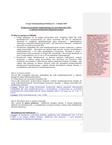 Uwagi Telekomunikacji Polskiej SA – Członka PIIT Propozycje przepisów implementujących znowelizowaną USD – w zakresie świadczenia usługi powszechnej Według następujących załoŜeń: • Usługi składające się na usługę powszechną moŜe świadczyć jeden lub wielu przedsiębiorców wyznaczonych; na całym terytorium RP lub na określonych obszarach (z wyjątkiem ogólnokrajowego spisu abonentów i ogólnokrajowej informacji o numerach telefonicznych, które – jak sama nazwa wskazuje – świadczone muszą być na całym terytorium RP); • Świadczenie udogodnień dla osób niepełnosprawnych zostanie wyłączone z zakresu usługi powszechnej – obowiązek ten spełniać będą musieli wszyscy przedsiębiorcy telekomunikacyjni, a nie tylko przedsiębiorca wyznaczony. Wymaga to zmian i przeniesienia części przepisów (w Dziale III) z Rozdziału 2 do nowego Rozdziału 1a oraz z rozporządzenia z art. 81 ust. 6 PT do odrębnego rozporządzenia; • Świadczenie usług telefonicznych za pomocą aparatów publicznych zostanie wyłączone z zakresu usługi powszechnej, lecz pozostawi się Prezesowi UKE moŜliwość rozszerzenia w trybie decyzji zakresu usługi powszechnej o tę usługę – gdy zajdzie taka potrzeba na danym obszarze kraju (po uprzednim przeprowadzeniu postępowania konsultacyjnego i analizie potrzeb mieszkańców danego obszaru, w szczególności osób starszych i niepełnosprawnych. Art. 1. 1. Ustawa określa: [Nowy] 13) wymagania dotyczące udogodnień dla osób niepełnosprawnych w zakresie dostępu do usług telekomunikacyjnych. 2. Celem ustawy jest stworzenie warunków dla: [Nowy] 6) zapewnienia uŜytkownikom będącym osobami niepełnosprawnymi dostępu do usług telekomunikacyjnych równowaŜnego poziomowi dostępu, z jakiego korzystają inni uŜytkownicy końcowi. Uwaga1: Biorąc pod uwagę konieczność rozszerzenia zakresu przepisów dotyczących udogodnień dla osób niepełnosprawnych, z przedsiębiorcy wyznaczonego na wszystkich przedsiębiorców telekomunikacyjnych, naleŜy uzupełnić zakres i cel ustawy (tj. art. 2 ust. 1 i 2 PT). Uwaga2: Treść wzorowana na art. 7 ust. 1 USD. Art. 2. Określenia uŜyte w ustawie oznaczają: [Bez zmian] 2) aparat publiczny - publicznie dostępny telefon, w którym połączenie opłacane jest automatycznie, w szczególności za pomocą monety, Ŝetonu, karty telefonicznej lub karty płatniczej; 28) publiczna sieć telefoniczna - … Uwaga1: W dyrektywie wykreślono definicję „publicznej sieci telefonicznej” (art. 2 lit b) USD), w jej miejsce dodano definicje „publicznej sieci łączności” i „sieci łączności elektronicznej” (w dyrektywie ramowej). 1 Komentarz [l1]: W załoŜeniach nie naleŜy mówić o wyłączeniu usług z zakresu usługi powszechnej, ( co byłoby niezgodne z DUP) ale o braku konieczności wyznaczania podmiotu zobowiązanego do świadczenia konkretnych usług Przyjmując filozofię DUP (art. 1) wśród celów polskich regulacji ustawowych powinien jednak znaleźć się cel „zapewnienia dostępności na terenie całego kraju publicznie dostępnych usług dobrej jakości poprzez skuteczną konkurencje i wybór, a takŜe zastosowaniem odpowiednich rozwiązań w sytuacjach , gdzie rynek nie zaspokaja w sposób zadowalający potrzeb uŜytkowników końcowych.” Przedstawiony w art. 1 ust 2 i 4 ustawy PT iŜ celem jest stworzenie warunków dla: pkt 1). wspierania równoprawnej i skutecznej konkurencji w zakresie świadczenia usług telekomunikacyjnych oraz 4) zapewnienie uŜytkownikom maksymalnych korzyści w zakresie róŜnorodności,ceny i jakości usług telekomunikacyjnych nie SA ekwiwalentem zapisu dyrektywy. Podobnie wynika z motywu 4 Dyrektywy 2009/136/WE. Uwaga2: Proponujemy wykreślić z PT definicję „publicznej sieci telefonicznej”, a w treści PT określenie „publiczna sieć telefoniczna” zastąpić określeniem „publiczna sieć telekomunikacyjna”. NaleŜy jednak pamiętać o konsekwentnym ujednoliceniu stosowanej w PT terminologii w tym zakresie. 30) publicznie dostępna usługa telefoniczna - usługę telekomunikacyjną dostępną dla ogółu uŜytkowników, w celu inicjowania i odbierania, bezpośrednio lub pośrednio, połączeń krajowych i międzynarodowych, za pomocą numeru lub numerów ustalonych w krajowym lub międzynarodowym planie numeracji telefonicznej; Uwaga1: Alternatywnie: „(…) w celu bezpośredniego lub pośredniego inicjowania i odbierania połączeń (…)”. Uwaga2: Ewentualnego doprecyzowania wymagać moŜe określenie „bezpośrednio lub pośrednio” (patrz art. 2 lit c) USD). Uwaga3: Zgodnie z dyrektywą usunięto: „(…) oraz uzyskania dostępu do słuŜb ustawowo powołanych do niesienia pomocy (…)” oraz „(…) która ponadto moŜe obejmować: a) zapewnienie pomocy konsultanta dostawcy usług przy korzystaniu z usług telekomunikacyjnych, b) uzyskanie informacji o numerach telefonicznych, c) dostęp do spisów abonentów, d) dostęp do aparatów publicznych, e) korzystanie z usług na szczególnych warunkach, f) korzystanie ze specjalnych udogodnień przez osoby niepełnosprawne, g) korzystanie z połączeń z numerami niegeograficznymi”. [Bez zmian] 22) numer geograficzny - numer ustalony w planie numeracji krajowej, w którym część ciągu cyfr zawiera wskaźnik obszaru geograficznego, wykorzystywany do kierowania połączeń do stałej lokalizacji zakończenia sieci; Uwaga: Naszym zdaniem ten przepis nie wymaga zmian – ale warto rozwaŜyć czy uŜyte w art. 2 lit. d) USD określenie „do przekierowywania wywołań tam, gdzie fizycznie mieści się punkt zakończenia sieci”, pokrywa się ze „stałą lokalizacją zakończenia sieci”. [Bez zmian] 23) numer niegeograficzny - numer ustalony w planie numeracji krajowej, który nie zawiera ciągu cyfr określającego wskaźnik obszaru geograficznego, w szczególności numer zakończenia ruchomej publicznej sieci telefonicznej, numer do którego poł