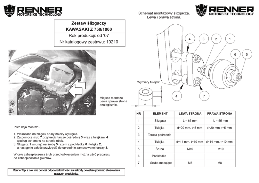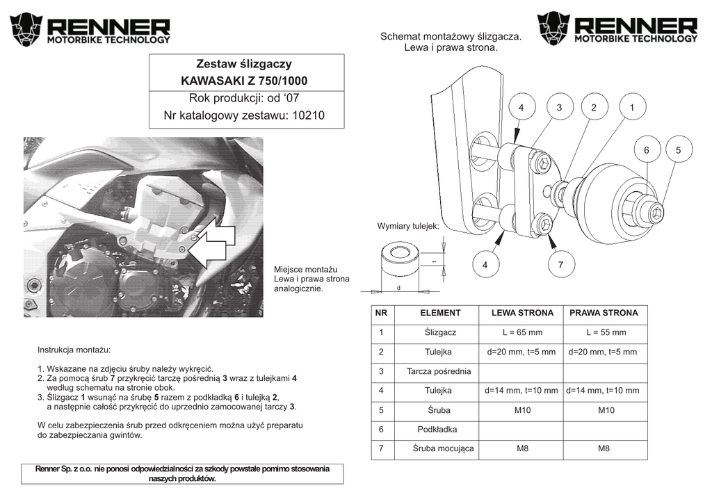 Schemat monta¿owy œlizgacza. Lewa i prawa strona. Zestaw œlizgaczy KAWASAKI Z 750/1000 Rok produkcji: od ‘07 Nr katalogowy zestawu: 10210 4 3 2 1 6 t Wymiary tulejek: Miejsce monta¿u Lewa i prawa strona analogicznie. 4 7 d NR ELEMENT LEWA STRONA PRAWA STRONA 1 Œlizgacz L = 65 mm L = 55 mm Instrukcja monta¿u: 2 Tulejka d=20 mm, t=5 mm 1. Wskazane na zdjêciu œruby nale¿y wykrêciæ. 2. Za pomoc¹ œrub 7 przykrêciæ tarczê poœredni¹ 3 wraz z tulejkami 4 wed³ug schematu na stronie obok. 3. Œlizgacz 1 wsun¹æ na œrubê 5 razem z podk³adk¹ 6 i tulejk¹ 2, a nastêpnie ca³oœæ przykrêciæ do uprzednio zamocowanej tarczy 3. 3 Tarcza poœrednia 4 Tulejka 5 Œruba W celu zabezpieczenia œrub przed odkrêceniem mo¿na u¿yæ preparatu do zabezpieczania gwintów. 6 Podk³adka 7 Renner Sp. z o.o. nie ponosi odpowiedzialnoœci za szkody powsta³e pomimo stosowania naszych produktów. Œruba mocuj¹ca d=20 mm, t=5 mm d=14 mm, t=10 mm d=14 mm, t=10 mm M10 M10 M8 M8 5