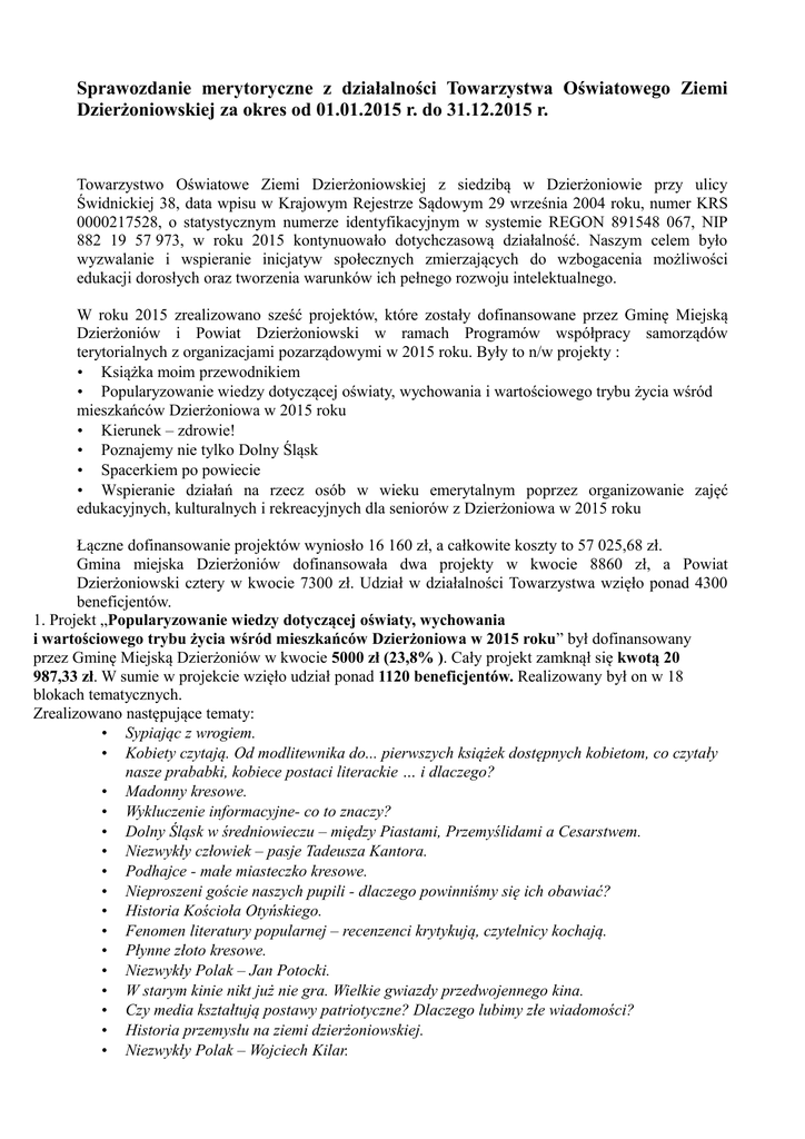 Sprawozdanie merytoryczne z działalności Towarzystwa Oświatowego Ziemi Dzierżoniowskiej za okres od 01.01.2015 r. do 31.12.2015 r. Towarzystwo Oświatowe Ziemi Dzierżoniowskiej z siedzibą w Dzierżoniowie przy ulicy Świdnickiej 38, data wpisu w Krajowym Rejestrze Sądowym 29 września 2004 roku, numer KRS 0000217528, o statystycznym numerze identyfikacyjnym w systemie REGON 891548 067, NIP 882 19 57 973, w roku 2015 kontynuowało dotychczasową działalność. Naszym celem było wyzwalanie i wspieranie inicjatyw społecznych zmierzających do wzbogacenia możliwości edukacji dorosłych oraz tworzenia warunków ich pełnego rozwoju intelektualnego. W roku 2015 zrealizowano sześć projektów, które zostały dofinansowane przez Gminę Miejską Dzierżoniów i Powiat Dzierżoniowski w ramach Programów współpracy samorządów terytorialnych z organizacjami pozarządowymi w 2015 roku. Były to n/w projekty : • Książka moim przewodnikiem • Popularyzowanie wiedzy dotyczącej oświaty, wychowania i wartościowego trybu życia wśród mieszkańców Dzierżoniowa w 2015 roku • Kierunek – zdrowie! • Poznajemy nie tylko Dolny Śląsk • Spacerkiem po powiecie • Wspieranie działań na rzecz osób w wieku emerytalnym poprzez organizowanie zajęć edukacyjnych, kulturalnych i rekreacyjnych dla seniorów z Dzierżoniowa w 2015 roku Łączne dofinansowanie projektów wyniosło 16 160 zł, a całkowite koszty to 57 025,68 zł. Gmina miejska Dzierżoniów dofinansowała dwa projekty w kwocie 8860 zł, a Powiat Dzierżoniowski cztery w kwocie 7300 zł. Udział w działalności Towarzystwa wzięło ponad 4300 beneficjentów. 1. Projekt „Popularyzowanie wiedzy dotyczącej oświaty, wychowania i wartościowego trybu życia wśród mieszkańców Dzierżoniowa w 2015 roku” był dofinansowany przez Gminę Miejską Dzierżoniów w kwocie 5000 zł (23,8% ). Cały projekt zamknął się kwotą 20 987,33 zł. W sumie w projekcie wzięło udział ponad 1120 beneficjentów. Realizowany był on w 18 blokach tematycznych. Zrealizowano następujące tematy: • Sypiając z wrogiem. • Kobiety czytają. Od modlitewnika do... pierwszych książek dostępnych kobietom, co czytały nasze prababki, kobiece postaci literackie … i dlaczego? • Madonny kresowe. • Wykluczenie informacyjne- co to znaczy? • Dolny Śląsk w średniowieczu – między Piastami, Przemyślidami a Cesarstwem. • Niezwykły człowiek – pasje Tadeusza Kantora. • Podhajce - małe miasteczko kresowe. • Nieproszeni goście naszych pupili - dlaczego powinniśmy się ich obawiać? • Historia Kościoła Otyńskiego. • Fenomen literatury popularnej – recenzenci krytykują, czytelnicy kochają. • Płynne złoto kresowe. • Niezwykły Polak – Jan Potocki. • W starym kinie nikt już nie gra. Wielkie gwiazdy przedwojennego kina. • Czy media kształtują postawy patriotyczne? Dlaczego lubimy złe wiadomości? • Historia przemysłu na ziemi dzierżoniowskiej. • Niezwykły Polak – Wojciech Kilar. • • Laureaci i nominowani do nagrody Nike w 2015 roku. Życie i twórczość Jana Długosza. Tematy przygotowali i przedstawili: Jolanta Maniecka, Barbara Rymarska, Krystyna Czekaj, dr Anna Grużlewska, Janusz Maniecki, Krystyna Pawełek, Gabriel Oracz, Izabela Mizera, Helena Chojnacka-Małecka, Barbara Lemańska, Janina Weretka-Piechowiak, Edward Bień, dr Beata Hebzda-Sołogub, Tomasz Kuriata, dr Rafał Brzeziński, Zofia Mirek. W ramach projektu zobaczyliśmy spektakle operowe: Falstaff, Latający Holender, Łucja z Lammermooru oraz wysłuchaliśmy koncertu muzycznego w Narodowym Forum Muzyki. 2. Projekt: Wspieranie działań na rzecz osób w wieku emerytalnym poprzez organizowanie zajęć edukacyjnych, kulturalnych i rekreacyjnych dla seniorów z Dzierżoniowa w 2015 roku dofinansowany był w kwocie 3860 zł. Ogólny koszt projektu zamknął się kwotą 6250 zł. Wzięło w nim udział ponad 280 beneficjentów. W ramach projektu zorganizowaliśmy wyjazdy do: Lubiąża, Krzeszowa, Kamieńca Ząbkowickiego, do Muzeum Narodowego we Wrocławiu, w których mieliśmy lekcje muzealne: „Arcydzieła sztuki japońskiej w kolekcjach polskich”, „Kody pamięci. Ikonografia Śląska w grafice i rysunku od XVIII do początku XX wieku” oraz zwiedziliśmy Muzeum Poczty i Telekomunikacji z przewodnikami. We współpracy z Miejsko-Powiatową Biblioteką Publiczną zorganizowaliśmy wykład dr Małgorzaty Różewicz pt. „Dolny Śląsk – spóźniona miłość Tadeusza Różewicza”. Projekt Książka moim przewodnikiem dofinansowany był przez Powiat Dzierżoniowski w kwocie 2900 zł. Ogólny koszt projektu zamknął się kwotą 10 377,81 zł. Realizowany był w partnerstwie z Miejsko-Powiatową Biblioteką Publiczną im. Krzysztofa Kamila Baczyńskiego w Dzierżoniowie, Rynek 2. Biblioteka użyczała pomieszczeń i gościnnie przyjmowała nas w dwa czwartki miesiąca. W projekcie wzięło udział ponad 1060 beneficjentów. W sumie zorganizowano 22 spotkania, w tym dwa spotkania autorskie z lokalnymi twórcami: Krystyną Patrzykąt i Zygmuntem Iwaszkiewiczem oraz tematyczne: • • • • • • • • • • • • • • • • • • • • Zabytki w kraju fado i porto. Niezwykły człowiek- pasje Waldemara Łysiaka. Historia i muzyka. Architektura – na przestrzeni wieków – Muzeum Architektury lekcja muzealna we Wrocławiu. Kobiety w sagach skandynawskich. Niemiecki romatyzm w poezji i w muzyce. Awantura o Konopnicką. Poezja między piosenką a modlitwą. Jak patrzeć na obraz. Pomniki na chwałę i dla uciechy. Klimaty greckie w literaturze. Udręka i miłość – życie Lwa Tołstoja. Jak literatura bawi się literaturą, pastisz, parodia, trawestacja. Och!Machu Picchu i inne atrakcje Peru. Jaskinia zapomnianych snów. Człowiek wobec mitów. Psy szczekają , karawana idzie …., a my się śmiejemy. O tym, co śmieszyło lub śmieszy. „Kochałam cię zawsze i kocham...”- niezwykła bi