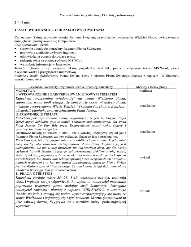 Konspekt katechezy dla klasy VI szkoły podstawowej 2 * 45 min TEMAT: WIELKANOC – CUD ZMARTWYCHWSTANIA Cel ogólny: Zainteresowanie ucznia Pismem Świętym, przybliżenie wydarzenia Wielkiej Nocy, wykorzystanie umiejętności posługiwania się komputerem. Cele operacyjne: Uczeń: • sprawnie odnajduje potrzebny fragment Pisma Świętego; • poprawnie analizuje wybrany fragment; • odpowiada na pytania dotyczące tekstu; • redaguje tekst za pomocą edytora MS Word; • wyszukuje informacje w Internecie. Metody i formy pracy: czytanie tekstu, pogadanka, test luk, praca z edytorem tekstu MS Word, praca z wyszukiwarką i przeglądarką internetową. Pomoce i środki dydaktyczne: Pismo Święte, karty z tekstem Pisma Świętego, plansza z napisem „Wielkanoc”, mazaki, komputery. Czynności katechety, czynności ucznia, przebieg katechezy MODLITWA I. WPROWADZENIE I ZAINTERESOWANIE NOWYM TEMATEM Katecheta przypomina wiadomości na temat Wielkiego Postu, zapowiada temat podkreślając, że kończy się okres Wielkiego Postu, niedługo rozpoczniemy Wielki Tydzień i Triduum Paschalne. Będziemy obchodzić pamiątkę zmartwychwstania Pana Jezusa. II. ROZWINIĘCIE TEMATU Katecheta pokazuje uczniom Biblię, wyjaśniając, że jest to Księga, dzięki której mamy dokładny opis ostatnich i zarazem najważniejszych, dni życia Pana Jezusa. To Pan Bóg przez Ewangelistów opisał mękę, śmierć i zmartwychwstanie Swego Syna. Uczniowie mówią co wiedzą o Biblii, czy z własnej inicjatywy czytali jakiś fragment Pisma Świętego, czy jest ciekawa, dlaczego jest potrzebna, itp. Katecheta wyjaśnia, że zrozumienie treści biblijnych jest trudne. Trzeba mieć dużą wiedzę, aby właściwie zinterpretować słowa Biblii. Czytanie jej jest niepopularne, nie ma w niej ilustracji, nie ma wartkiej akcji, ale dla osoby ciekawej historii świata i szczerze zainteresowanej źródłem swojej wiary, staje się lekturą pasjonującą, bo to dzięki niej wiemy o wydarzeniach sprzed dwóch tysięcy lat. Mamy tam relację spisaną przez bezpośrednich świadków tamtych wydarzeń i to jest poważnym argumentem, dlaczego Pismo Święte jest wyróżnione spośród innych ksiąg. Te natchnione księgi dają nam obraz wydarzeń trzeciego dnia po śmierci Jezusa. 1. PRACA Z TEKSTEM Katecheta rozdaje teksty Mt 28, 1-15, uczniowie czytają, analizują tekst, i wpisują swoje odpowiedzi. Po wpisaniu, nauczyciel prezentuje poprawnie wykonane prace dodając swój komentarz. Następnie nauczyciel zawiesza planszę z napisem WIELKANOC, a uczniowie (każdy, po kolei) starają się podać wyraz rozpoczynający się literą ze słowa Wielkanoc i kojarzący się z tym tematem. Można potraktować to jako zabawę słowną. Wygrywa ten z uczniów, który poda najwięcej wyrazów. Metody i formy pracy modlitwa pogadanka pogadanka wykład test luk 2. POCZTÓWKA ŚWIĄTECZNA Zadanie polega na wykonaniu na komputerze pocztówki świątecznej. Nauczyciel przedstawia przykładową pocztówkę i daje ogólne wskazówki na temat wielkości strony, formatowania tekstu, rodzaju i rozmiaru czcionki, zasady rozmieszczania tekstu, możliwości wykorzystania narzędzia WordArt dla uzyskania ozdobnego tytułu, sposobu ozdobienia pocztówki rysunkiem i ozdobną ramką. Uczniowie realizują projekt pocztówki według własnego pomysłu. Gotowe prace są zapisywane w katalogach uczniów i drukowane. Wydrukowane pocztówki możemy umieścić na wystawie uczniowskich projektów. 3. SZUKAMY INFORMACJI O WIELKANOCNYM ŚWIĘCIE Za pomocą przeglądarki internetowej uczniowie wyszukują informacje na temat Świąt Wielkanocnych (np. Od kiedy obchodzimy to święto? Jak wyglądają zwyczaje świąteczne w różnych krajach? Jak obchodzono święta w przeszłości? Skąd się wziął zwyczaj święcenia pokarmu? itp.). Znalezione informacje (teksty, rysunki, zdjęcia) uczniowie zapisują w swoich katalogach. Po skończonej pracy dzielą się zdobytą wiedzą - odczytują informacje i prezentują ilustracje, które znaleźli w Internecie. IV. PODSUMOWANIE PROWADZĄCEGO Katecheta podkreśla jak ważnym jest dzień zmartwychwstania Pana Jezusa. Przypomina, że każda niedziela jest pamiątką tego wydarzenia i dlatego mamy obowiązek uczestniczenia w Eucharystii. MODLITWA praca z edytorem tekstu wyszukiwanie informacji za pomocą przeglądarki i wyszukiwarki internetowej modlitwa Ewangelia wg św. Mateusza (Mt 28, 1-15) Pusty grób Po upływie szabatu, o świcie pierwszego dnia tygodnia przyszła Maria Magdalena i druga Maria obejrzeć grób. A oto powstało wielkie trzęsienie ziemi. Albowiem anioł Pański zstąpił z nieba, podszedł, odsunął kamień i usiadł na nim. Postać jego jaśniała jak błyskawica, a szaty jego białe jak śnieg. Ze strachu przed nim zadrżeli strażnicy i stali się jakby umarli. Anioł zaś przemówił do niewiast: „Wy się nie bójcie! Bo wiem, że szukacie Jezusa Ukrzyżowanego. Nie ma Go tu, bo zmartwychwstał, jak powiedział. Chodźcie, zobaczcie miejsce, gdzie leżał. A idźcie szybko i powiedzcie Jego uczniom: Powstał z martwych i oto udaje się przed wami do Galilei. Tam Go ujrzycie. Oto, co wam powiedziałem” Pospiesznie więc oddaliły się do grobu z bojaźnią i wielką radością i biegły oznajmić to Jego uczniom. Jezus ukazuje się niewiastom A oto Jezus stanął przed nimi i rzekł: „Witajcie”. One zbliżyły się do Niego, objęły Go za nogi i oddały Mu pokłon. A Jezus rzekł do nich: „Nie bójcie się. Idźcie i oznajmijcie moim braciom: niech idą do Galilei, tam Mnie zobaczą”. Kto i kiedy przyszedł obejrzeć grób? ...................................................................................................................... Kto przemówił do niewiast? ...................................................................................................................... Co oznajmił Anioł niewiastom? .....................................................................