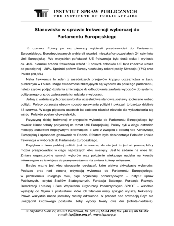 Stanowisko w sprawie frekwencji wyborczej do Parlamentu Europejskiego 13 czerwca Polacy po raz pierwszy wybierali przedstawicieli do Parlamentu Europejskiego. Eurodeputowanych wybierali również mieszkańcy pozostałych 24 członków Unii Europejskiej. We wszystkich państwach UE frekwencja była dość niska i wyniosła ok. 45%, niemniej średnia frekwencja wśród 10 nowych członków UE była znacznie niższa od przeciętnej – 28%. Spośród państw Europy niechlubny rekord pobiły Słowacja (17%) oraz Polska (20,8%). Niska frekwencja to jeden z zasadniczych przejawów kryzysu uczestnictwa w życiu publicznym w Polsce. Mając świadomość zbliżających się wyborów do polskiego parlamentu, należy szybko podjąć działania zmierzające do odbudowania zaufania wyborców do systemu politycznego oraz do zwiększenia ich udziału w wyborach. Jedną z ważniejszych przyczyn braku uczestnictwa stanowią postawy społeczne wobec polityki. Polacy odrzucają obecny sposób uprawiania polityki i pokazali to bardzo dobitnie 13 czerwca. W ciągu piętnastu ostatnich lat zrobiono również niewiele dla wykształcenia się wśród Polaków postaw obywatelskich. Przyczyną niskiej frekwencji w przypadku wyborów do Parlamentu Europejskiego był również klimat debaty politycznej na temat Unii Europejskiej. Polacy byli w ciągu ostatnich miesięcy atakowani negatywnymi informacjami o Unii w związku z debatą nad Konstytucją Europejską i sposobem głosowania w Radzie. Efektem była dezorientacja Polaków i niska frekwencja w wyborach do Parlamentu Europejskiego. Dogłębna zmiana polskiej polityki jest konieczna, ale nie jest to jednak proces, który można przeprowadzić w ciągu najbliższych kilku miesięcy. Jest to zadanie na wiele lat. Zmiany organizacyjne samych wyborów oraz położenie większego nacisku na kwestie informacyjne są łatwiejsze do przeprowadzenia niż zmiana kultury politycznej. Bardzo ważne jest więc stworzenie rozwiązań, które ułatwią aktywizację wyborców. Podczas prac nad obecną ordynacją wyborczą do Parlamentu Europejskiego, w październiku ubiegłego roku, pięć organizacji pozarządowych – Instytut Spraw Publicznych, Instytut Studiów Strategicznych, Fundacja Batorego, Fundacja Rozwoju Demokracji Lokalnej i Sieć Wspierania Organizacji Pozarządowych SPLOT – wspólnie wystąpiły do Sejmu z postulatami, które ich zdaniem miały sprzyjać wyższej frekwencji. Prawie wszystkie nasze postulaty zostały odrzucone. W pracach nad ordynacją Sejm nie uwzględnił kluczowego postulatu, żeby wybory trwały dwa dni (sobota-niedziela). _________________________________________________________________ ul. Szpitalna 5 lok.22, 00-031 Warszawa, tel. (48 22) 55 64 260, fax. (48 22) 55 64 262 e-mail: [email protected] , www.isp.org.pl Rozwiązanie to sprawdziło się w przypadku referendum akcesyjnego i obecnie nie powinno było już budzić takich oporów jak wcześniej. Parlament nie zatwierdził też propozycji głosowania pocztą oraz kilku innych zapisów. W ordynacji zabrakło także miejsca dla działań mających na celu zwiększenie poinformowania społeczeństwa o znaczeniu, kompetencjach i funkcjonowaniu Parlamentu Europejskiego, jako zadaniu wykraczającym poza cele uczestników samej kampanii wyborczej. Proponowaliśmy między innymi wyciągnięcie wniosków z kampanii referendalnej i umieszczenie w ordynacji nakazu przeprowadzenia kampanii informacyjnej w mediach, w której mogą wziąć udział podmioty nie uczestniczące w wyborach. Proponowaliśmy również zmiany o charakterze programowym wykorzystywane w mediach. Zawiódł sposób informowania o wyborach oraz ich przedmiocie. Kampanii informacyjnej przed wyborami do Parlamentu Europejskiego praktycznie nie było. Administracja centralna, w szczególności UKIE, nie wykazało się w tym zakresie inicjatywą. Biuro Informacyjne Parlamentu Europejskiego też okazało się niezdolne zarówno do poinformowania Polaków o wyborach do Parlamentu, jak również o roli PE w Unii Europejskiej. Również bloki wyborcze prezentowane w telewizji publicznej nie spełniły swojej roli. W bardzo wielu miejscach nie było informacji o położeniu najbliższej komisji obwodowej. Skutkiem tego przeciętny wyborca nie wiedział dlaczego ma wybierać posłów do PE, co oni mogą zrobić dla niego oraz jaka jest rola Parlamentu Europejskiego i czym on się różni np. od Komisji Europejskiej. Nie wiedział również jak, gdzie, kiedy i w jakich godzinach może głosować. Ordynacja wyborcza powinna w jasny sposób pokazywać wyborcy jak jego głos przekłada się na poszczególnych kandydatów i partie. Ordynacja zastosowana podczas wyborów do Parlamentu Europejskiego była niejasna nawet dla osób bezpośrednio zajmujących się polityką. Co prawda wprowadzono mechanizmy promujące wyższą frekwencję w poszczególnych okręgach wyborczych, jednak informacja jak działa ten system była nieobecna, przez co wyborcy albo nie wiedzieli, albo nie rozumieli zmian. A różne rozwiązania zawarte w ordynacji można było wykorzystać dla promocji frekwencji. Jest wysoce prawdopodobne, iż w tym roku czekają nas kolejne wybory. Powinno się podjąć zdecydowane działania zmierzające do zwiększenia udziału społeczeństwa. Należy: 9 Utworzyć Komisję Elektoralną na wzór brytyjskiej Electoral Commission, której celem byłyby prace analityczne, modernizacja procesu wyborczego oraz promocja postaw obywatelskich. Zadanie to wykracza poza obowiązki Państwowej Komisji Wyborczej. 9 Wprowadzić głosowanie dwu- lub półtoradniowe. W Polsce głosowanie dwudniowe miało miejsce podczas referendum akcesyjnego; w kilku krajach UE (Czechy, Włochy) dłuższe głosowanie zastosowano również podczas wyborów do _________________________________________________________________ ul. Szpitalna 5 lok.22, 00-031 Warszawa, tel. (48 22) 55 64 260, fax. (48 22) 55 64 262 e-mail: [email protected] , www.isp.org.pl Parlamentu E